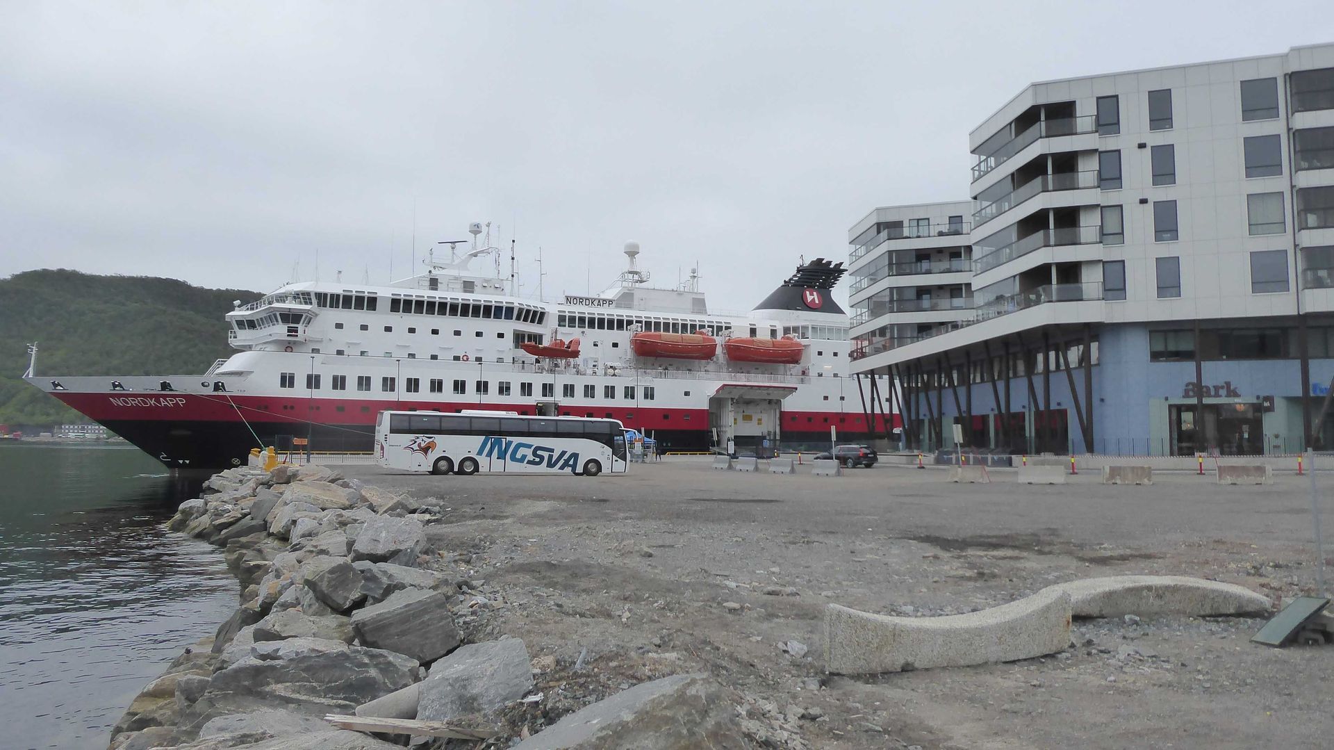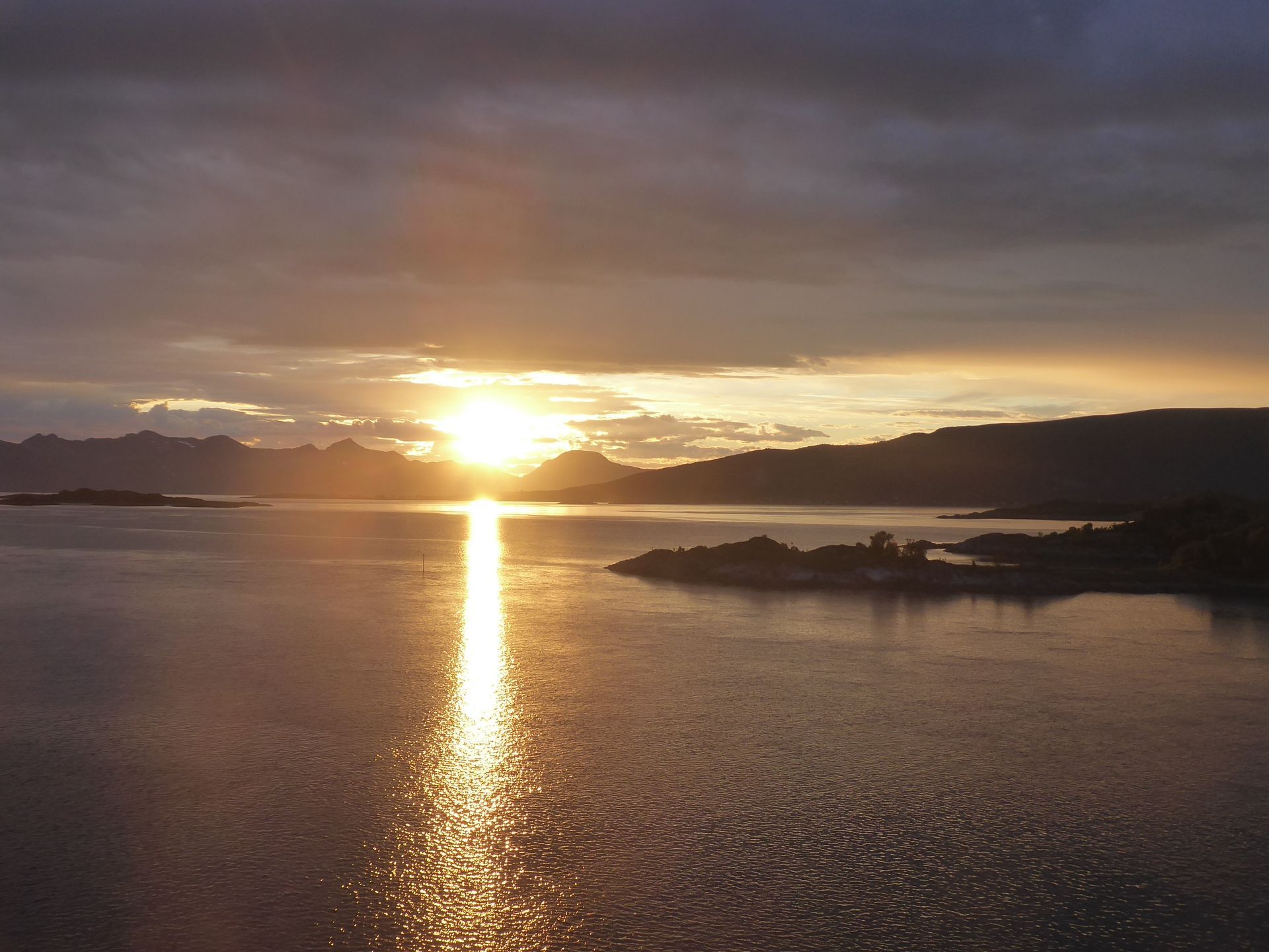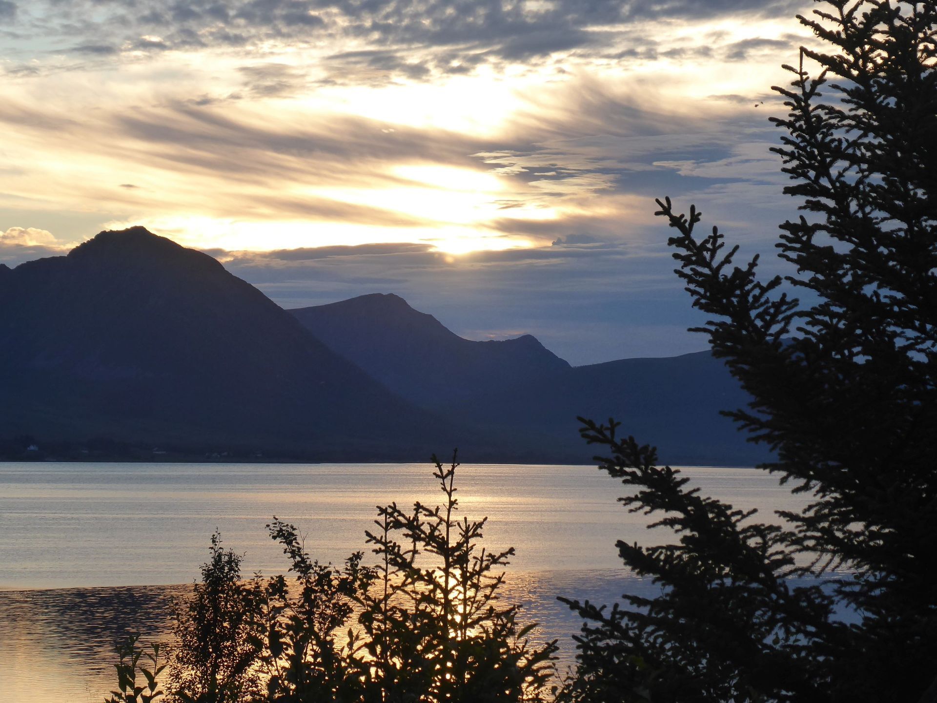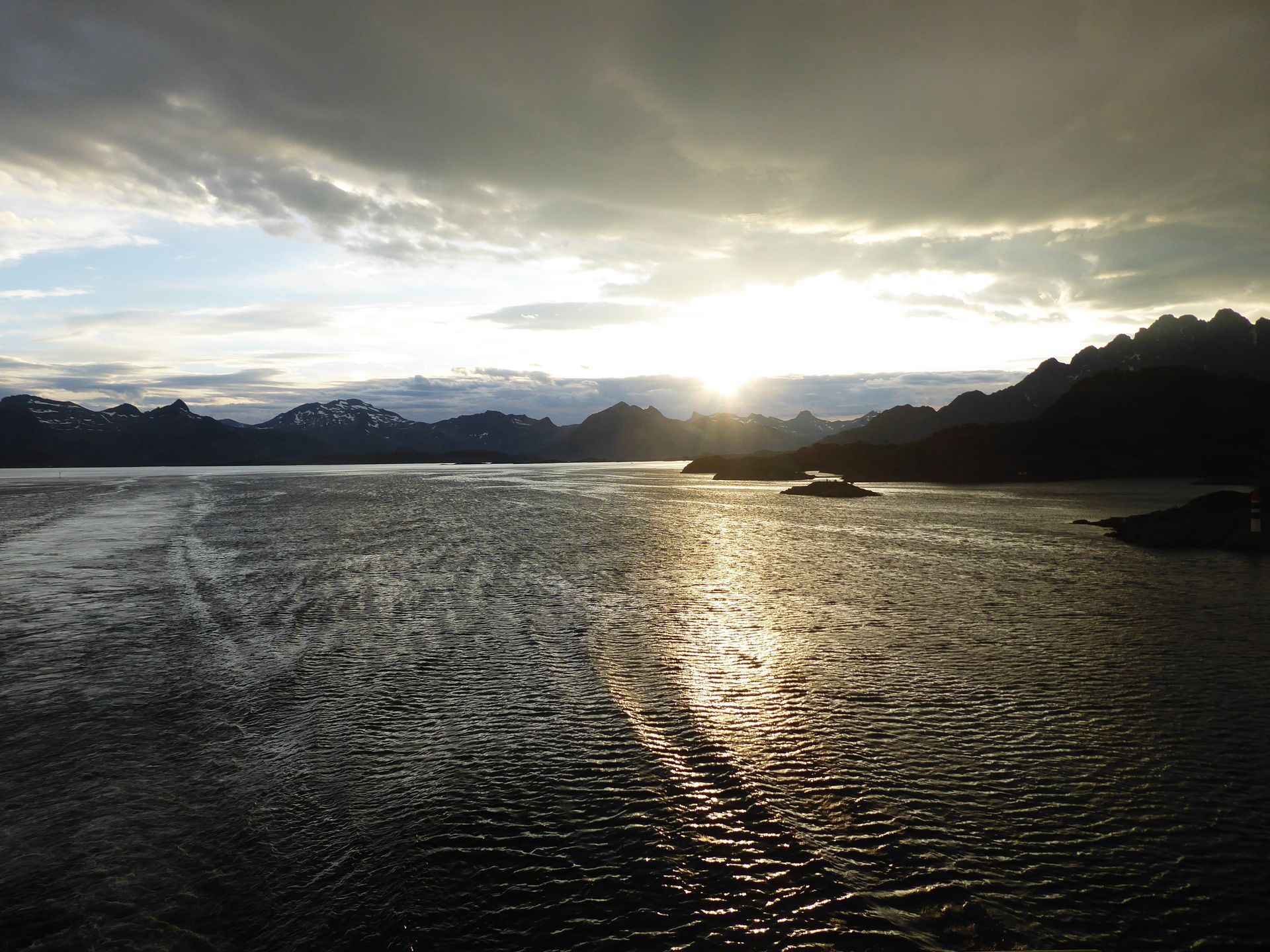 In Harstad stellen wir uns an den Hafen, erste Reihe. Von der Touristinfo erhalten wir gute Tipps. Leider können wir die Adolf-Kanonen nicht sehen, das Rohr hat 400 mm Durchmesser, vgl. Schweizer Panzer Haubitzen haben einen Durchmesser von 155 mm. Der Grund ist ein Kreuzfahrtschiff, das am andern Tag ankommt. Dafür rät sie uns im Bark am Hafen zu essen und das ist echt ausgezeichnet. Wir wollen auch die Mitternachtssonne sehen, aber leider ist sie gerade hinter einem Hügel verschwunden.