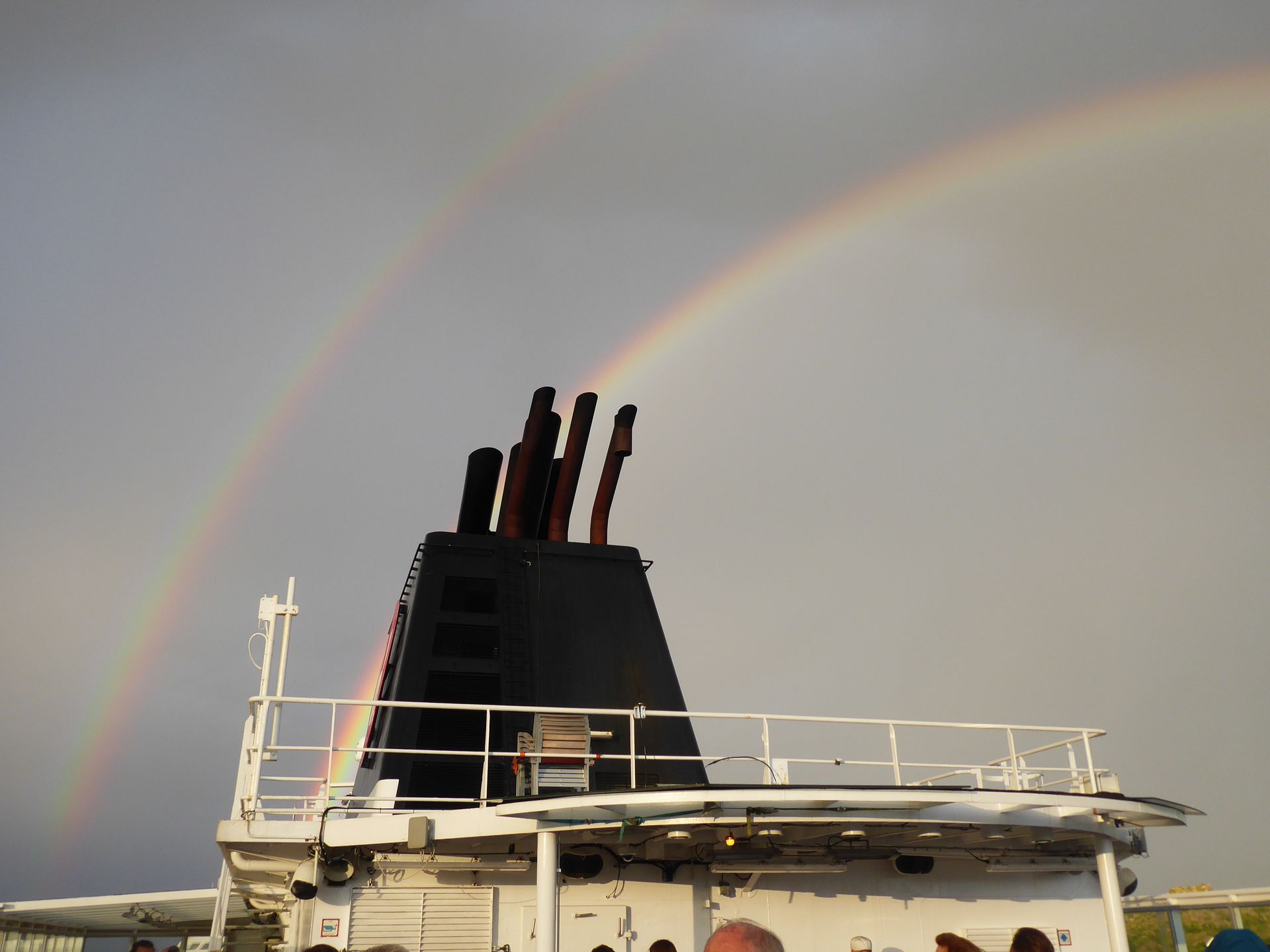 In Svolvaer haben wir drei Stunden Aufenthalt. Wir haben saumässig Hunger und finden ein mässiges Essen. Wir unterhalten uns zu viert sehr angeregt. Um 22.15 Uhr fährt Kong Harald wieder zurück. Ein kurzer Regen und ein doppelter Regenbogen, das Naturschauspiel hält uns in Atem. Wir sind aber schon etwas müde und setzen uns in die Panoramabar. Kong Harald ist etwas länger, darum dreht er wohl nur eine Runde im Trollfjord. Den Abschluss dieses Erlebnisrausches kredenzt die Mitternachtssonne mit ihrem Lichterspiel. Um 2.00 Uhr sind wir wieder beim Bänz, glücklich und ganz erfüllt von dieser spontanen und aussergewöhnlichen Reise.