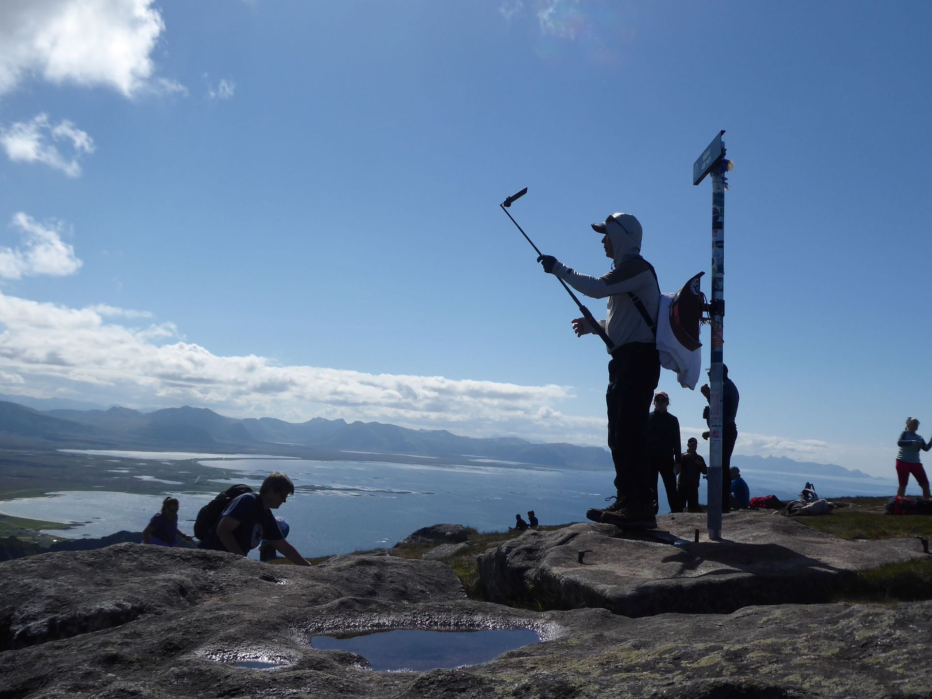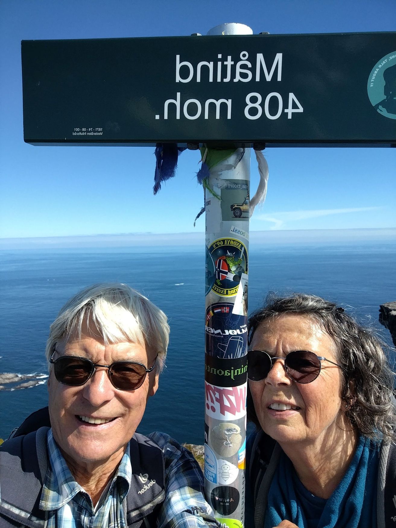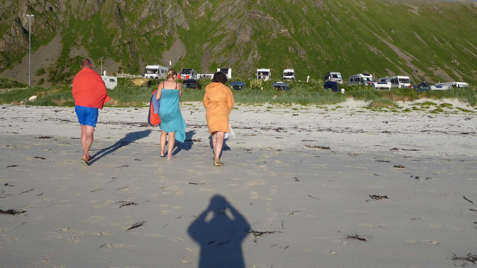 Am Samstag, 22. Juni zeigt sich die Sonne wieder und vertreibt die Wolken. Also auf zu einem neuen Höhepunkt. Unsere österreichischen Nachbarn, Petra und Günter, steigen auch auf den Matind 408 müM und versprechen Hans ein Bier. Vom Parkplatz steigen wir zuerst sehr steil über Geröll auf und überqueren eine Hochebene, dann kommen wir über einen kleinen Aufschwung zum Gipfel. Da ist ganz schön etwas los. Japaner fotografieren in allen Stellungen, fünf Frauen poltern. Günter bringt tatsächlich das Bier hervor und dann noch die kleinste Bialetti und Kaffee - also der reinste Genuss. In dieser Begeisterung planen wir ein Mitternachtsbad im Nordmeer. Da bin ich auch dabei.