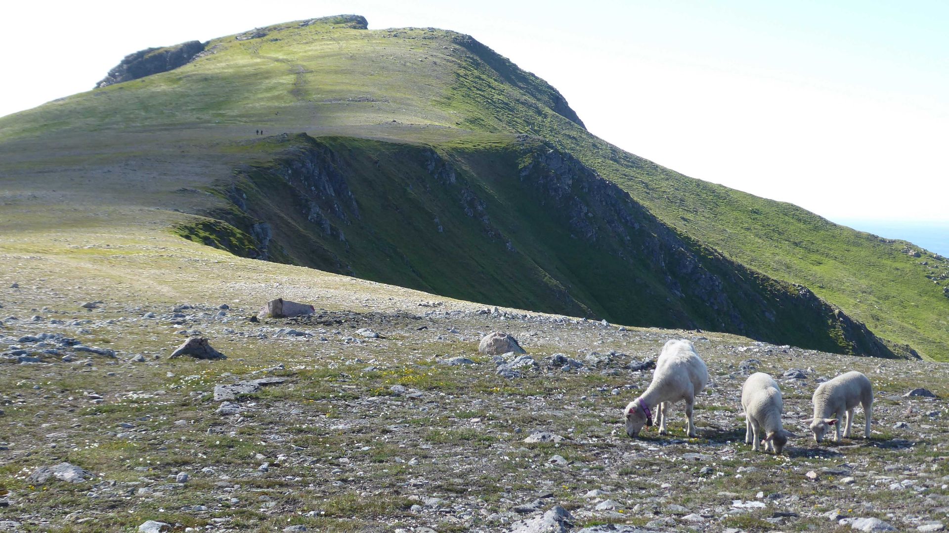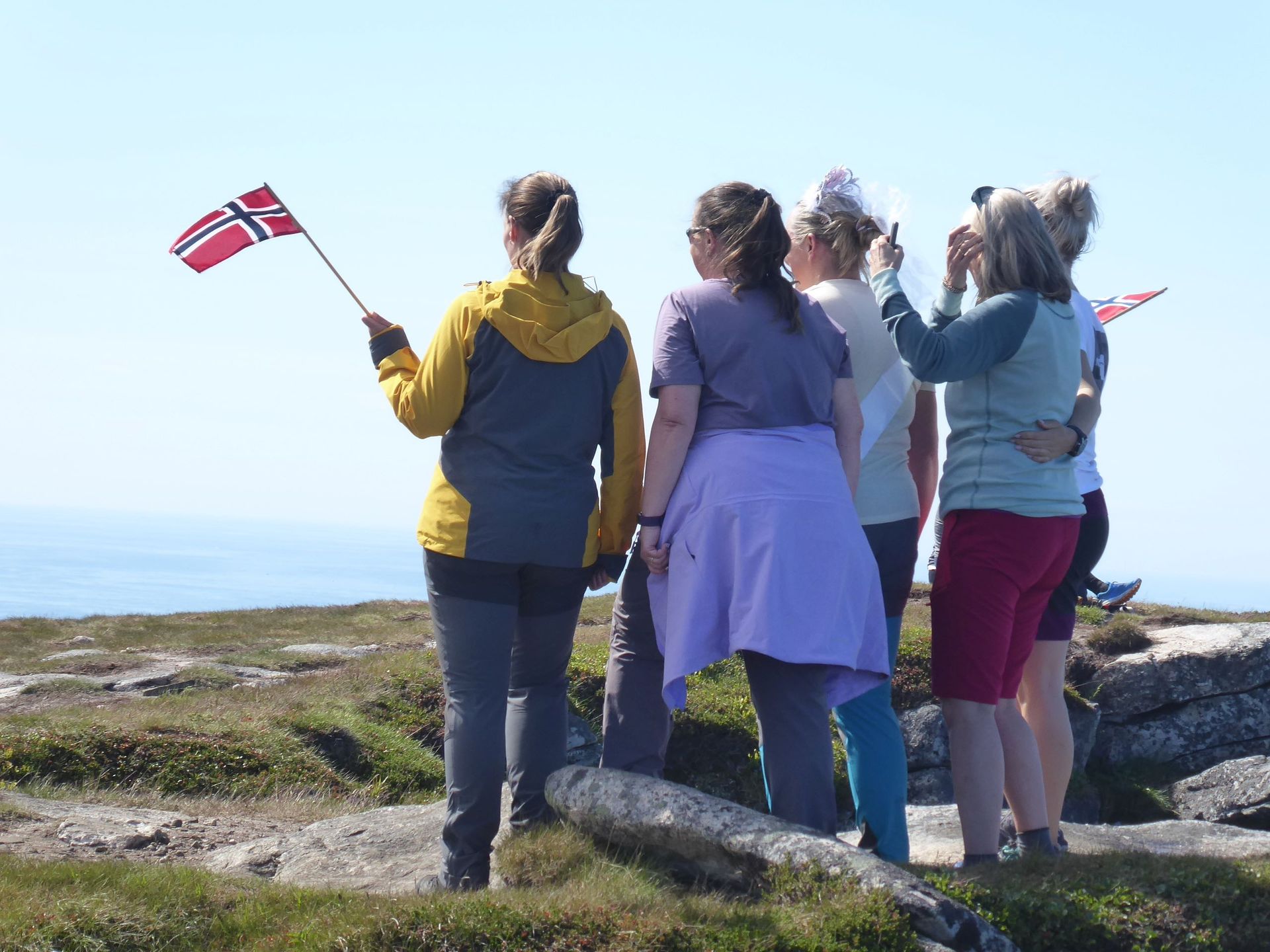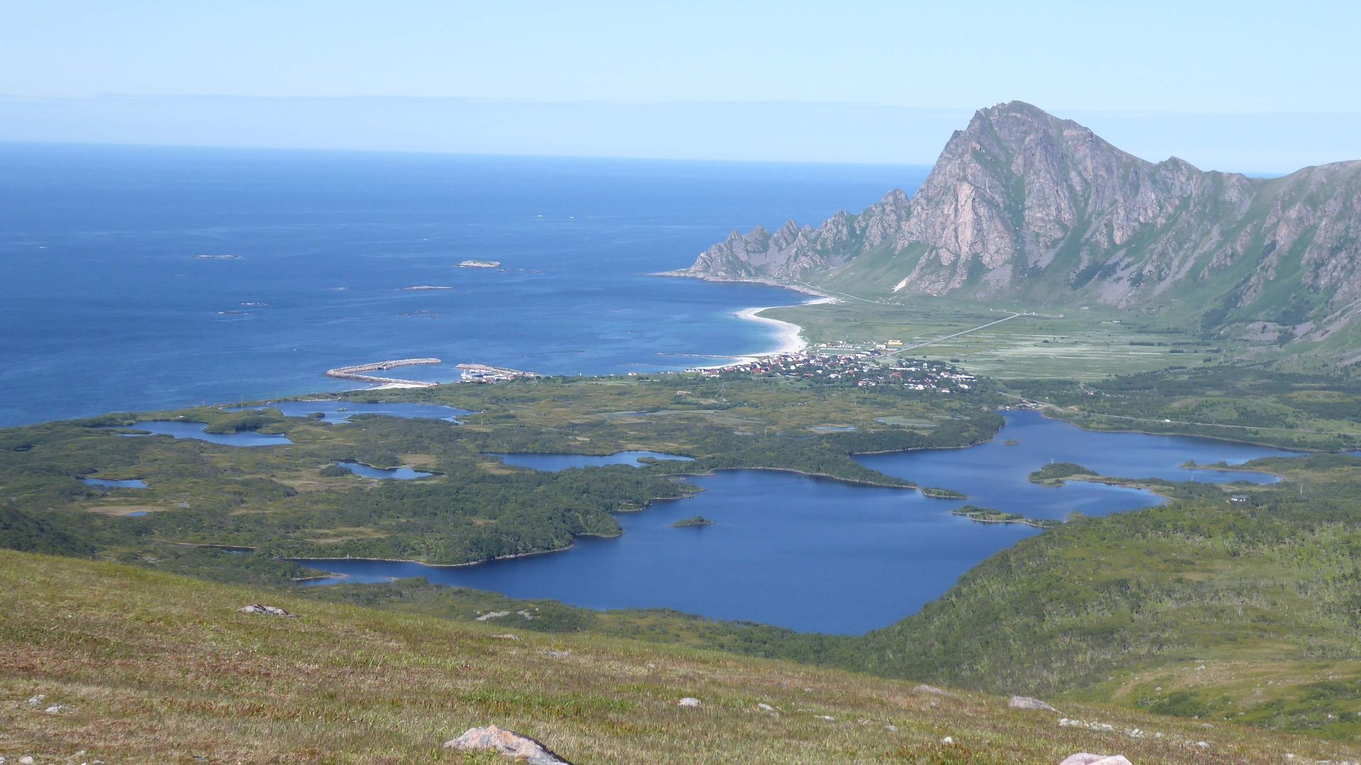 Am Samstag, 22. Juni zeigt sich die Sonne wieder und vertreibt die Wolken. Also auf zu einem neuen Höhepunkt. Unsere österreichischen Nachbarn, Petra und Günter, steigen auch auf den Matind 408 müM und versprechen Hans ein Bier. Vom Parkplatz steigen wir zuerst sehr steil über Geröll auf und überqueren eine Hochebene, dann kommen wir über einen kleinen Aufschwung zum Gipfel. Da ist ganz schön etwas los. Japaner fotografieren in allen Stellungen, fünf Frauen poltern. Günter bringt tatsächlich das Bier hervor und dann noch die kleinste Bialetti und Kaffee - also der reinste Genuss. In dieser Begeisterung planen wir ein Mitternachtsbad im Nordmeer. Da bin ich auch dabei.