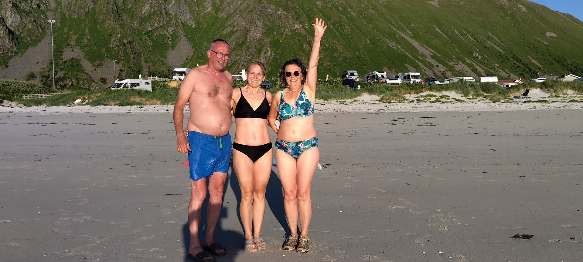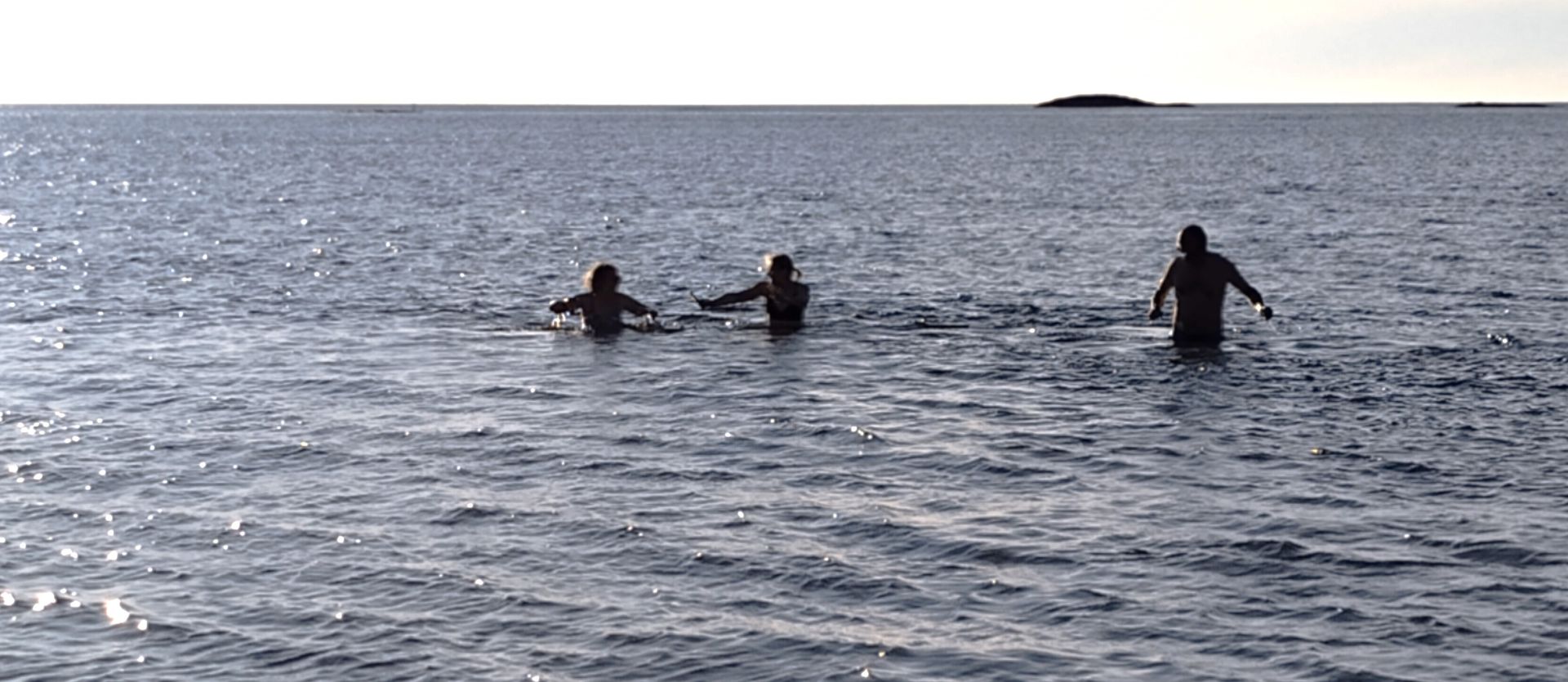 Allerdings hüpfen wir schon um 21 Uhr ins kalte Wasser, wir sind einfach zu müde um bis um Mitternacht zu warten. Das Wasser ist erfrischende 11 Grad. Hans filmt und fotografiert. Für die Mitternachtsonne stellen wir den Wecker.