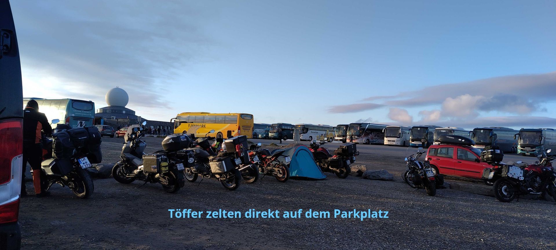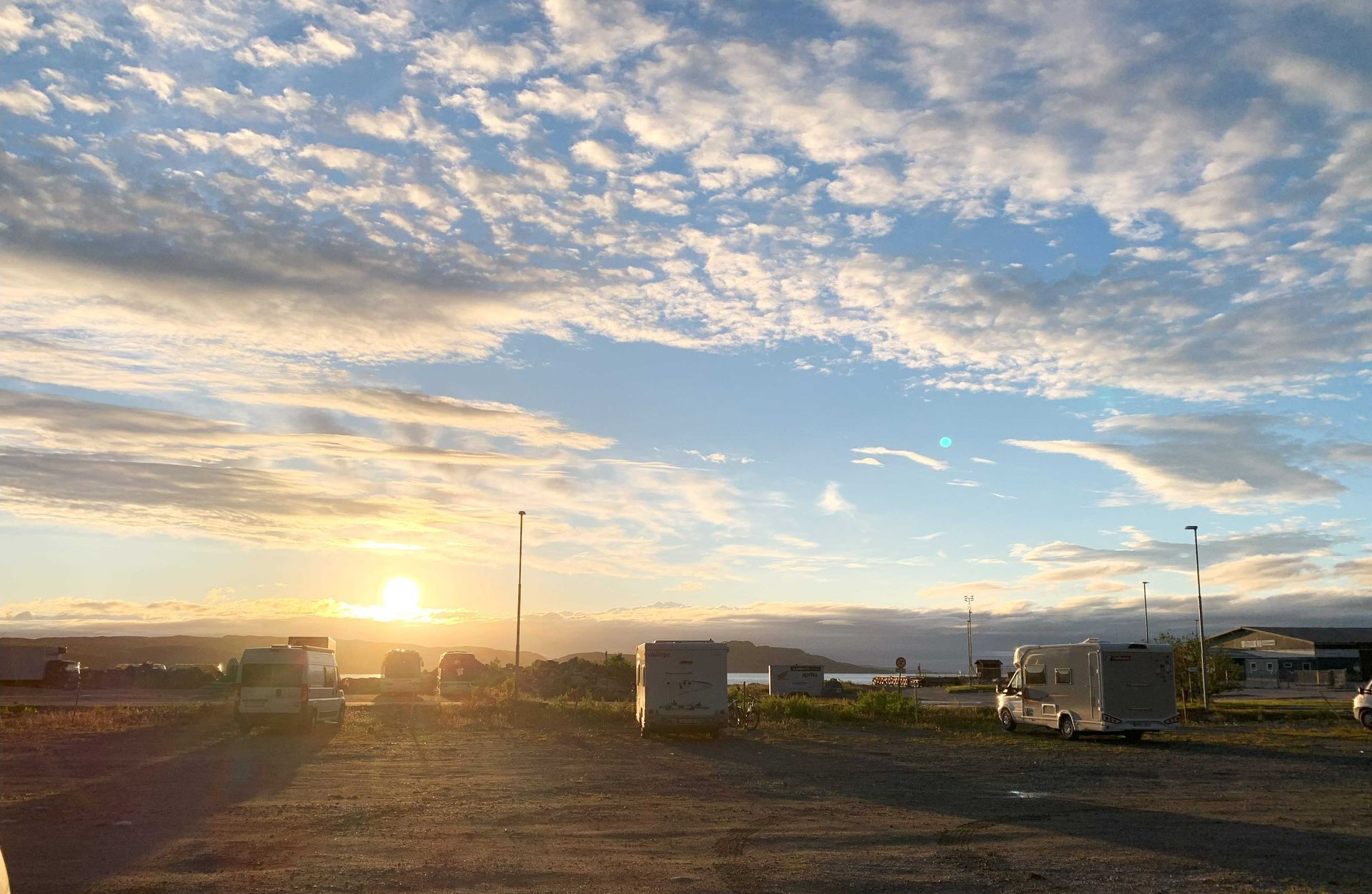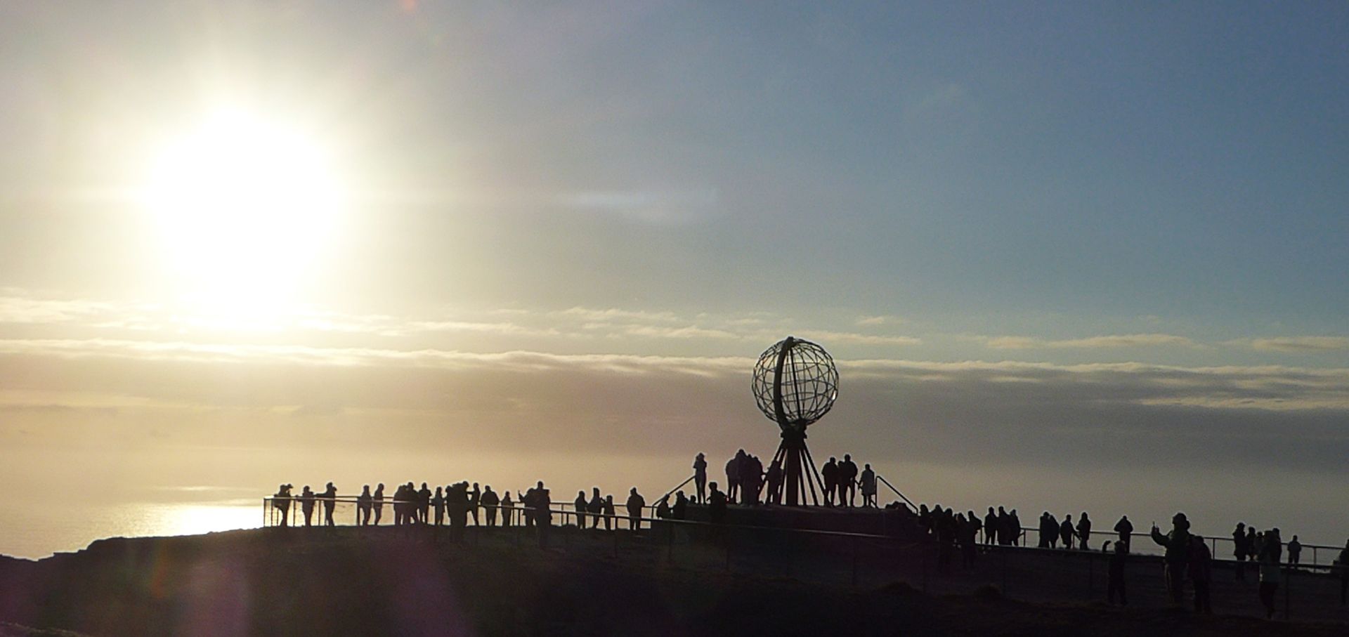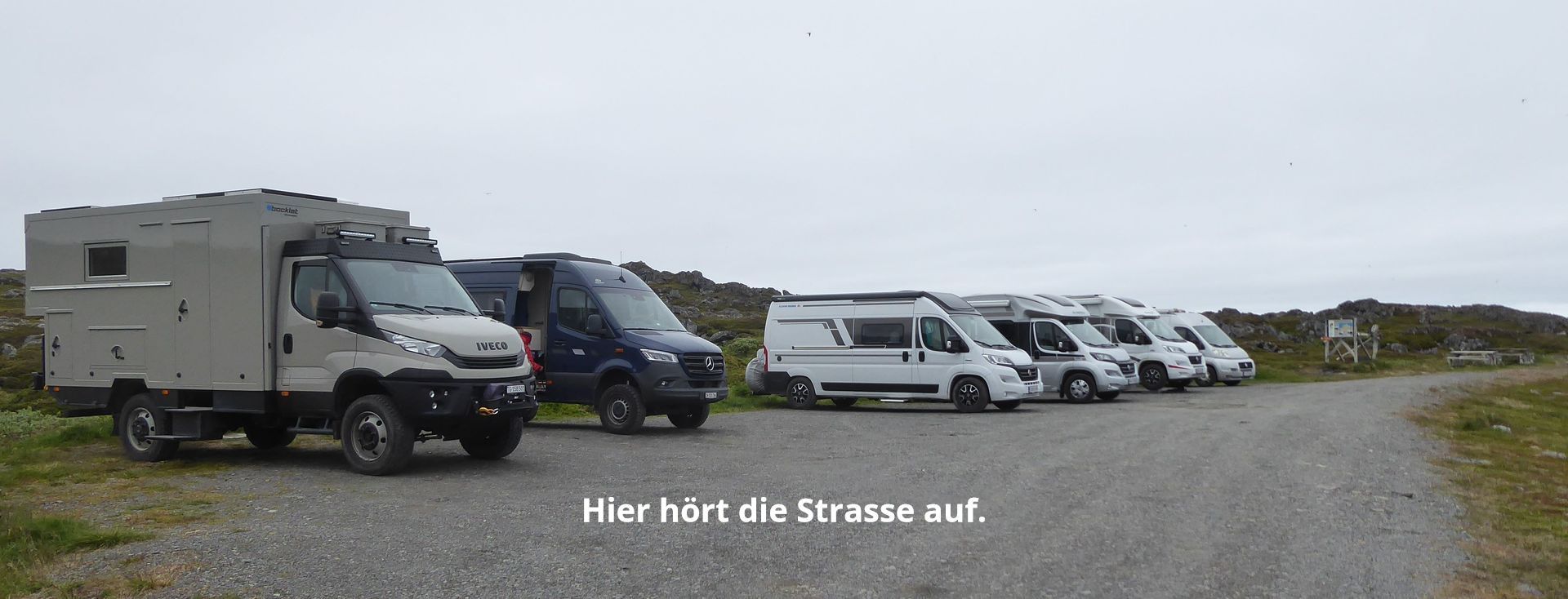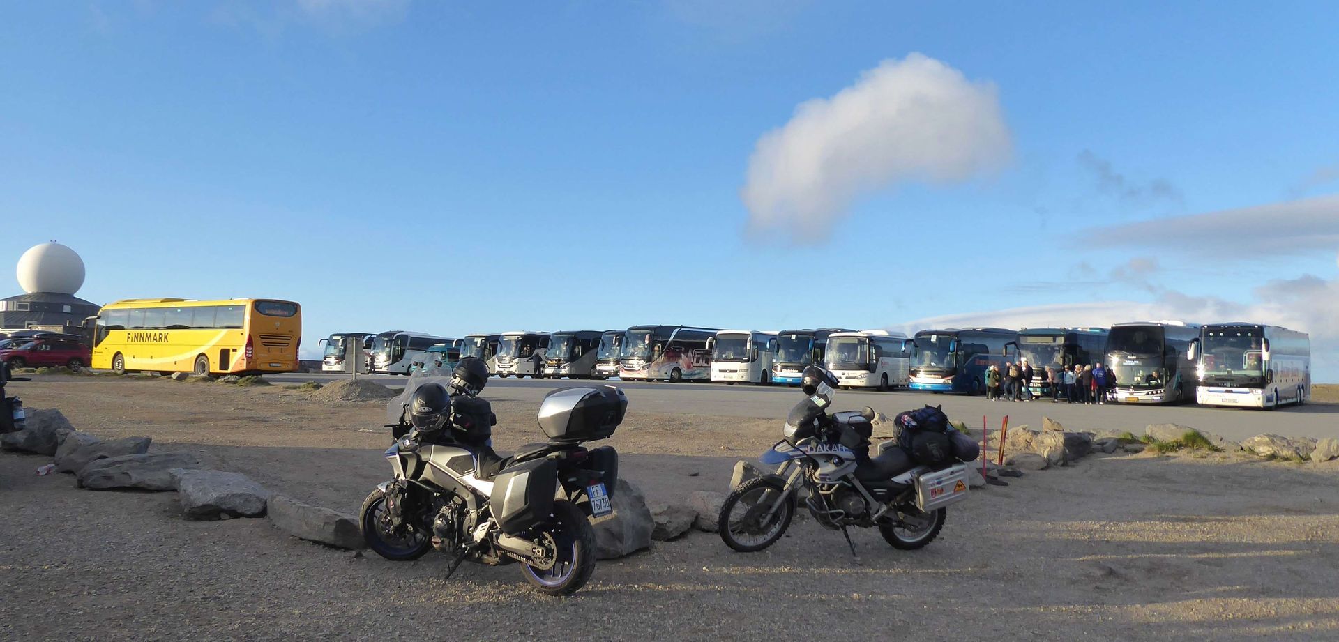 Das Nordkapp wollten wir eigentlich auslassen aber da haben so viele davon geschwärmt. Die Verhältnisse sind optimal, Sonne und kein Regen in Sicht. In Alta füllt Hans AdBlue nach, vergisst aber den Diesel. Danach essen wir feinen Salat und fahren weiter. Die Tankanzeige meldet plötzlich Reserve, d.h. noch etwa 170km, aber mit Reserve können wir nicht mehr heizen. Die nächste Tankstelle ist in Honningsvag. Von dort sind es nur 45 km zum Nordkapp, der äusserste Norden von Europa auf der Insel Mageröya. Also nix wie los! Um 19 Uhr kommen wir an. Der Parkplatz ist voll und es stehen 15 Reisebusse da, dann noch Motorräder und ganz verwegen – Radfahrer.