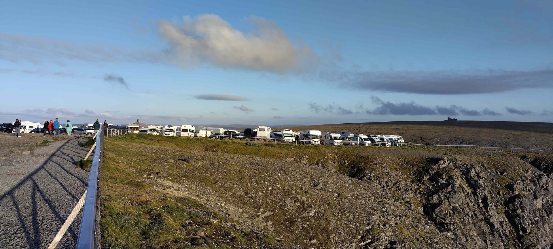 Wir finden trotzdem einen Platz am Rand zu einer grossen Wiese. Am äussersten Rand Europas koche ich Zigerhöreli – echte Glarner Spezialität. Nach 23 Uhr gehen wir ins Gewühle. Wir kaufen eine Karte für die Ausstellung, Kaffee, Infos und Souvenirladen. Es gelingen einige tolle Föteli, wir spazieren bis um Mitternacht und gehen dann zum Bänz. Wir haben folgende Rechnung angestellt: 15 Reisebusse etwa 750 Leute, ca. 100 Camper 200 Leute, dazu noch Töff und Velos…. Das ergibt mehr als 1000 Leute an diesem Abend.