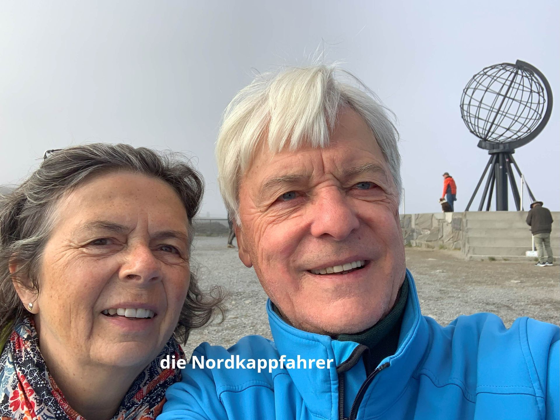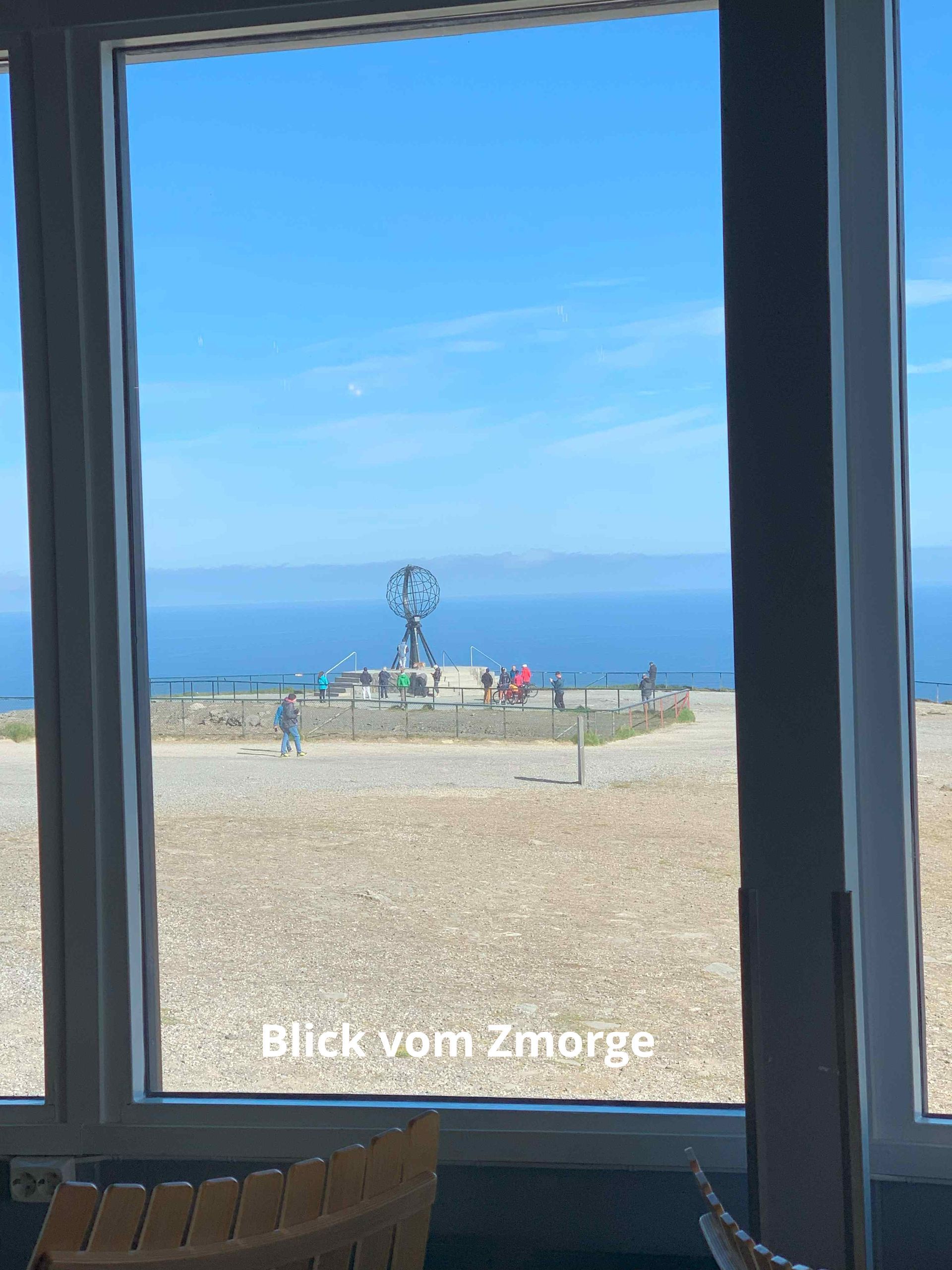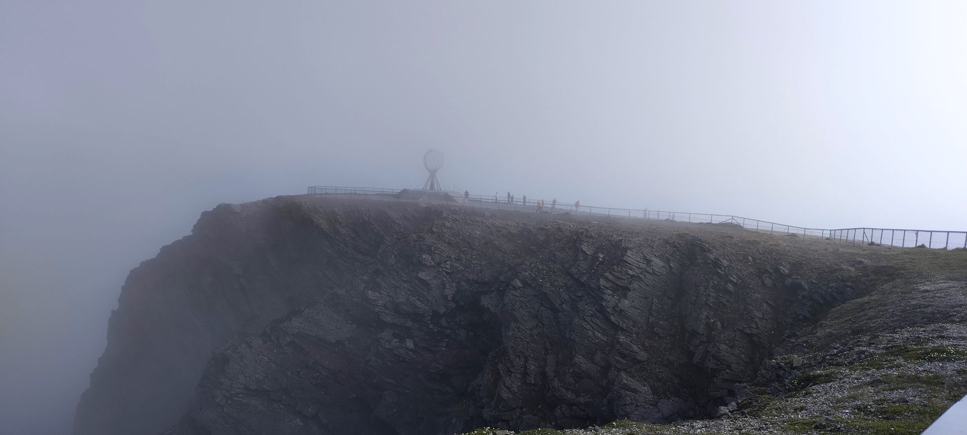 Am nächsten Morgen gehen wir zur Weltkugel. Wir sind fast allein im dichten Nebel. Ein Paar, das die ganze Nacht durchgefahren ist, zeigt sich enttäuscht. Einige Tourenfahrer hieven ihr Velo zur Kugel für einen Beweis ihres Erfolgs. Wir klatschen dazu. Aber dann verzieht sich der Nebel wieder, Sonne und freie Sicht zum Nordpol. Das Kaffee öffnet erst um 11 Uhr darum gönnen wir uns ein Zmorge im Restaurant. Dann fahren wir zurück nach Honningsvag.