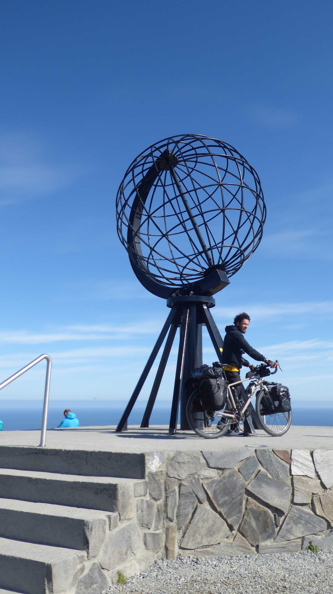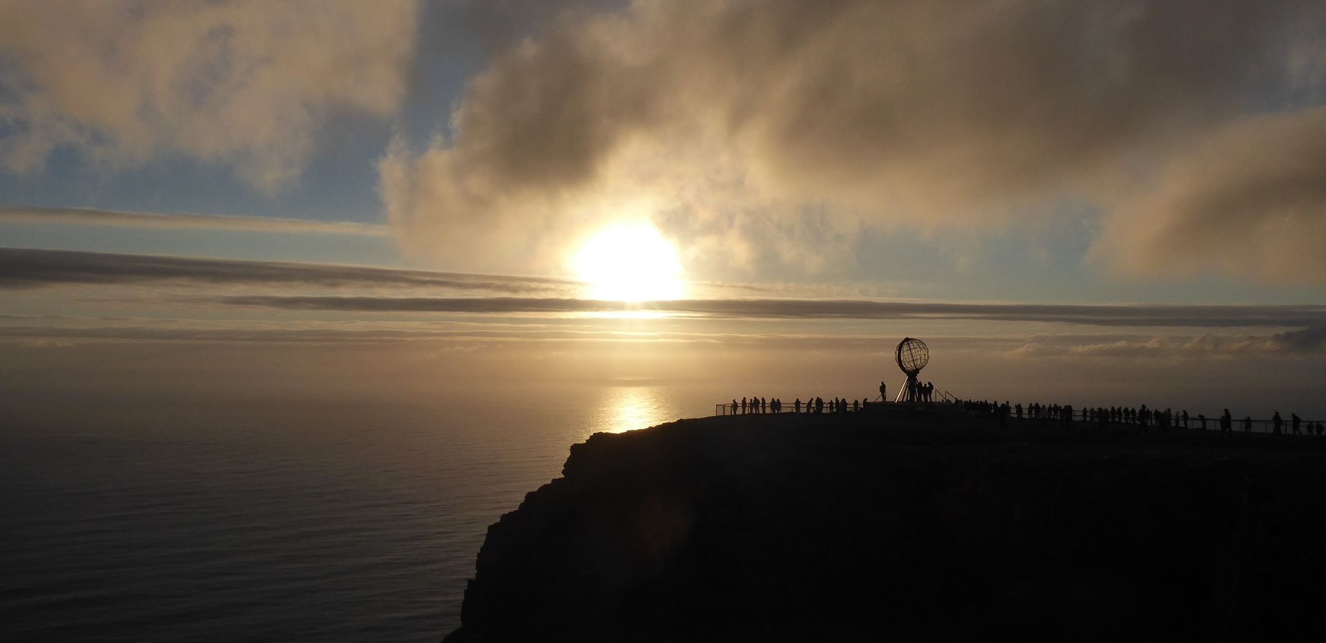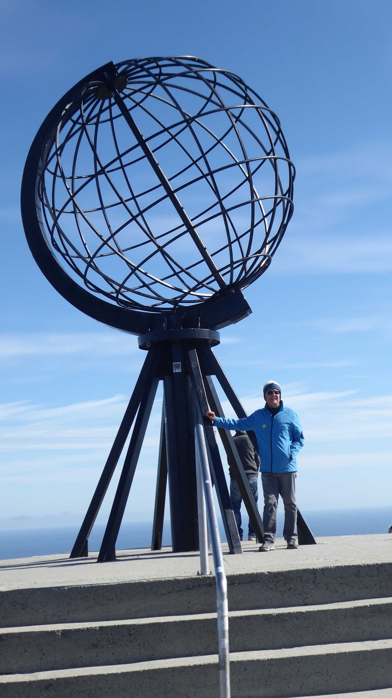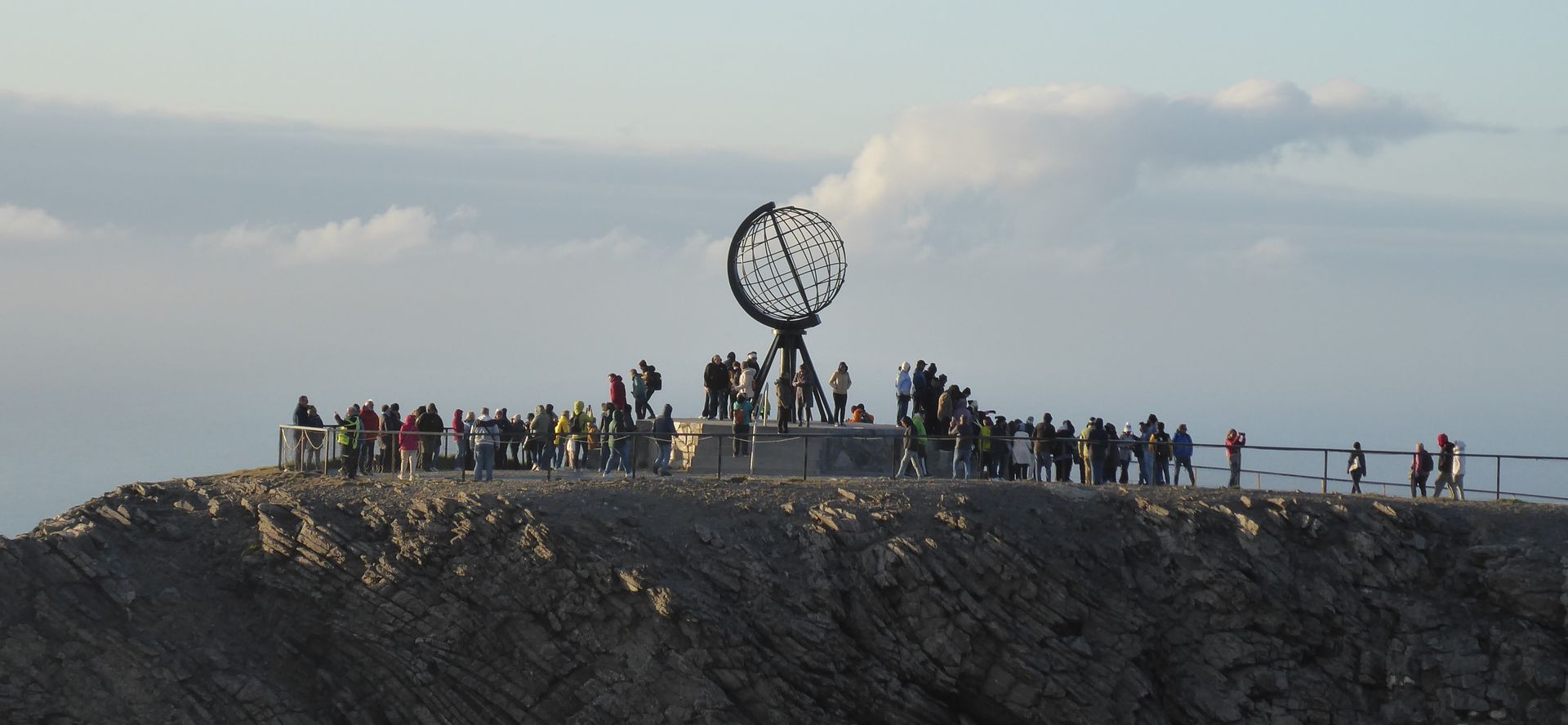 Am nächsten Morgen gehen wir zur Weltkugel. Wir sind fast allein im dichten Nebel. Ein Paar, das die ganze Nacht durchgefahren ist, zeigt sich enttäuscht. Einige Tourenfahrer hieven ihr Velo zur Kugel für einen Beweis ihres Erfolgs. Wir klatschen dazu. Aber dann verzieht sich der Nebel wieder, Sonne und freie Sicht zum Nordpol. Das Kaffee öffnet erst um 11 Uhr darum gönnen wir uns ein Zmorge im Restaurant. Dann fahren wir zurück nach Honningsvag.