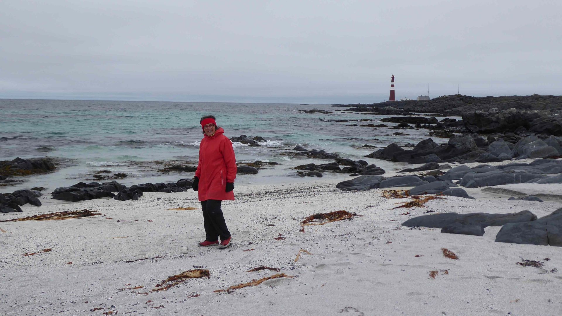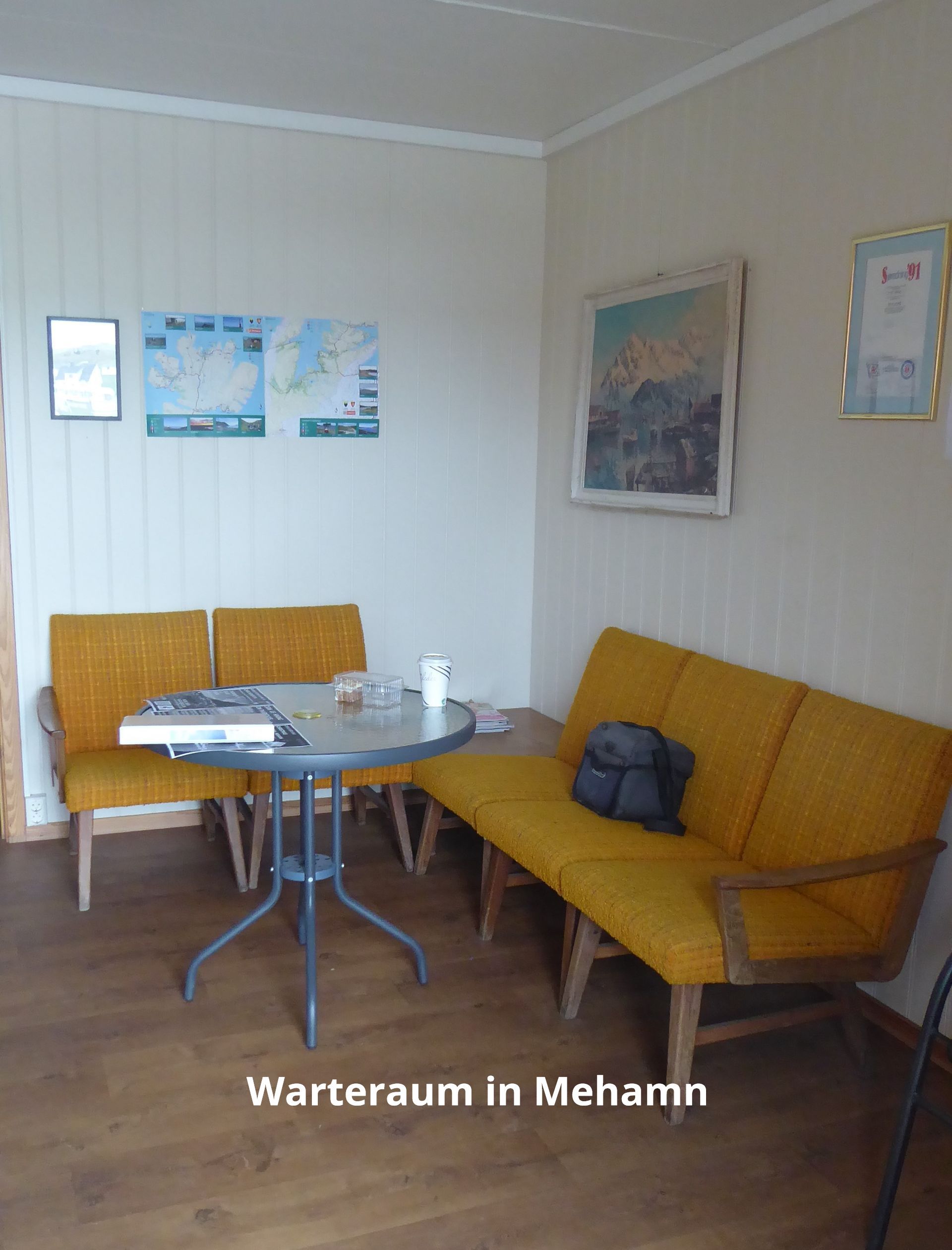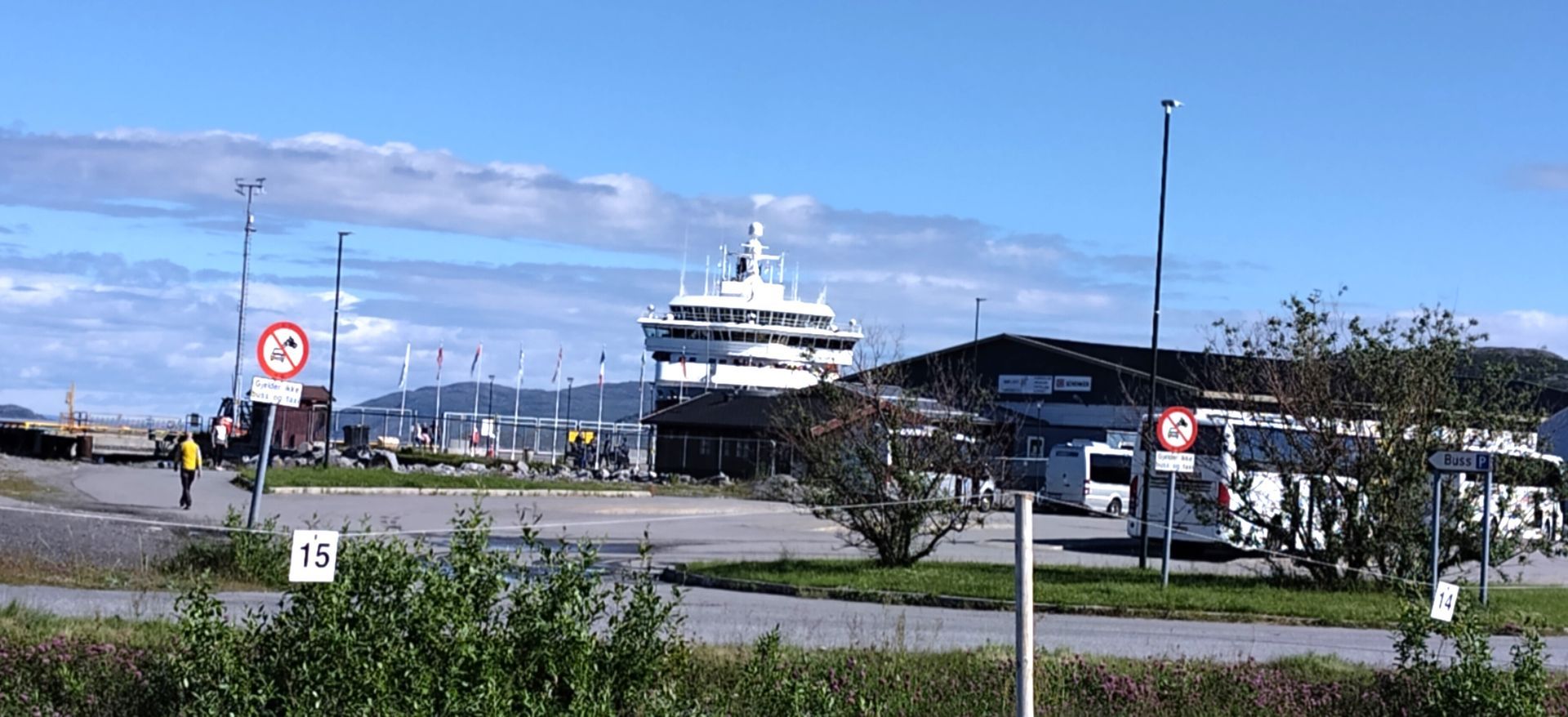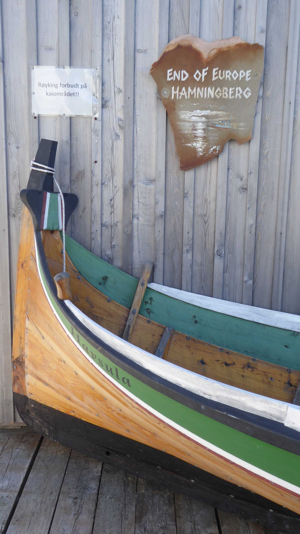 Am Sonntag 30. Juni fahren wir Richtung Mehamn. Abends um 19 Uhr legt hier das nordgehende Hurtigrutenschiff an. Das wollen wir sehen. Ich steure direkt in den Warteraum, eine kleine warme gemütliche Stube. Da sitzt ein Mann, der am 1. März in Kristiansand (Südnorwegen) abgefahren ist und mit seinem Ruderboot sein Land umrudert. 5-65 km legt er pro Tag zurück und manchmal ist er nach 5 km so müde wir nach 65 km - je nach Wind. Stolz zeigt er uns sein Boot. Wir sind beeindruckt.