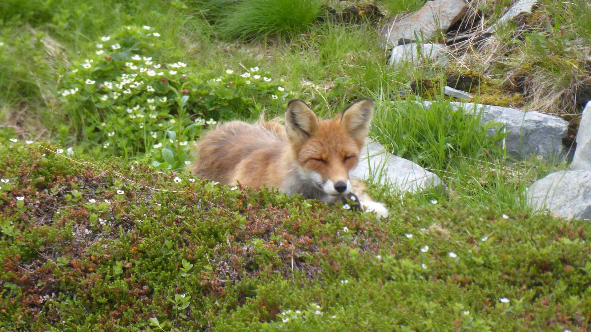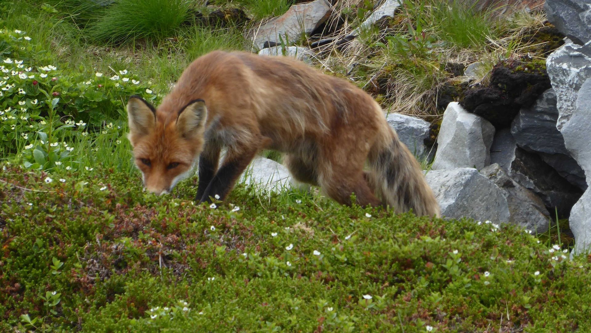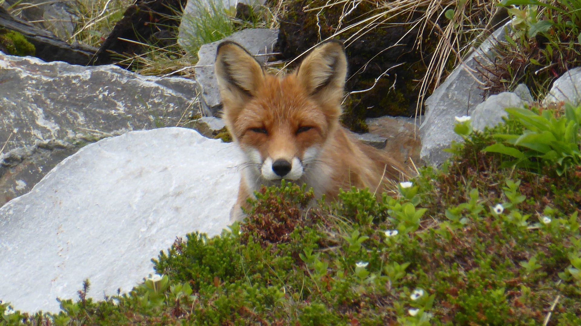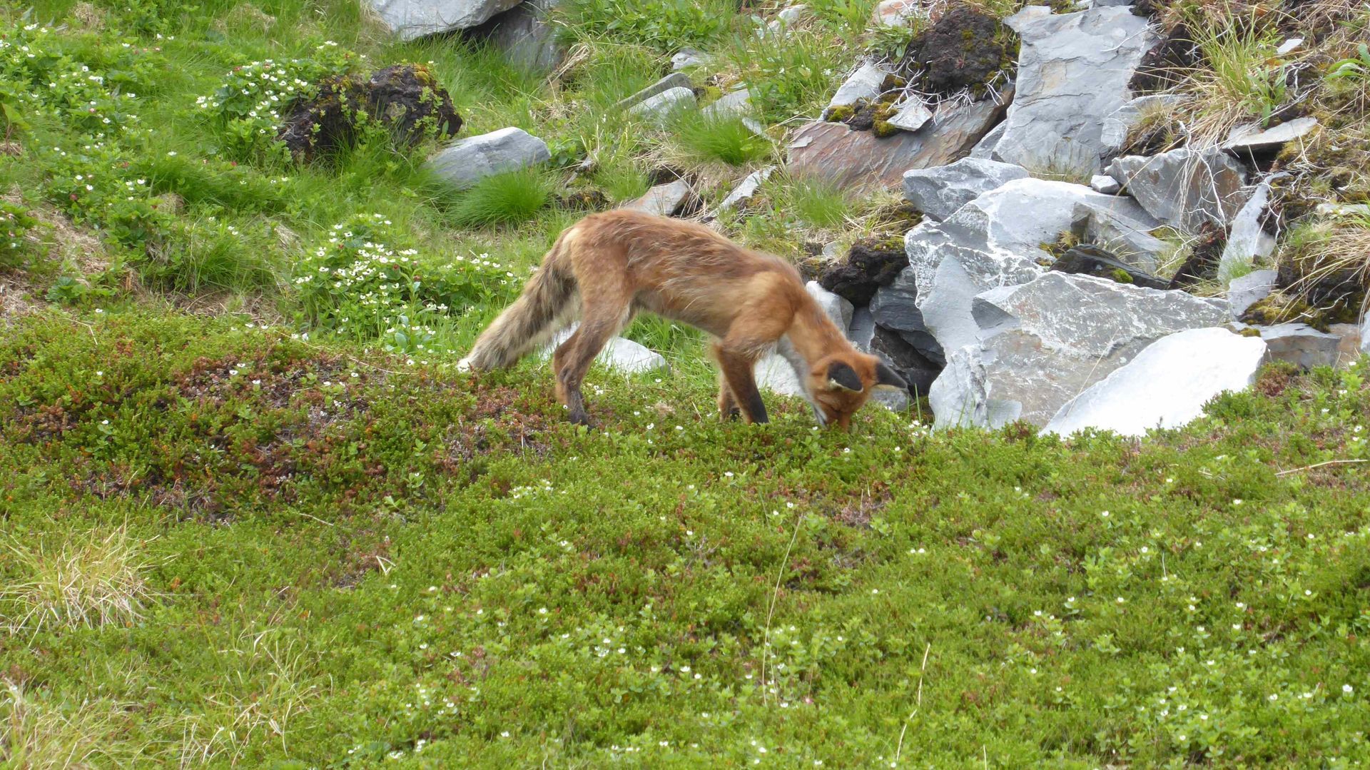 Am nächsten Tag spazieren wir um die kleine Halbinsel. Da plötzlich verschwindet ein Fuchsschwanz. Wir gehen etwas näher um den Eingang der Höhle zu beobachten. Der Fuchs kommt wieder heraus, legt sich hin, beobachtet uns und findet dann etwas Lebendiges zum Spielen und Fressen. So nahe haben wir beide noch nie einen Fuchs gesehen.