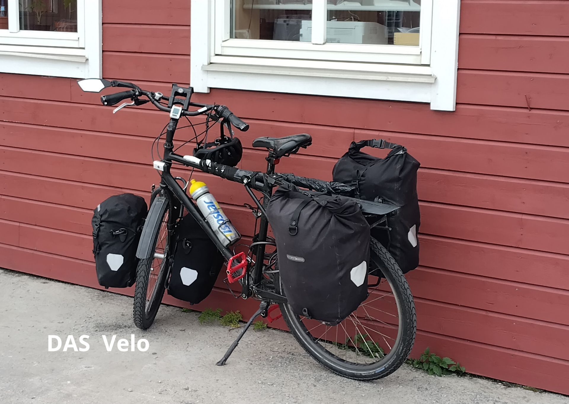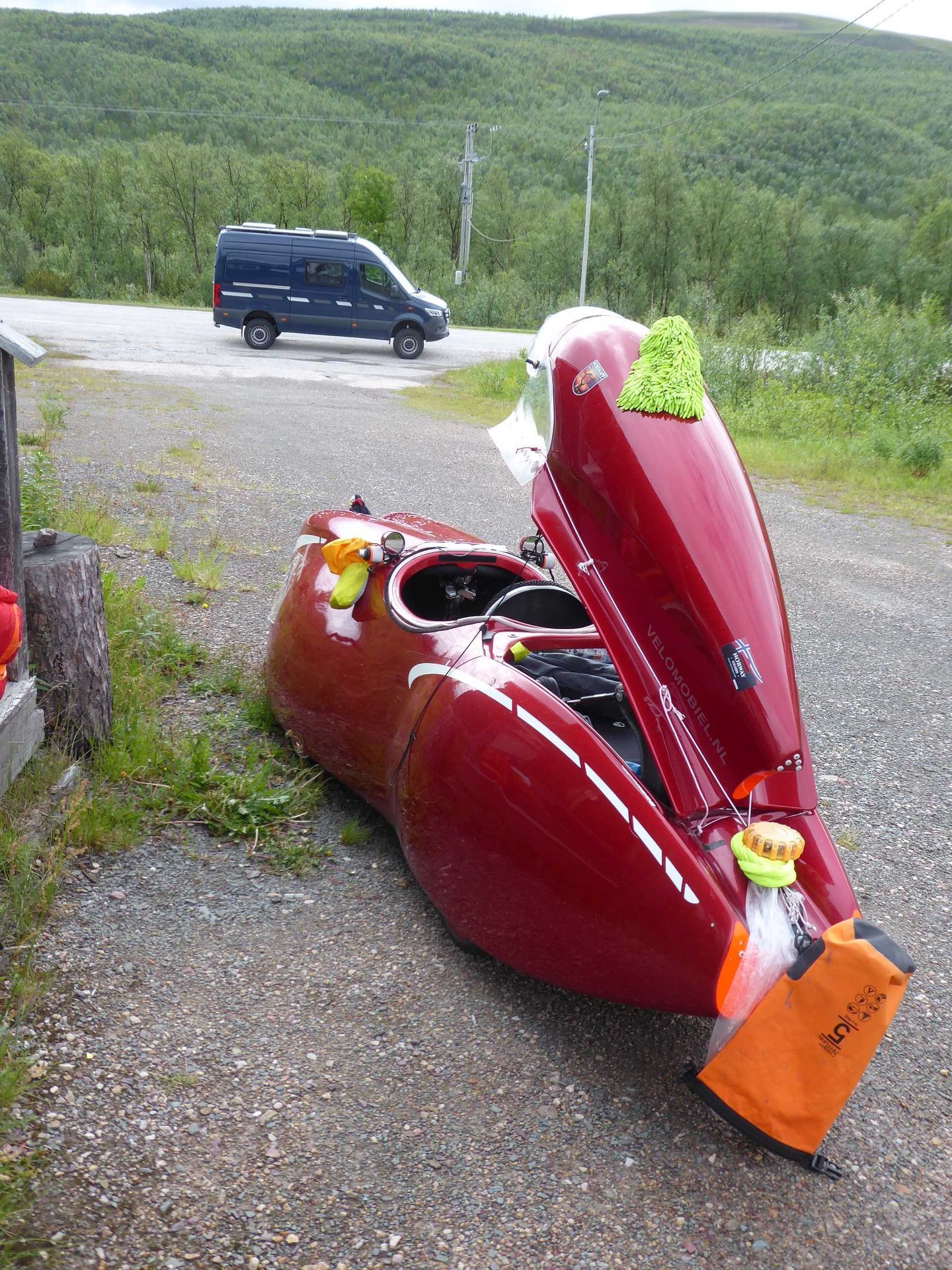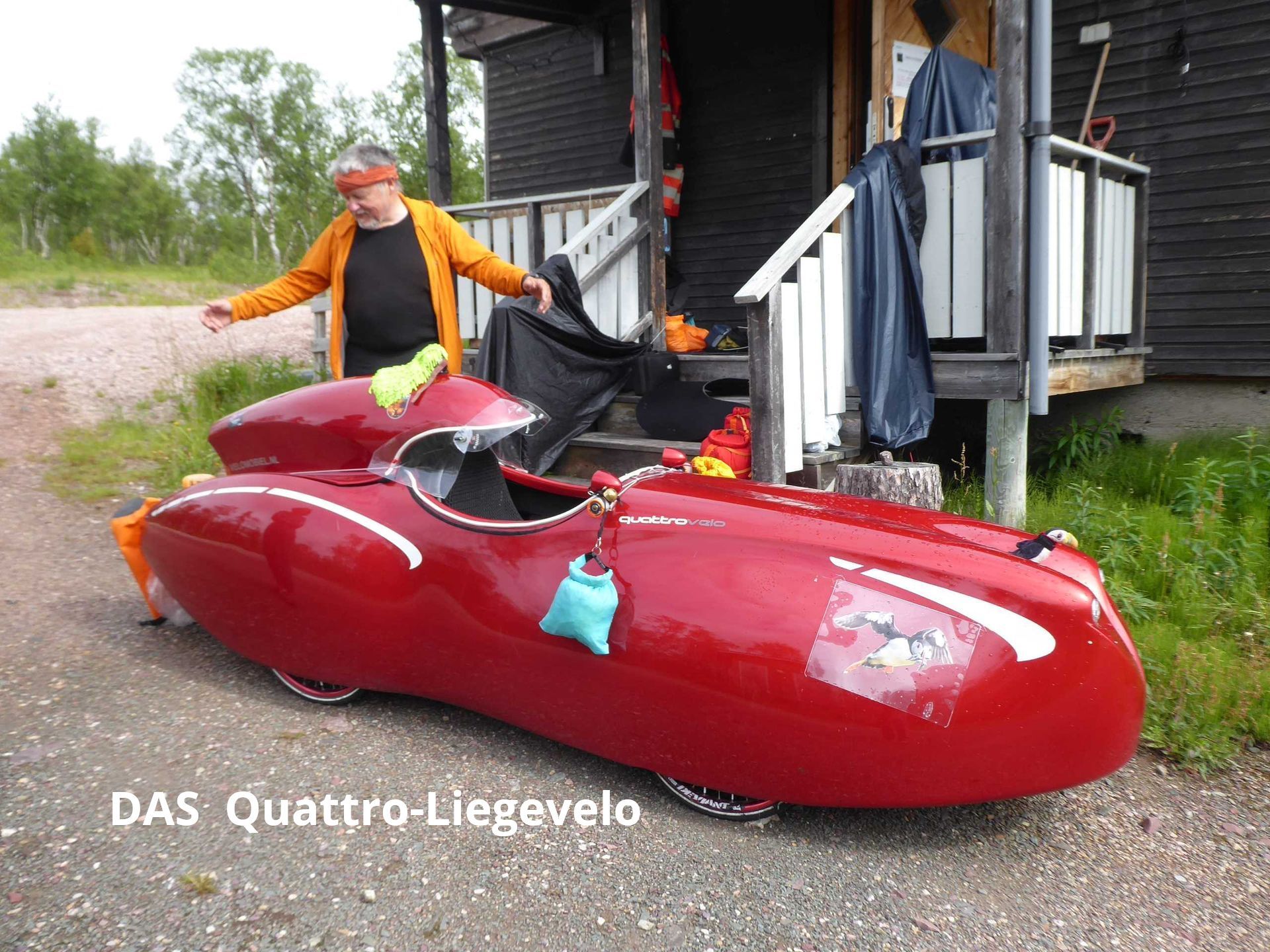 Unterwegs treffen wir einen futuristischen Velofahrer aus Hannover mit einem Quattro-Liegevelo, der damit bis zum Nordkapp fuhr. Er erklärt uns sein Gefährt, mit dem er auch im Regen trocken bleibt und in welchem er sogar auch übernachten kann!
