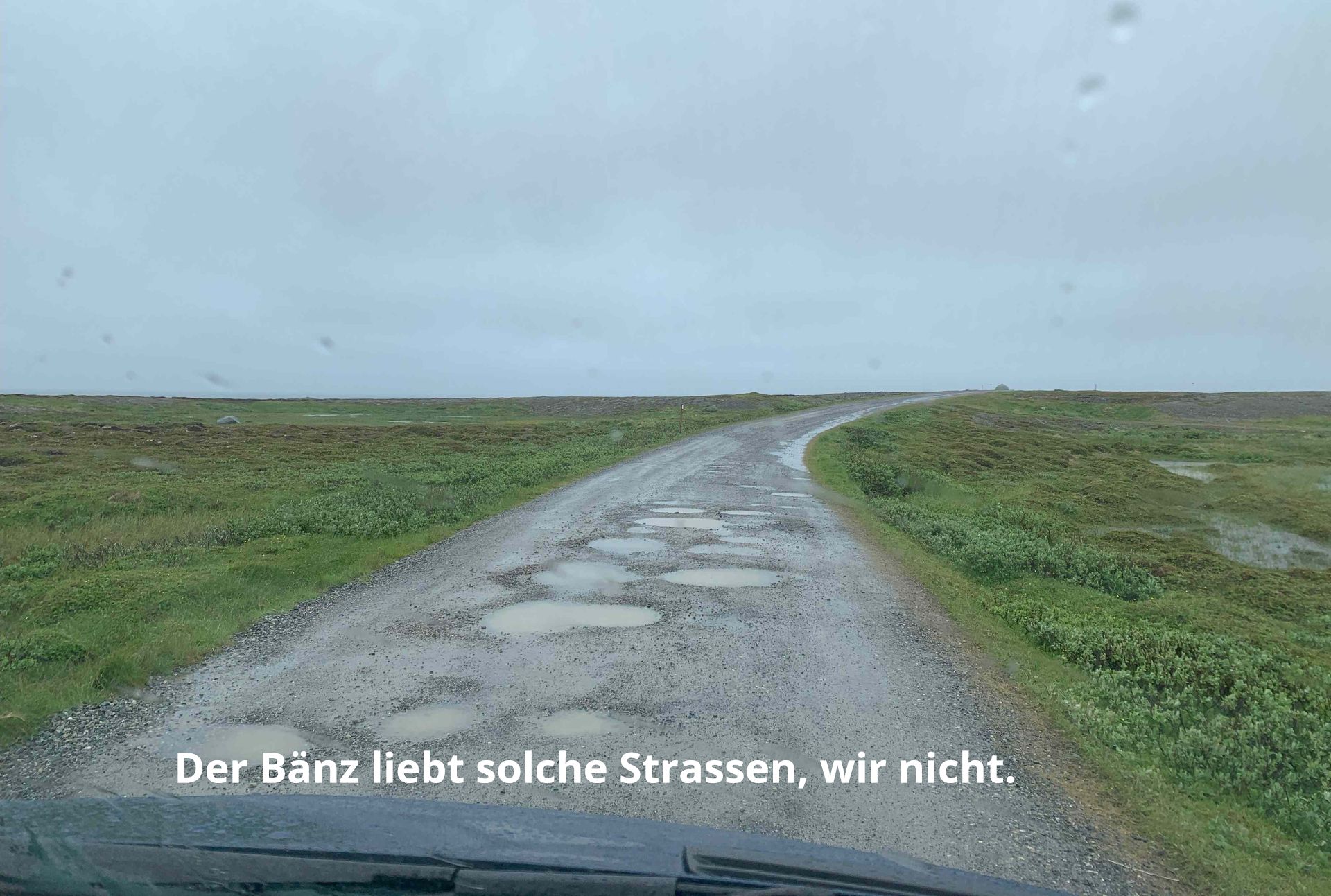 Am 2. Juli fahren wir nach Gamvik. Die Strasse schlängelt sich durch sehr karge und kahle Landschaft. Vor 21 Jahre waren wir auch schon hier und suchen nun das Hytter, in dem wir übernachtet haben und finden es nach einigem Suchen. Beim Leuchtturm stehen wir wieder am Ende des Festlandes Europas. Dort hört auch die Strasse auf und da stellen wir den Bänz hin. Vor dem angesagten Regen wandern wir durch die Gegend ans Meer. Und dann kommt er ausgiebig und füllt die Schlaglöcher.