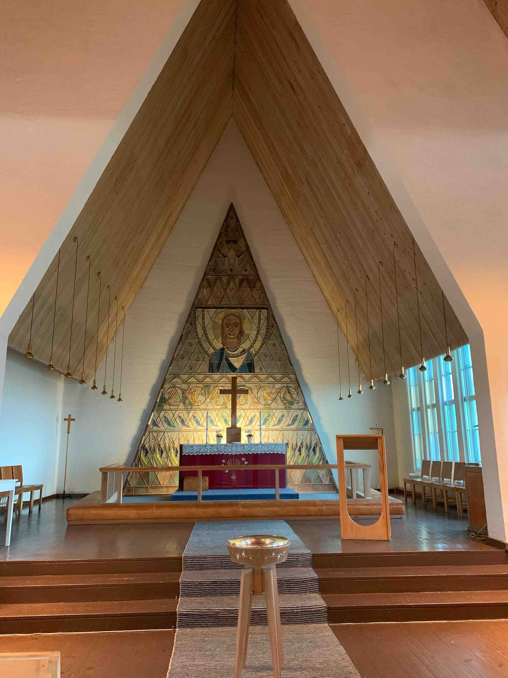 Vardö im äussersten Osten war ein Wunschziel von Beatrice. Auf die Insel führt ein Unterwassertunnel, dessen Eingang wie ein Fischmaul aussieht. Ich wandere allein durch den Ort, weil Hans Computerarbeit erledigen will. Ich sehe die Kirchentür offen und ein Mann, der mich zu erwarten scheint. Das tut er wirklich und er erklärt mir den Bau der Kirche von 1958 und das Altarbild. Als ich ihn frage, ob er der Pfarrer sei, meint er, er sei ein kirchlicher Touristenführer. Interessant. Er kann gut deutsch. Auch vor dem Pomorenmuseum werde ich angesprochen, aber mich interessiert das Hurtigrutenschiff mehr. Auffallend ist das laute Gekreisch und Geschrei der Möwen, die auf den kleinsten Fenster- und Dachvorsprüngen nisten. Am Abend laden uns Monica und Peter zu feinem Eierlikör ein.