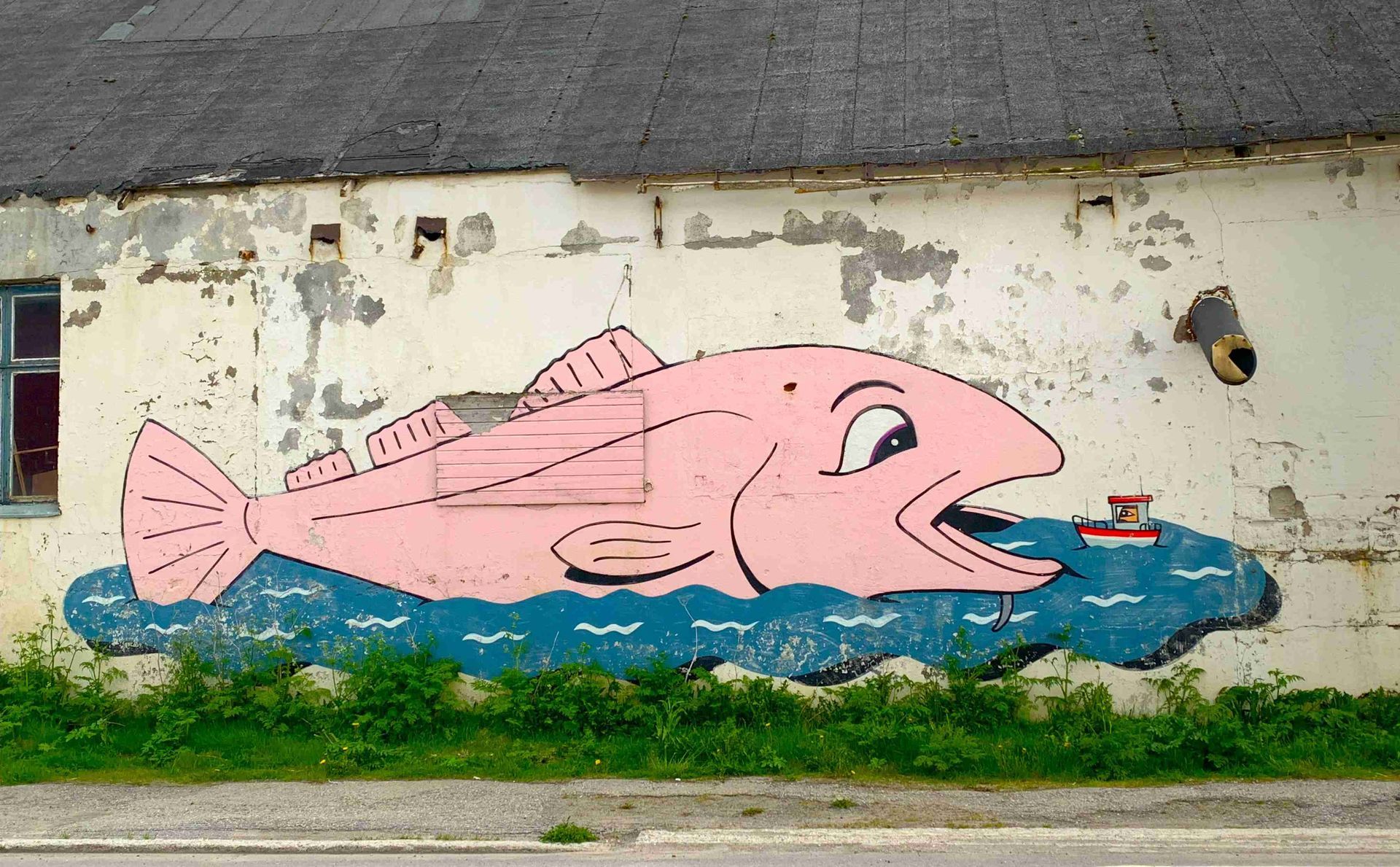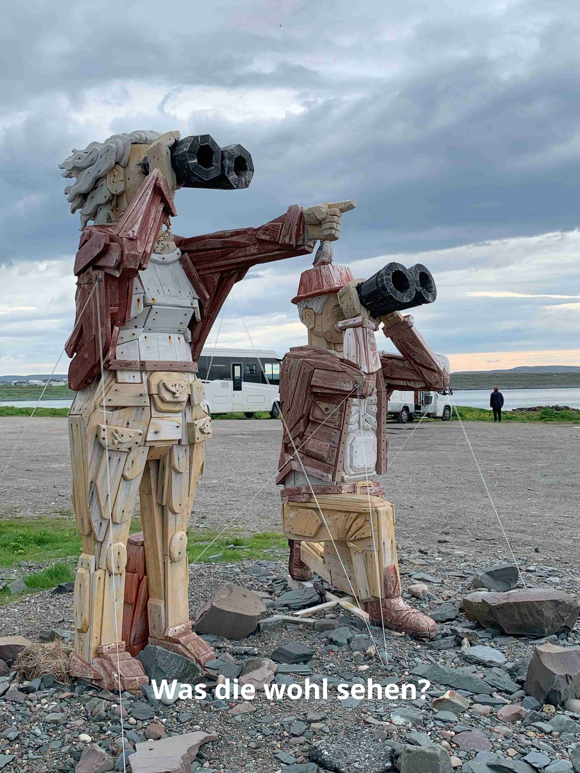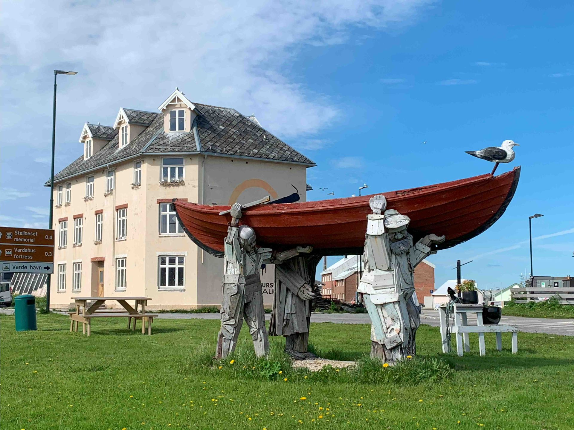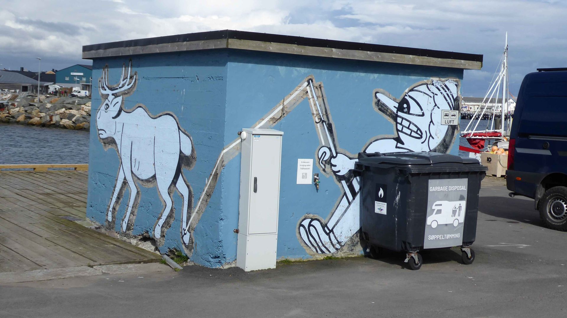 Wir schlendern durchs Dorf, essen eine frische Waffel und fahren dann nach Vardö zurück. Es fehlte uns an Trinkwasser und der einzige Brunnen gab nur eine bräunliche Brühe her. Wir übernachten noch einmal am selben Stellplatz. Vardö ist auch bekannt für Malereien an Hausmauern.
