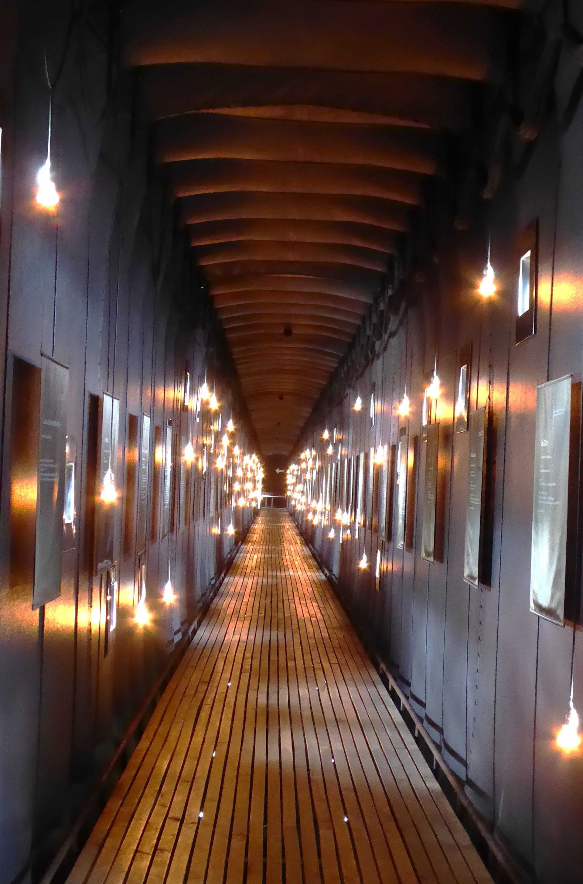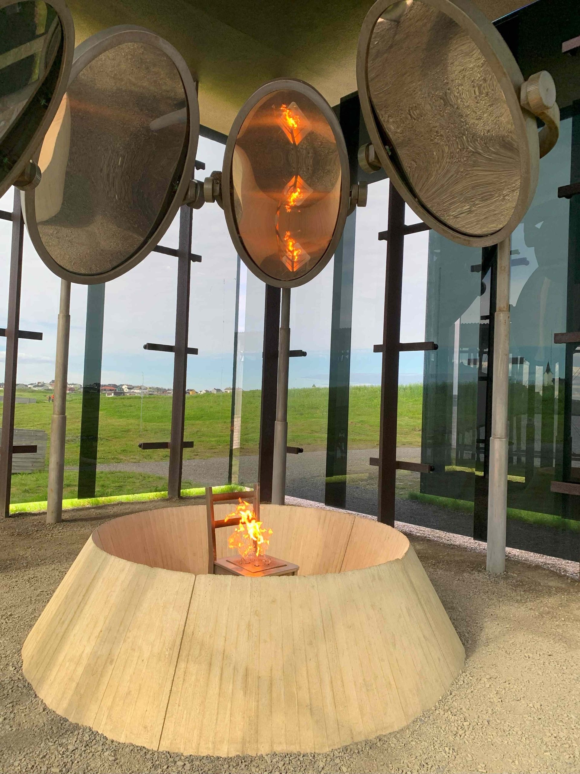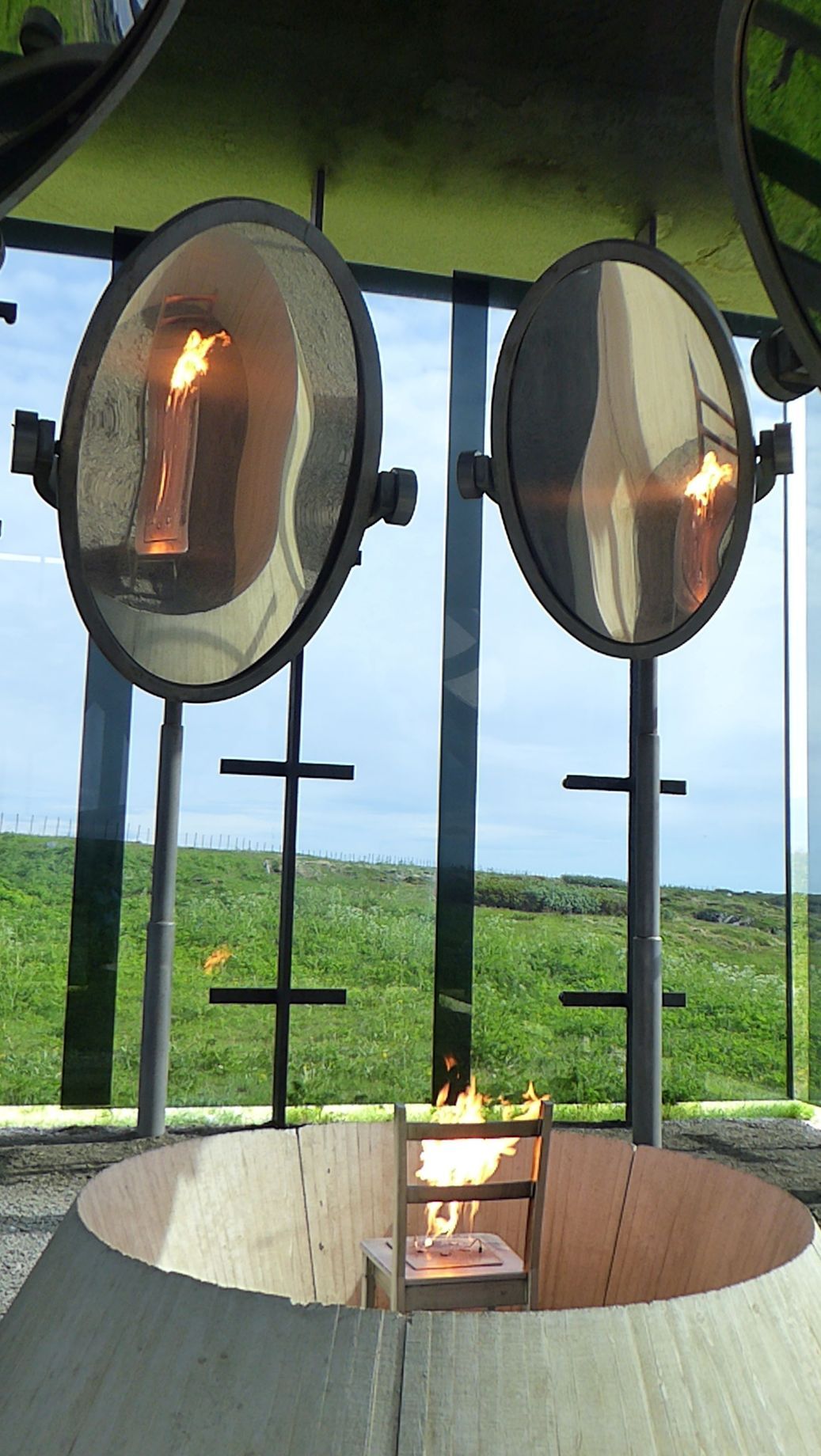 Dann besuchen wir das Steilneset, das Hexenmahnmal von Peter Zumthor und Louise Bourgeois. Zwischen 1601 und 1692 wurden hier in Vardö 91 Hexen getötet, 77 Frauen, die meisten Norwegerinnen und 14 Männer, Samis. Nach gnadenloser Folterung in der die Opfer Dinge zugaben, die aus der Fantasie der Folterer entstammten, wurden sie auf dem Scheiterhaufen verbrannt. In einem langen Fischgestell gibt es kleine quadratische Ausblicke für jedes Opfer, eine kurze Personenbeschreibung und eine Lampe, die brennt. Im Kubus nebenan brennt auf einem Stuhl ein Feuer, das sich in den Spiegeln multipliziert, ein Symbol für die Scheiterhaufen. Ein Ort, der sehr betroffen und nachdenklich macht. Warum werden Menschen verurteilt für Sitten und Gebräuche, z.B. trommeln oder Runen? Woher kommt dieser Hass auf Frauen? Wie kommen Sadisten an die Macht und warum gerade die? Fragen über Fragen und wohl wenige Antworten.