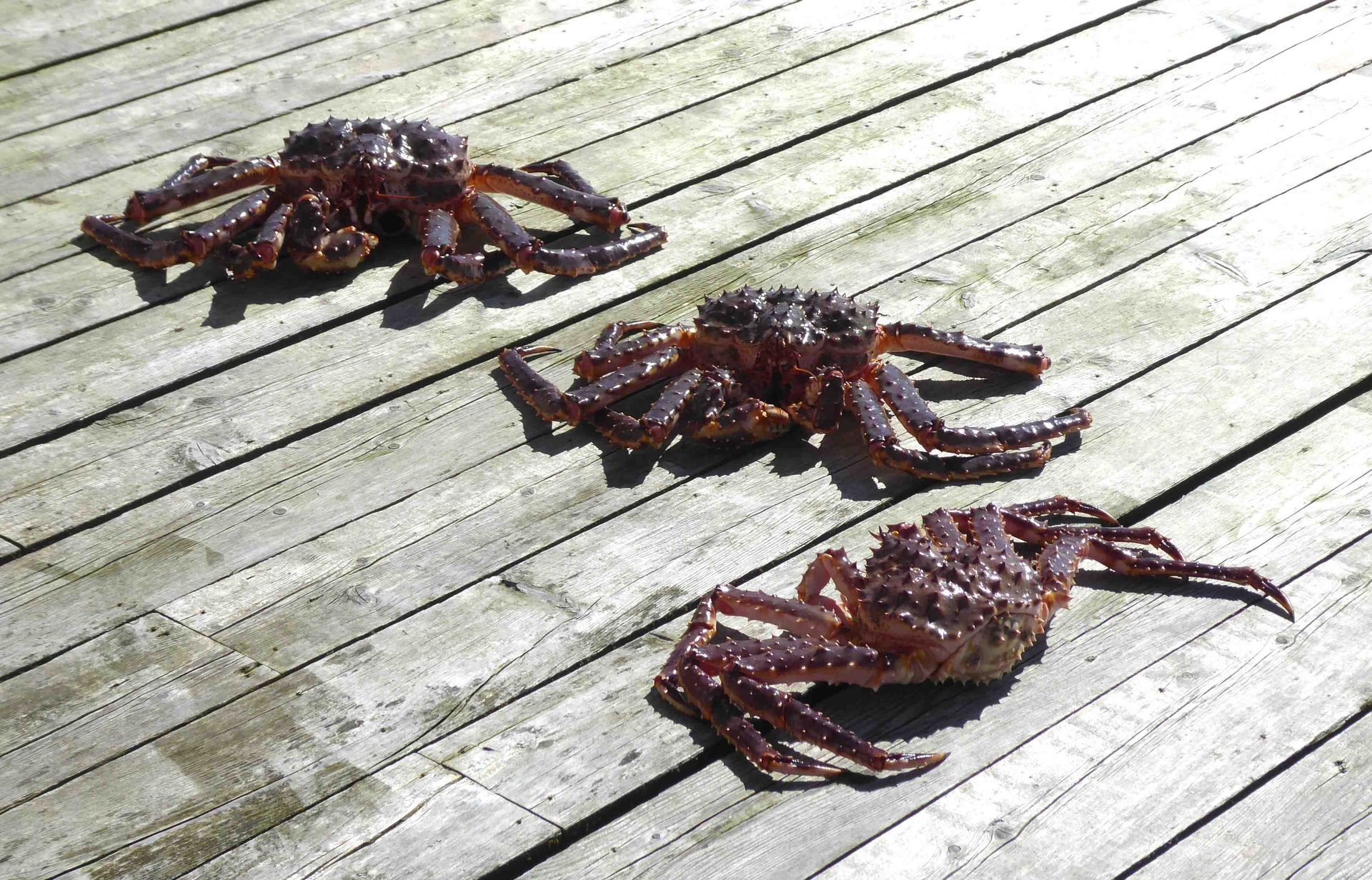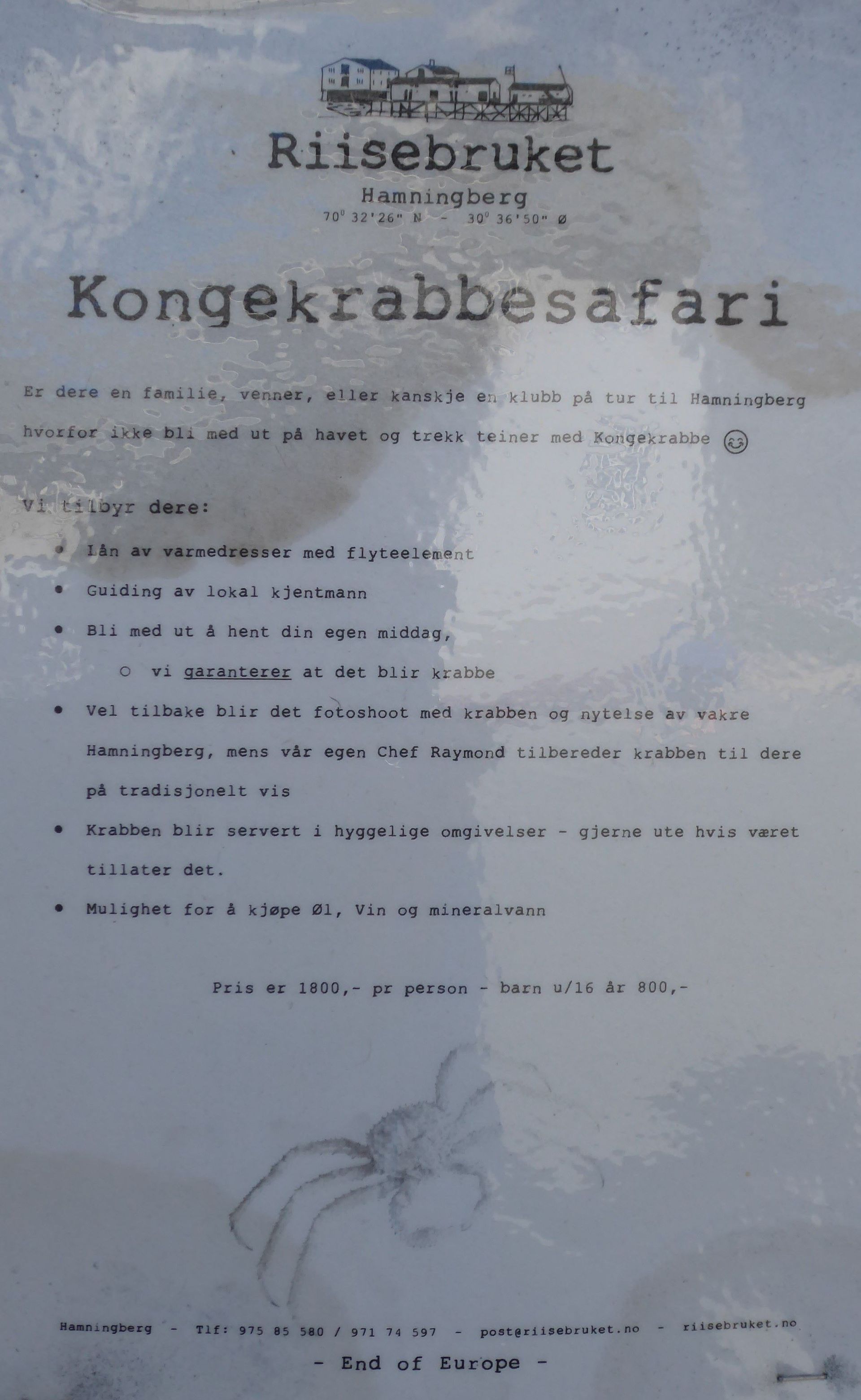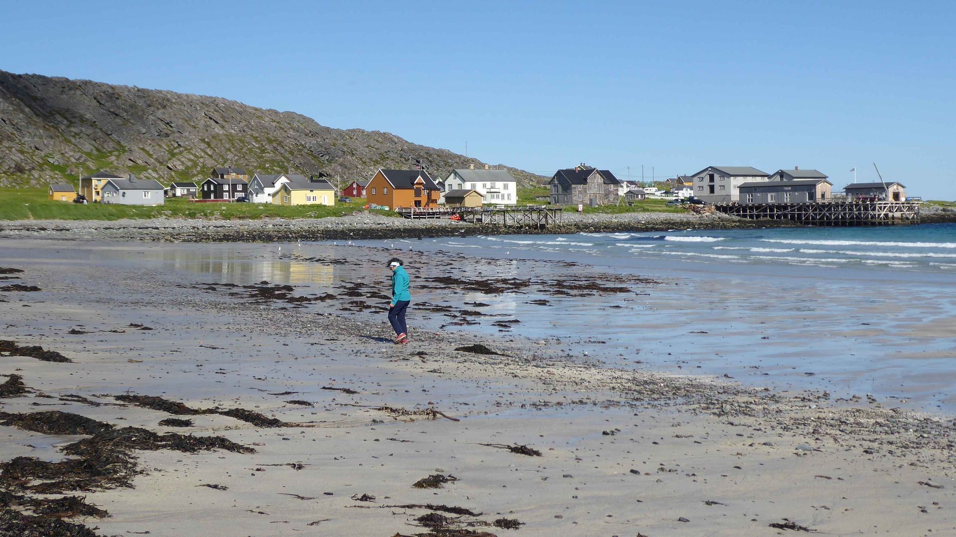 Das Hurtigrutenschiff holt mich aus der düsteren Stimmung. Dann hat Hans die Idee nach Hamningberg zu fahren. Es ist eine abenteuerliche Fahrt auf einer schmalen einspurigen Strasse durch Felsen und Steinwüste. Auf einer Wiese stehen weit verstreut andere Camper und der Bänz. Der Morgen ist traumhaft: Sonne, klare Sicht und steifer Wind. Wir wandern auf einen Hügel, der im 2. Weltkrieg eine Festung war. Im Ort werden auch Königskrabbensafaris angeboten. Ein Safarischiff kommt zurück und drei gefangene Exemplare werden mit einem grossen Messer aufgeschnitten, die Beine gesammelt und die Körper ins Meer geworfen – nix für uns.