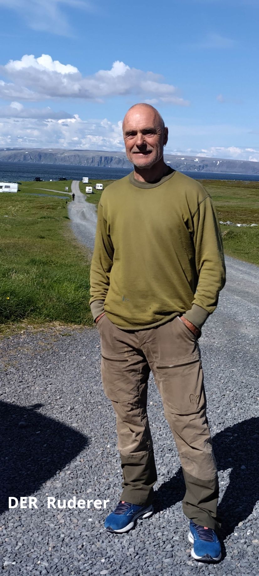 So eine Überraschung, wir treffen den Ruderer wieder. Er sitzt hier fest. Der starke Wind würde ihn zum Nordpol treiben. Nach Kirkenes braucht er noch etwa 4 Tage. Hans darf ein Foto von ihm machen, nur seinen Namen haben wir nicht erfragt, schade.