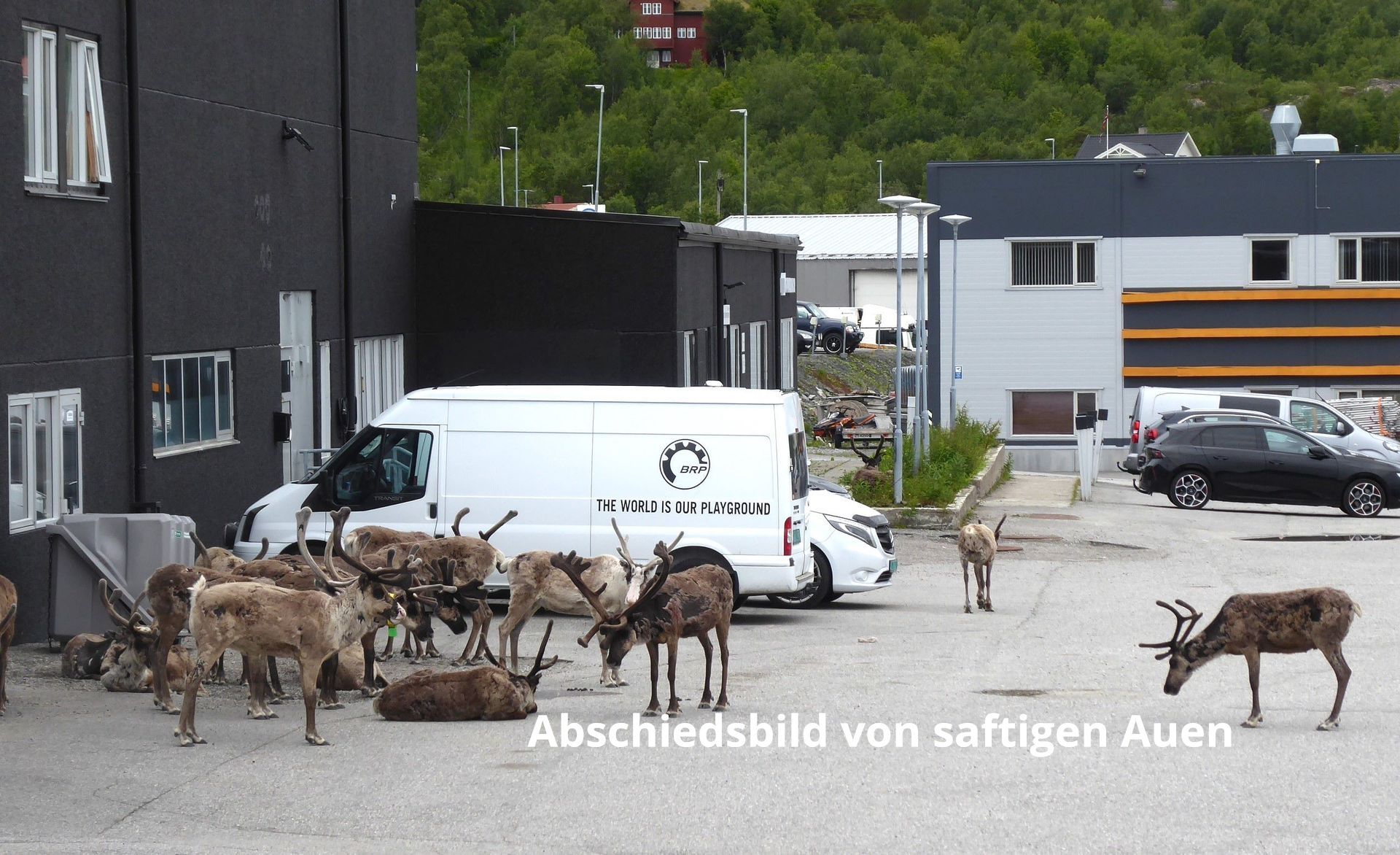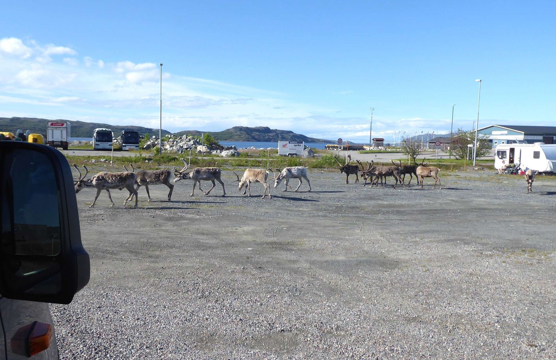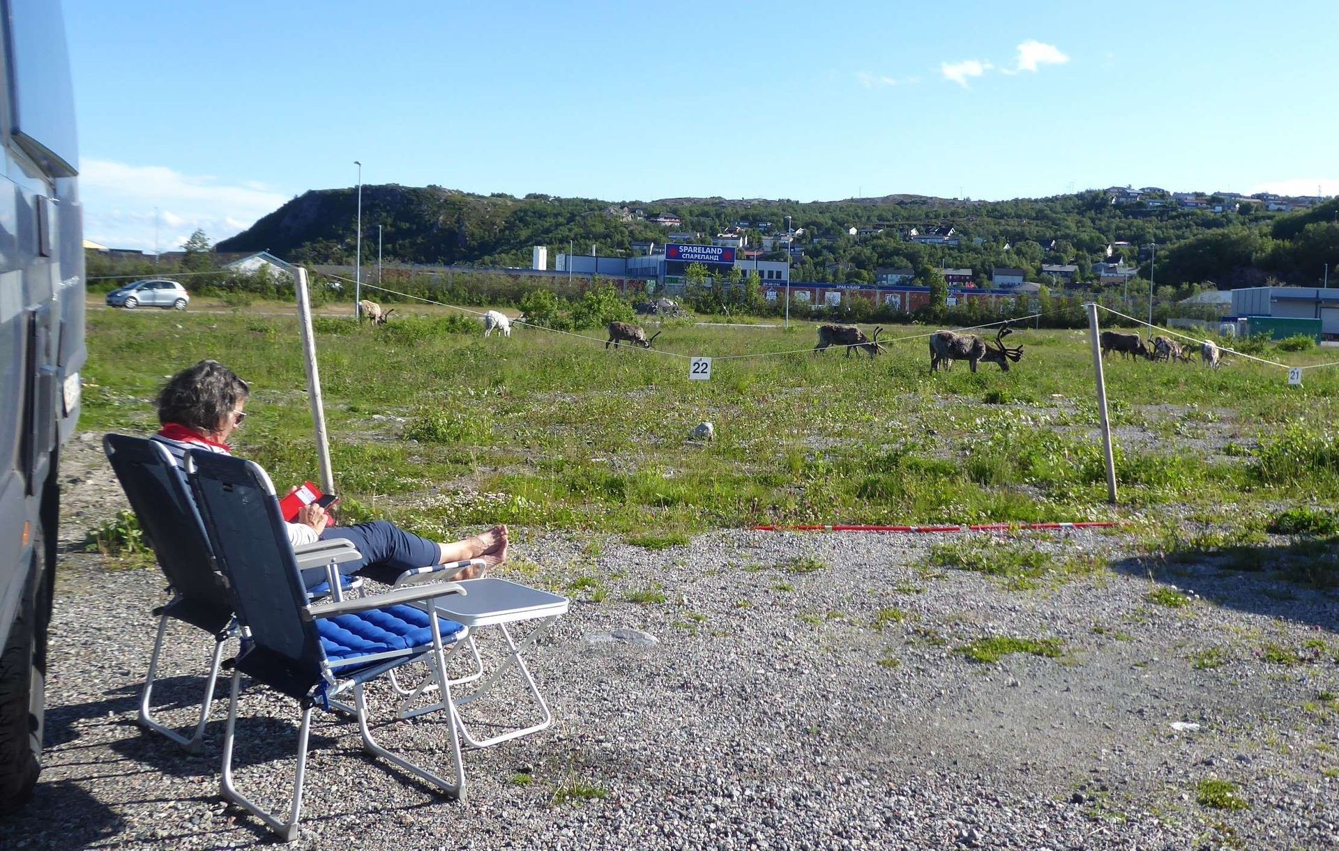 Es ist die östlichste Stadt von Norwegen. Wir fahren um den Varangerbotn. In Vadsö halten wir in einer Bakkeri für einen feinen Zmorge. Beim Samifreiluftmuseum regnet es leider so stark, dass wir gar nicht aussteigen. Auch in Bugöynes haben wir Pech: Wir haben einen Platz erobert, aber dann wird uns gesagt, dass dieser vorreserviert sei. Also fahren wir weiter nach Kirkenes an den Hafen. Da gefällt es uns sehr gut: Die Hurtigruten halten vor unserer Nase, das Gelände ist offen und weit, in die Stadt ist es nur ein Kilometer und die Rentiere besuchen uns oft.
