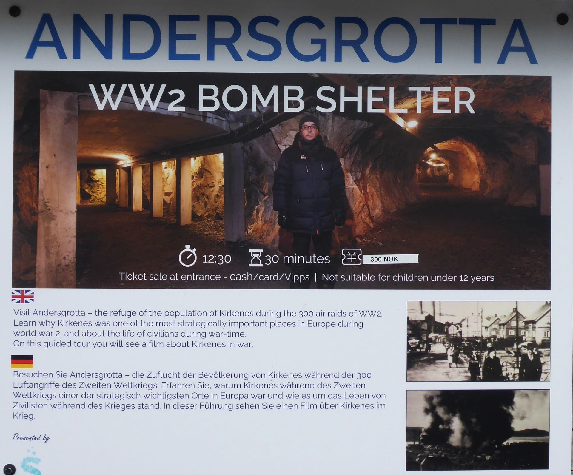 Am nächsten Tag machen wir an einer Führung durch die Anders-Grotte mit. Es ist ein langer Gang in den Fels gehauen um die Bevölkerung vor den Bomben der Russen zu schützen. Kirkenes war durch die Nazis sehr gut befestigt, weil sie von dort aus Murmansk erobern wollten. Über Murmansk wurden die Russen von den Alliierten und den USA mit Nachschub eingedeckt. Wer Murmansk eingenommen hatte, hatte auch den Krieg gewonnen. Aber die Russen wehrten sich und starteten einen Gegenangriff auf Kirkenes, damit die Nazis den Nachschub nicht mehr torpedieren konnten. Kirkenes wurde bombardiert und eingeäschert.
