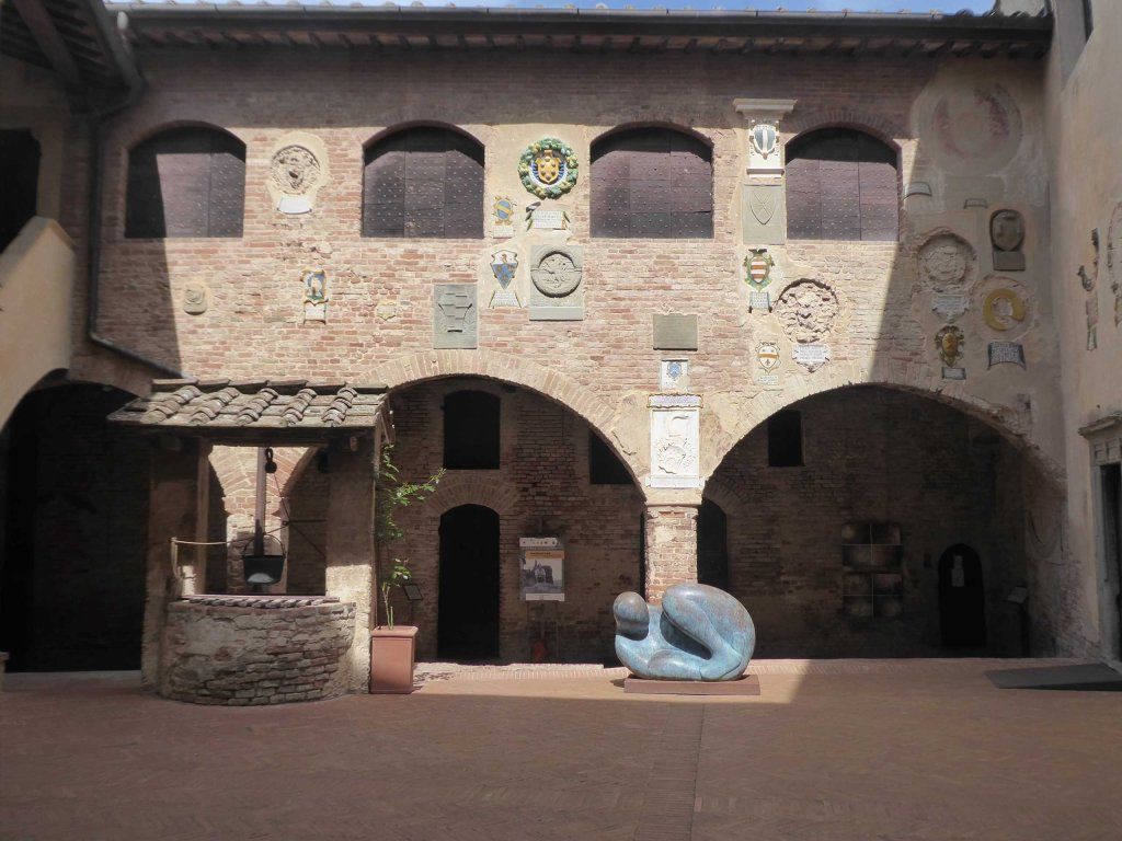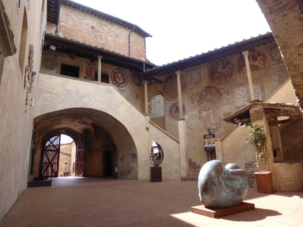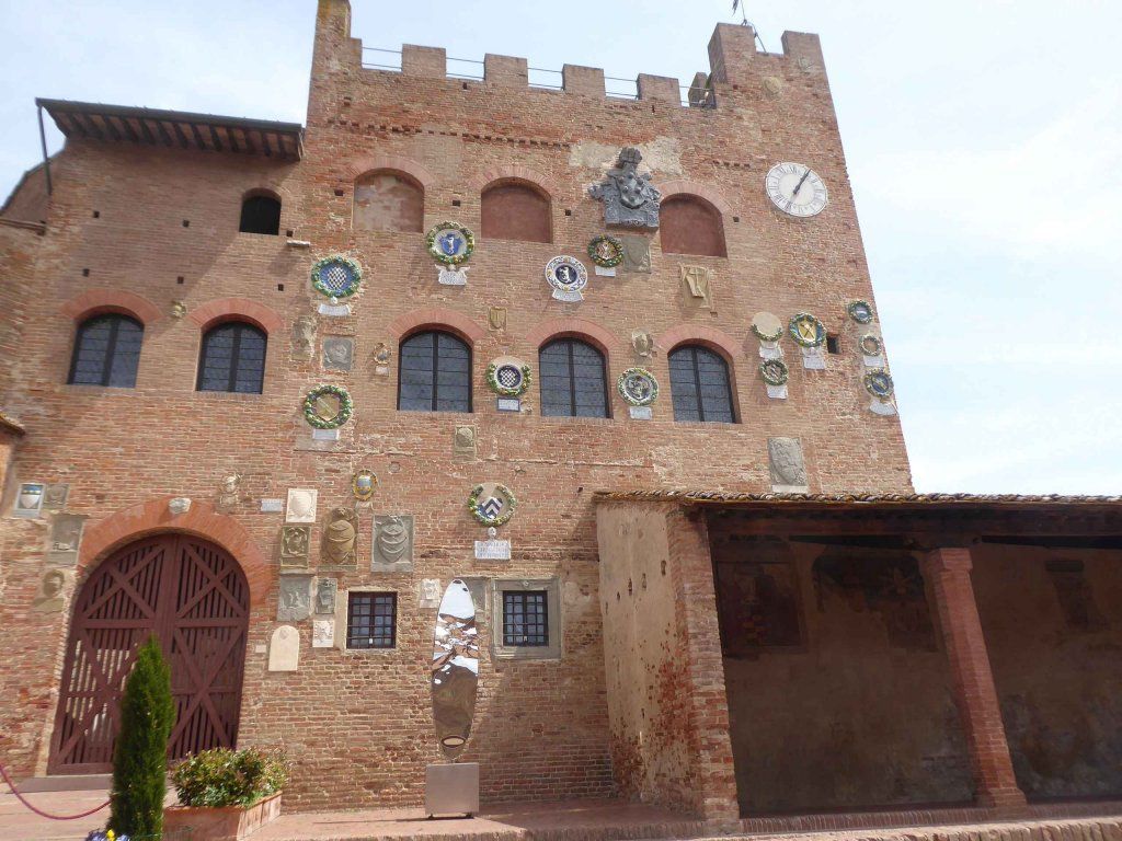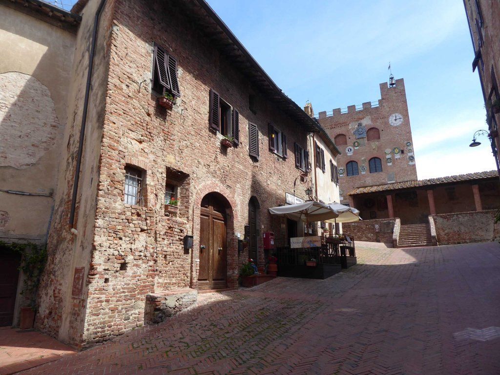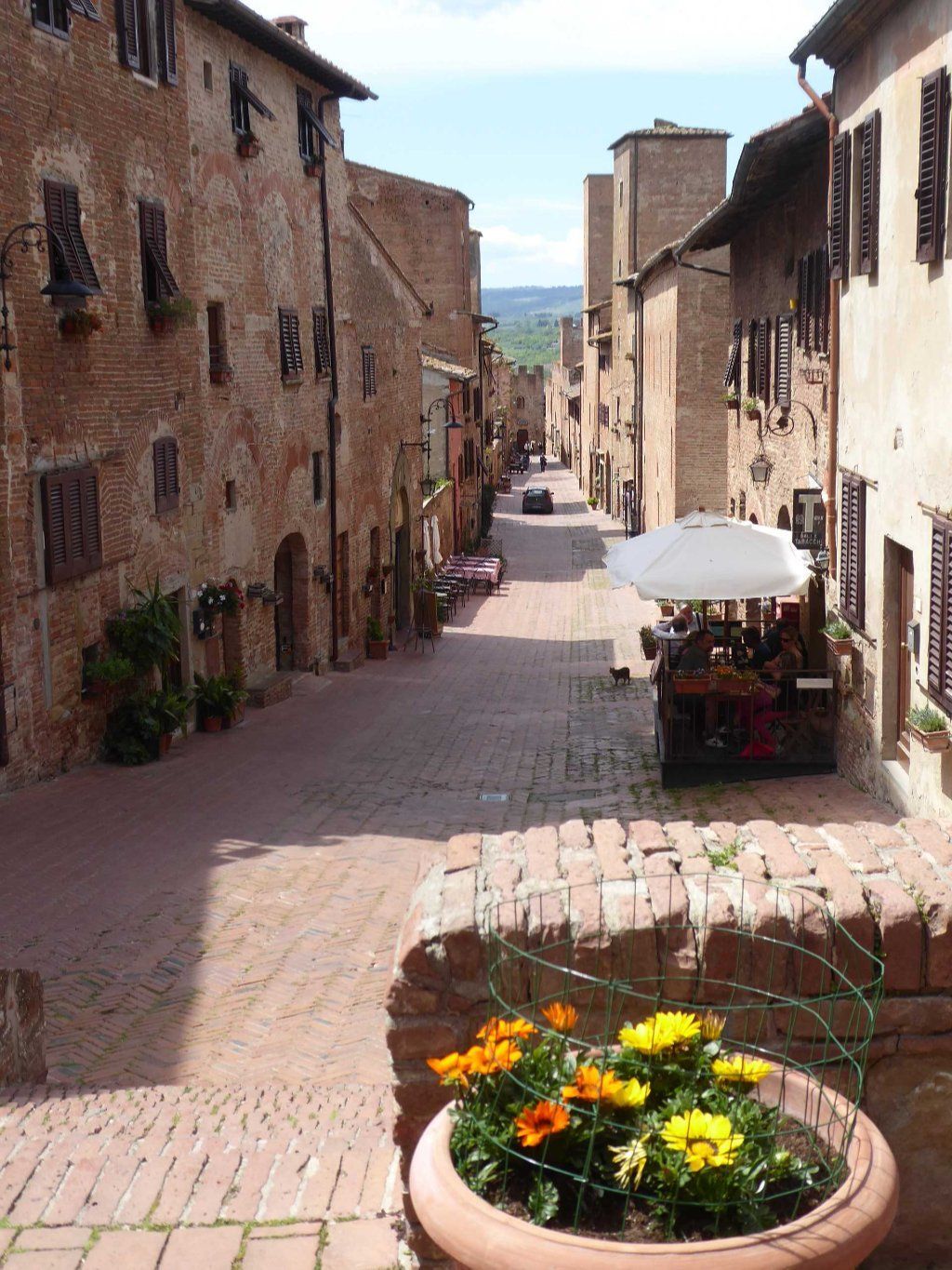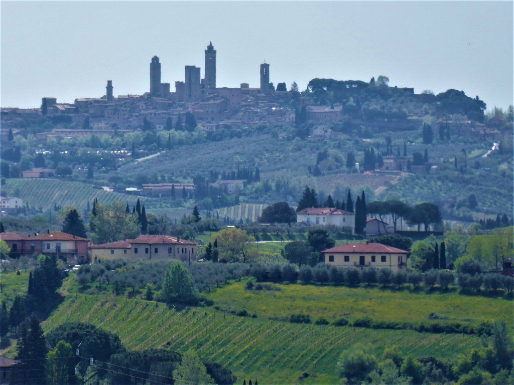 Es hat ganz wenige Touris, nur eine Schulklasse stürmt die Bar und alle kommen Glace schleckend wieder heraus. Giovanni Boccacio (1313-1375) wohnte hier. Das Haus war zerstört und orginalgetreu wieder aufgebaut. Weil bald die Siesta anfängt, stürmen wir durchs Haus vorbei an allen Ausgaben des Decamerone auf den Turm und bewundern die Aussicht übers Land und nach San Giminiano.