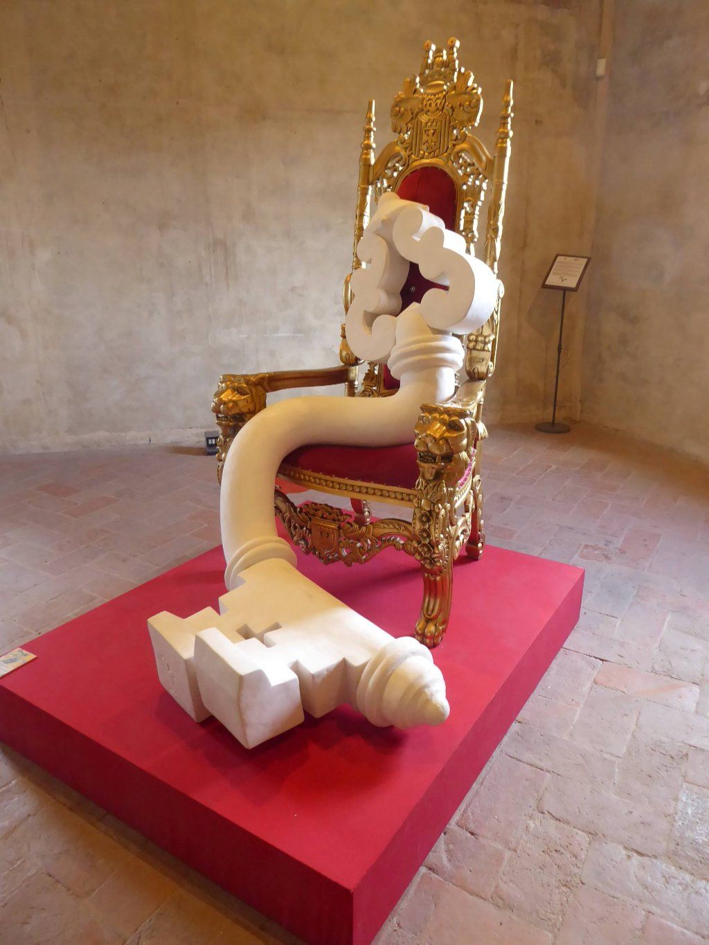 Auch vom Palazzo aus schauen wir übers Land. Besonders gefällt uns die Ausstellung von Milot Alfred Mirashi, einem zeitgenössischen albanischen Künstler, der Schlüssel verbiegt.