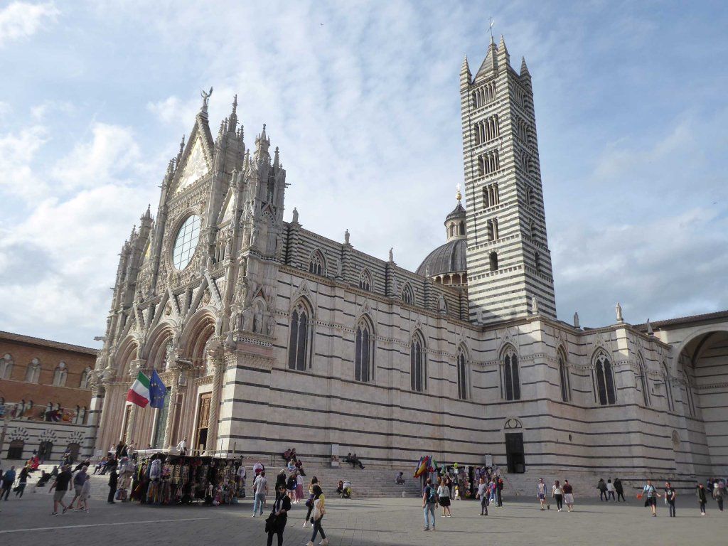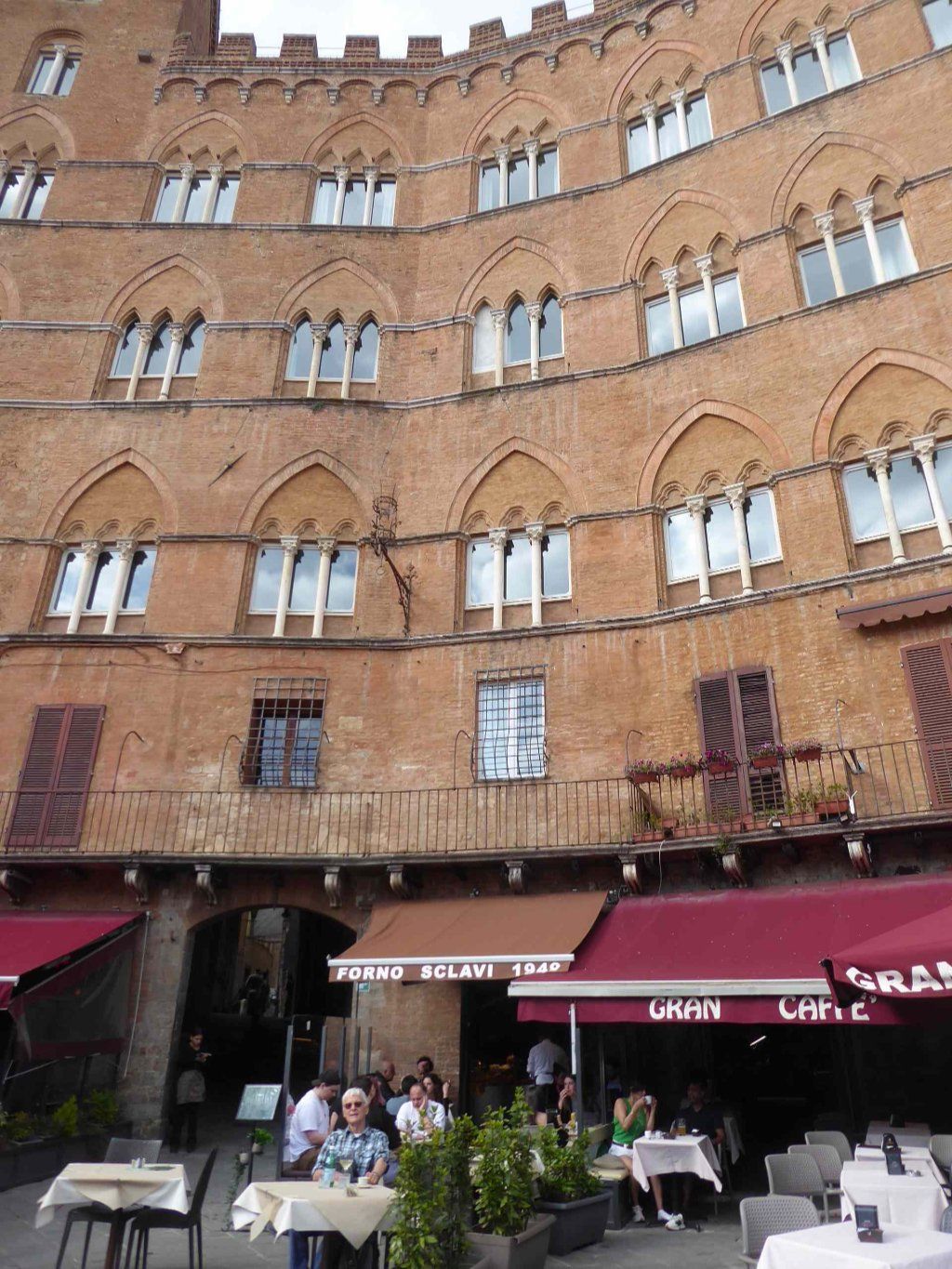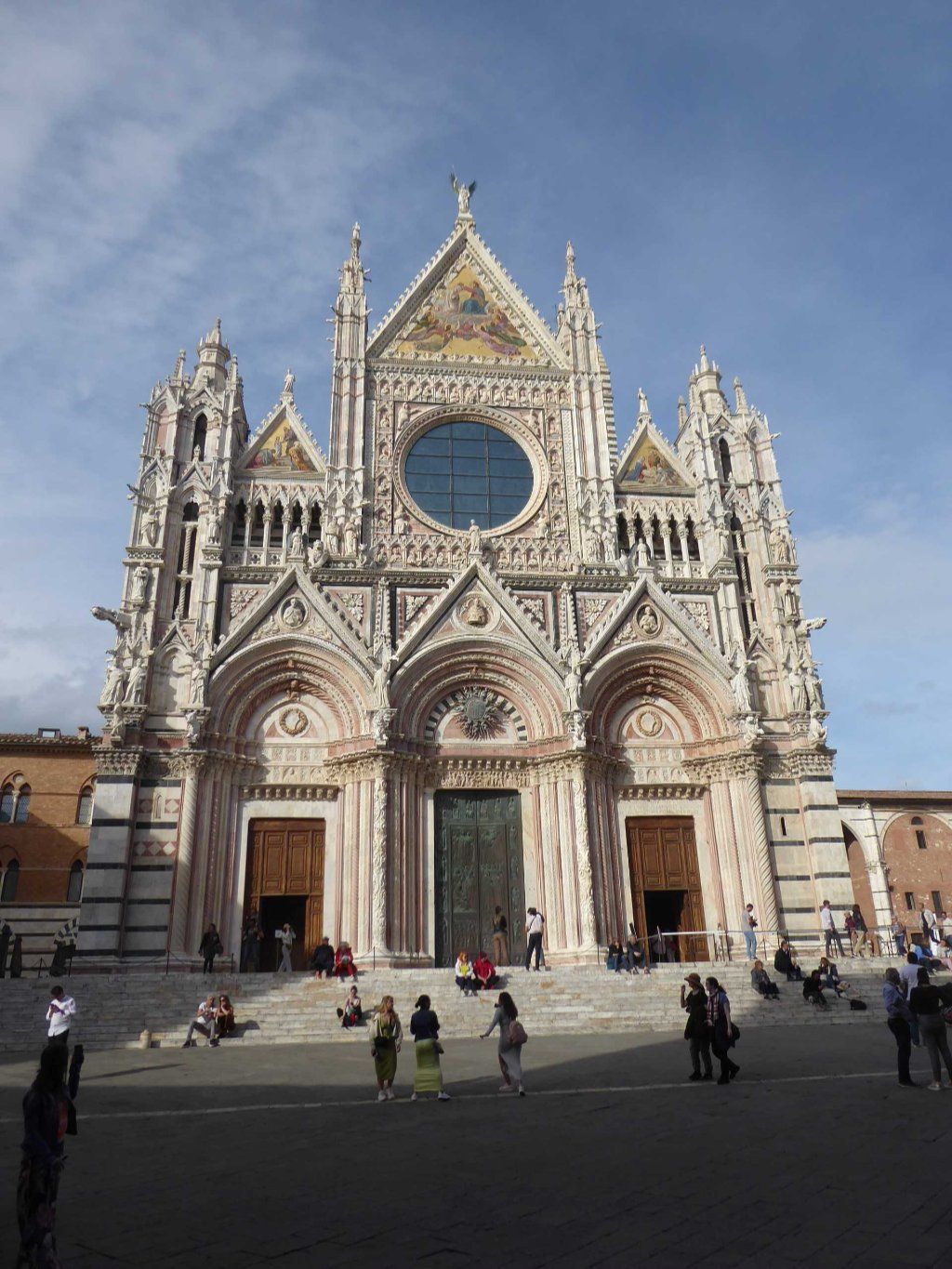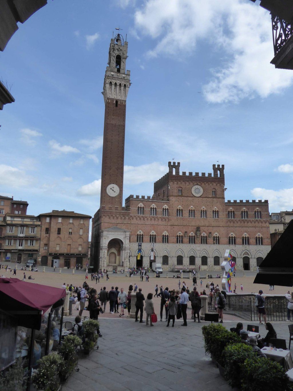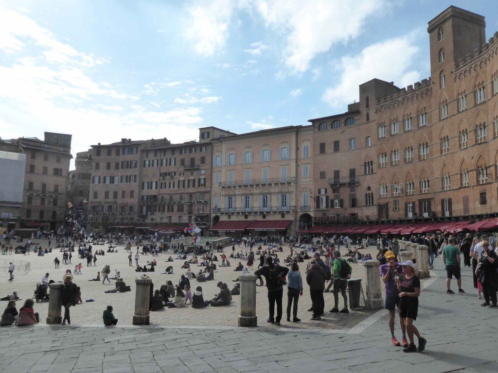 Über lange stöhnende, klopfende und knirschende Rolltreppen gelangen wir wieder in die Oberstadt und streifen mit vielen Touris zum Campo, dem berühmten halbrunden Platz mit dem hohen Turm. Dort trinken wir Kaffee und betrachten das Treiben. Eine Runde um den Dom und dann wieder zum Computerdoktor. Und siehe da der Patient ist genesen. Diagnose: Die Internetverbindung war im Camping so schlecht, dass ein Update nicht fertig abgeschlossen werden konnte. Und da streikt der Laptop einfach! Wir sind ja so erleichtert. Und die Kosten: Null! Wir könnten ja einmal Schweizer Schokolade bringen, die sei sehr fein. Leider haben wir keine dabei.