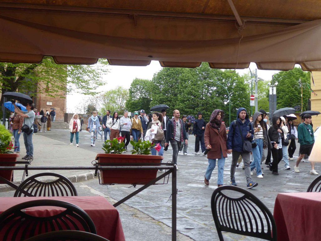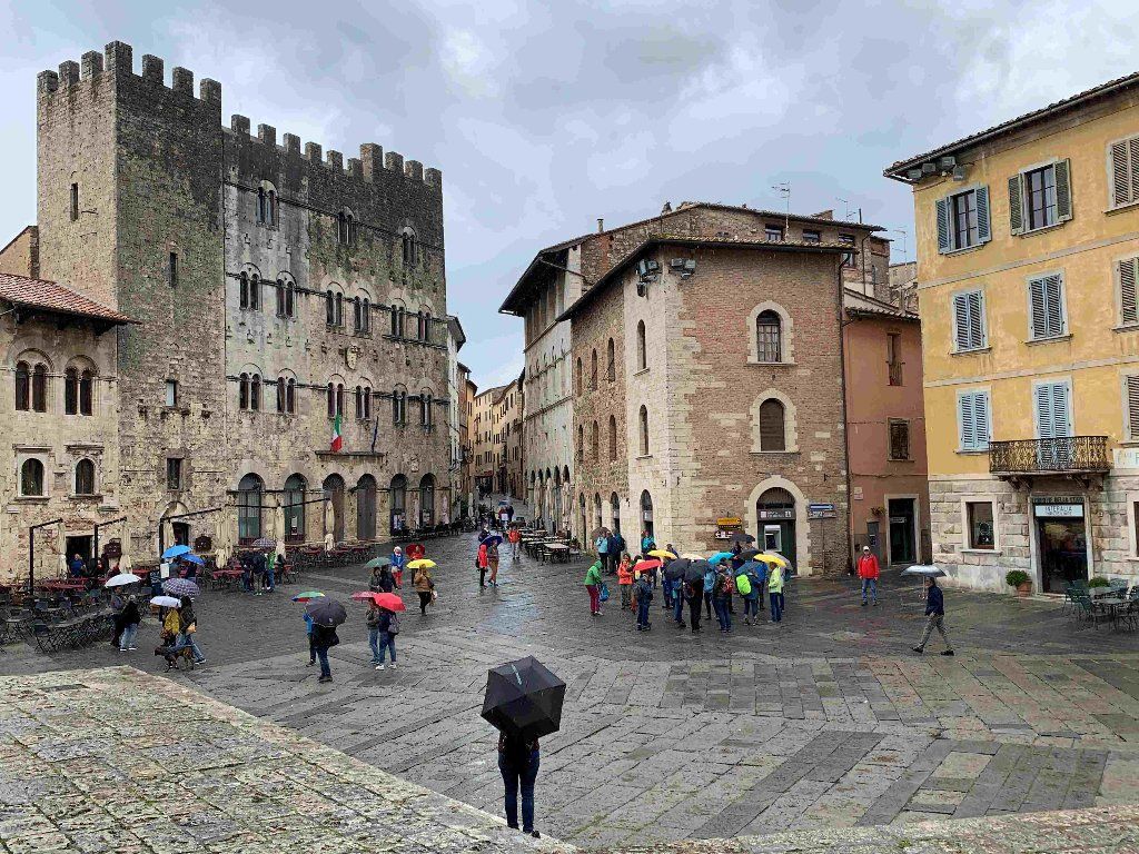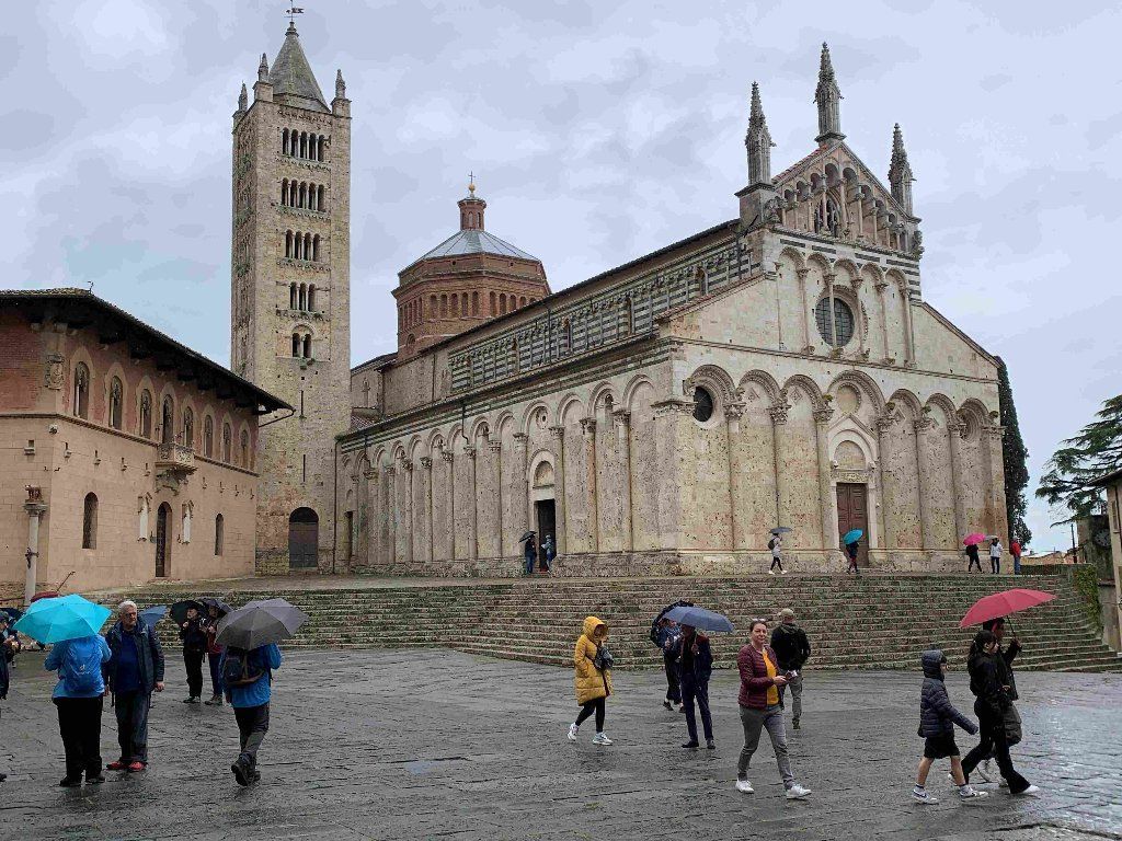 Endlich können wir den ersten Teil unseres Reiseberichts abschliessen. Wir fahren weiter Richtung Piombino weil wir auf die Insel Elba möchten. Leider regnet es, sodass wir die Kirche ohne Dach in San Galgano nicht anschauen, sondern dort den kaputten Wasserhahn im Bad entdecken. Schon lange war es immer feucht ohne ersichtlichen Grund. Als aber auch der Boden nass ist, finden wir die fast sprudelnde Wasserquelle am Hahn. Sie ist mit Tüchern fast nicht aufzuhalten. Vermutlich hatte Eis im Winter den Mischer gesprengt. Wir stellen die Wasserpumpe ab, aber dann ist das Campen echt mühsam. Im Regen besuchen wir Massa Marittima. Die Regenschirme der Schweizergruppe bringt etwas Farbe in den grauen Ort.