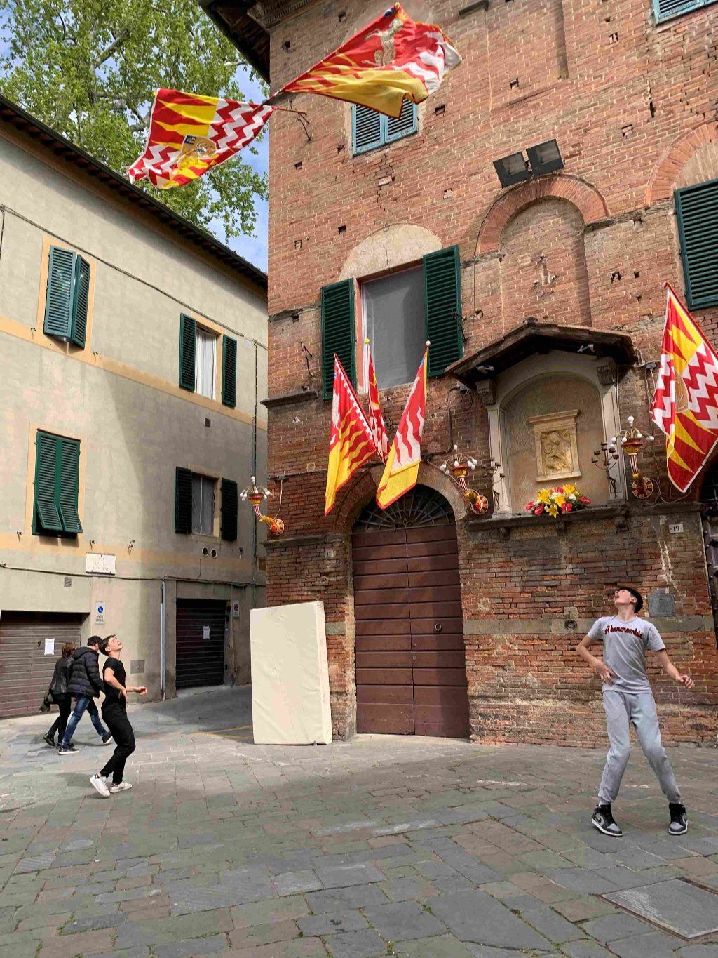 Als wir aus der Kirche kommen, nieselt es. Also ab zum Apero. Wir werden so nett und zuvorkommend bedient, dass auch meine Wut auf die Damen wieder verfliegt. Später entdecken wir auf einem Platz junge Burschen, die Fahnenschwingen üben und andere, die Trommeln stimmen. Das ist fast ein Privatschauspiel, die Vorbereitung auf die Festivitäten vom 1. Mai.