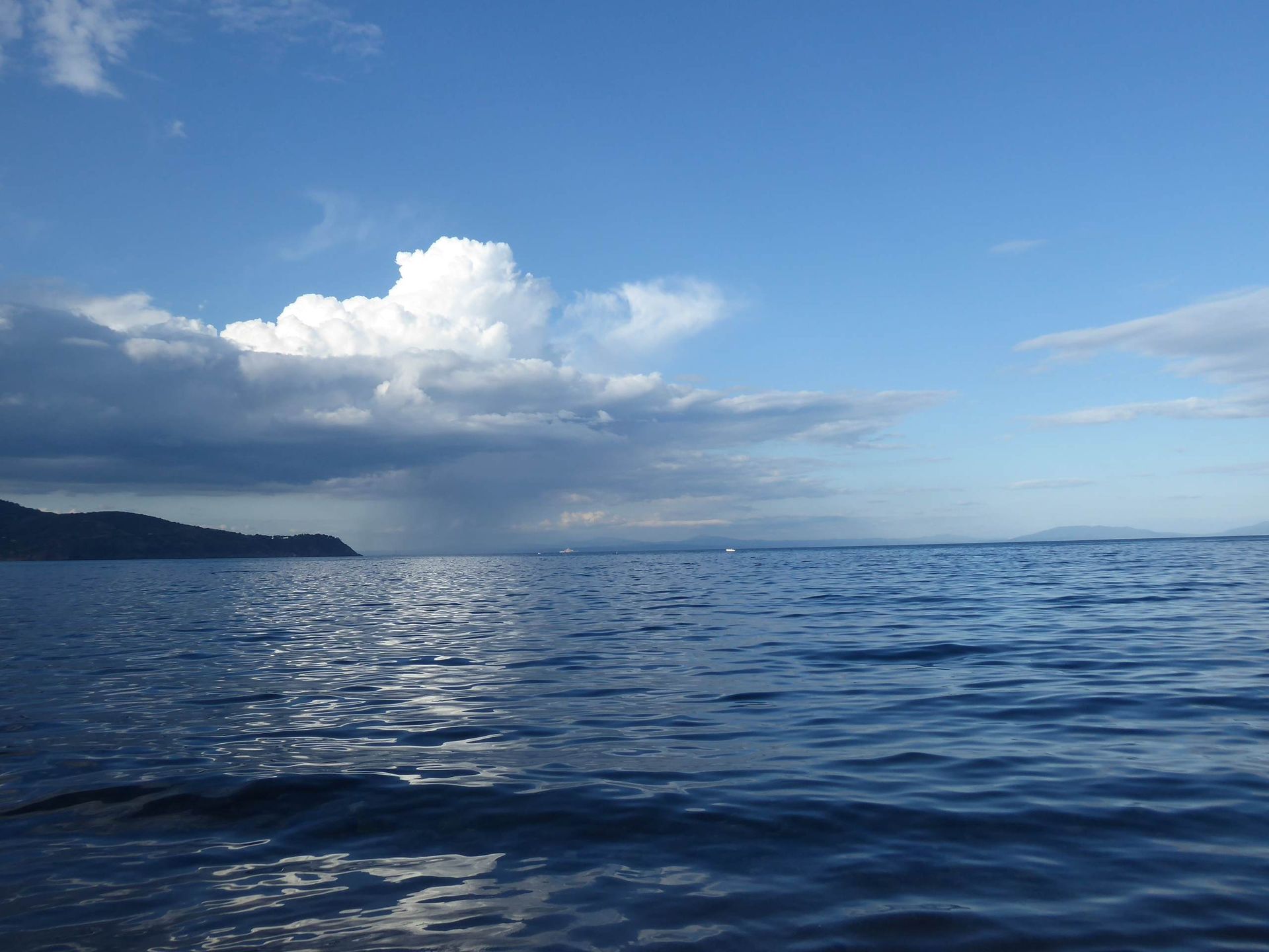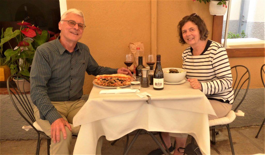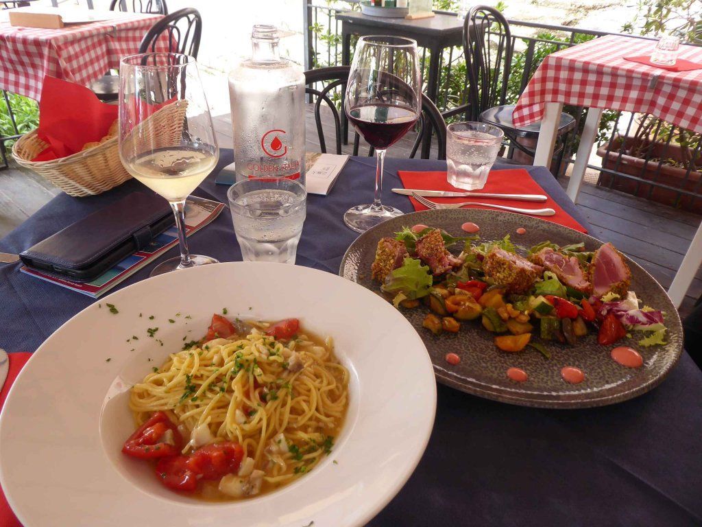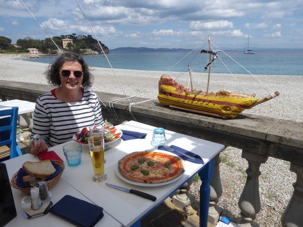 Nach einer ruhigen stündigen Überfahrt nach Rio Marina kurvt Hans nach Cavo, an die nördlichste Landzunge. Direkt am Meer geniessen wir Pizza und Salat.
