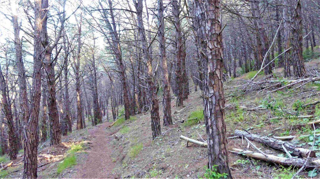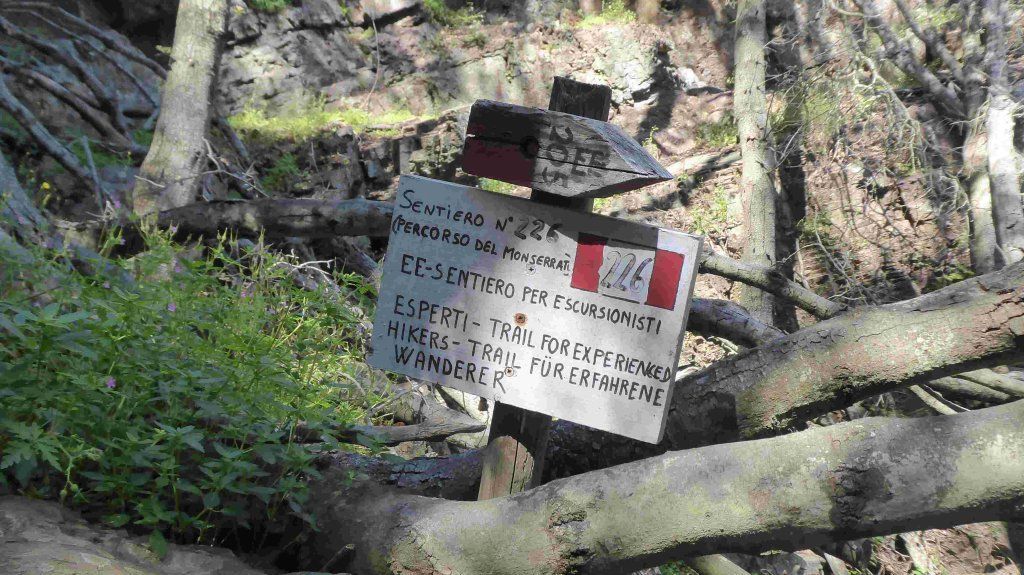 Noch einmal heisst es das Stahlseil zu Hilfe nehmen und zum Pass absteigen. Wir machen eine Pause und trinken Wasser. Von unten sehen wir einen Biker sein Velo an einem Baum parkieren, wohl ein ganz Vergifteter. Den Monte Mar di Capanna lassen wir aus, weil ja auch noch ein Abstieg zu bewältigen ist. Aber der Weg ins Tal erweist sich als „Nasenwasser“, schönes Wegli, flache Serpentinen. Ah, darum kam der Biker so weit. Der Wald sieht schrecklich aus, knochentrocken. Erst weiter unten wird es wieder grüner.
