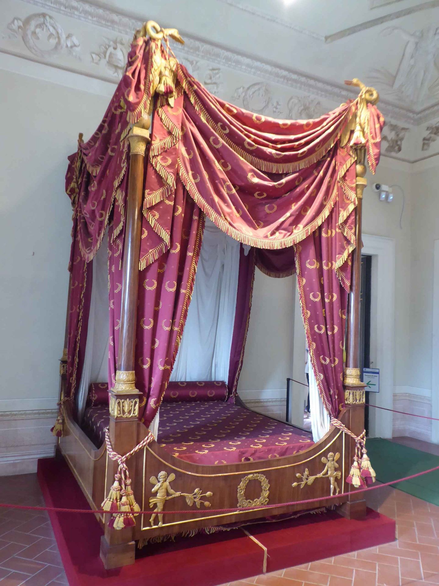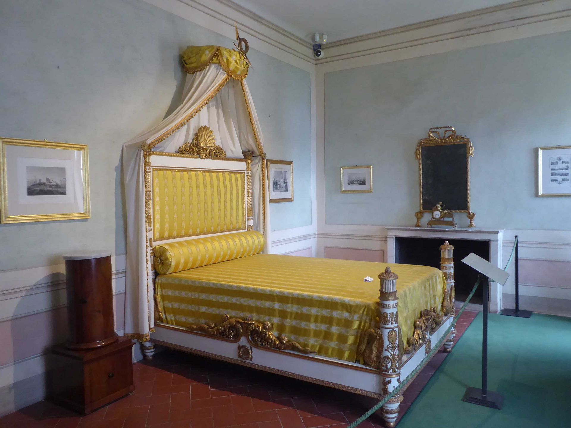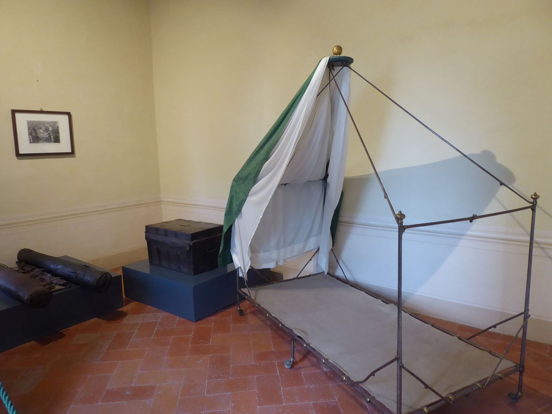 Am nächsten Tag sind wir schon früh unterwegs und fahren zum Weingut Tenuta La Chiusa in Magazzini. Es gibt feinen Wein, den wir in der Trattoria La Scaletta getrunken haben und schöne Sicht auf Portoferraio. Dann stellen wir das Wigwam beim Hafen ab und laufen schnell zur Festung und Villa Mulini hinauf, bald ist Siesta. Hier residierte Napoleon prunkvoller. Im Ballsaal steht ein Prunkbett, das seine Mutter benutzte, wenn sie bei ihm war. Seine Schwester Pauline lebte dort bei ihm und auch die hatte ein tolles Bett. Dagegen nimmt sich sein Feldbett sehr spartanisch aus. Aber er schlief auch nicht viel, besonders in Schlachten gar nicht.