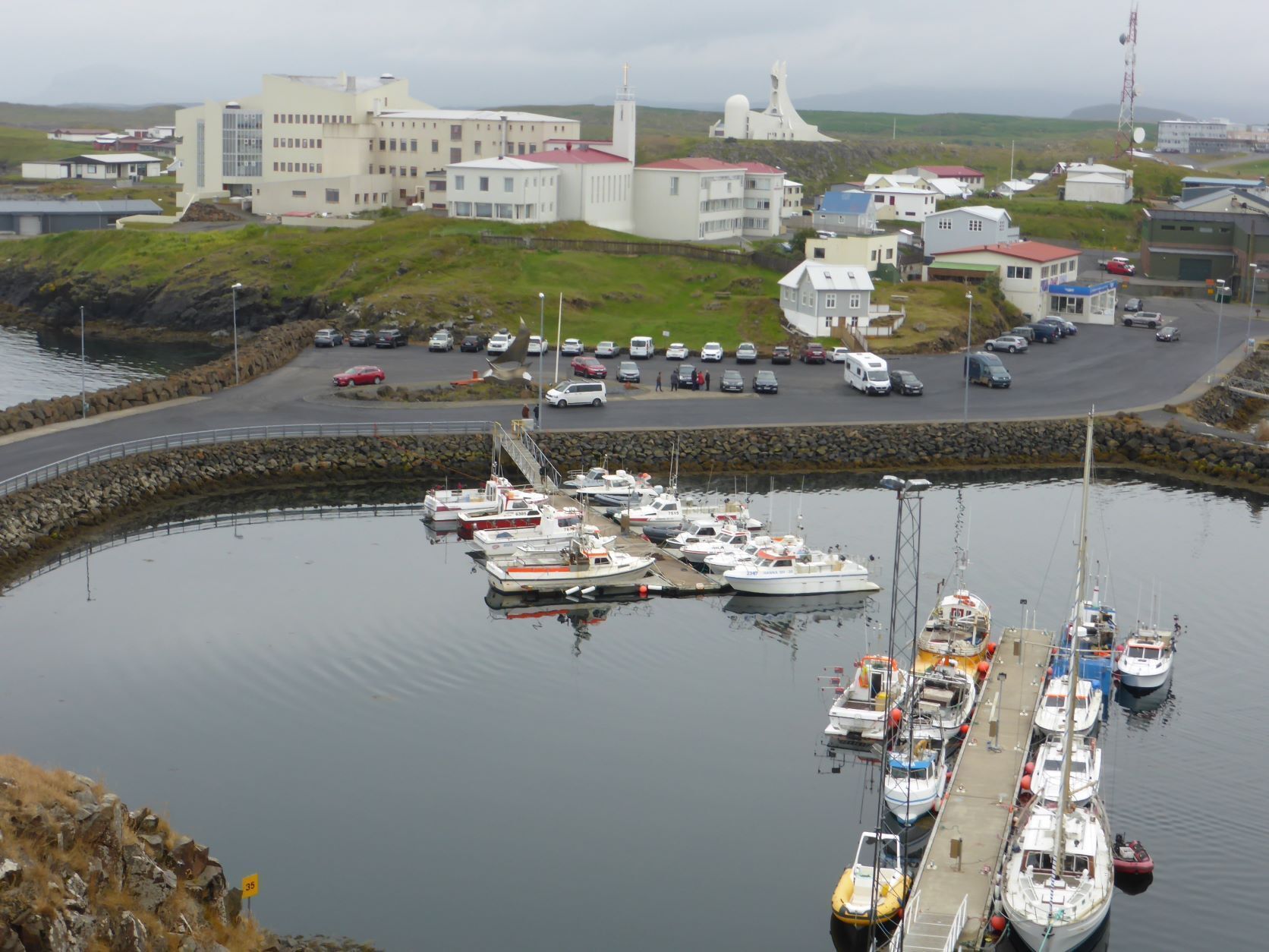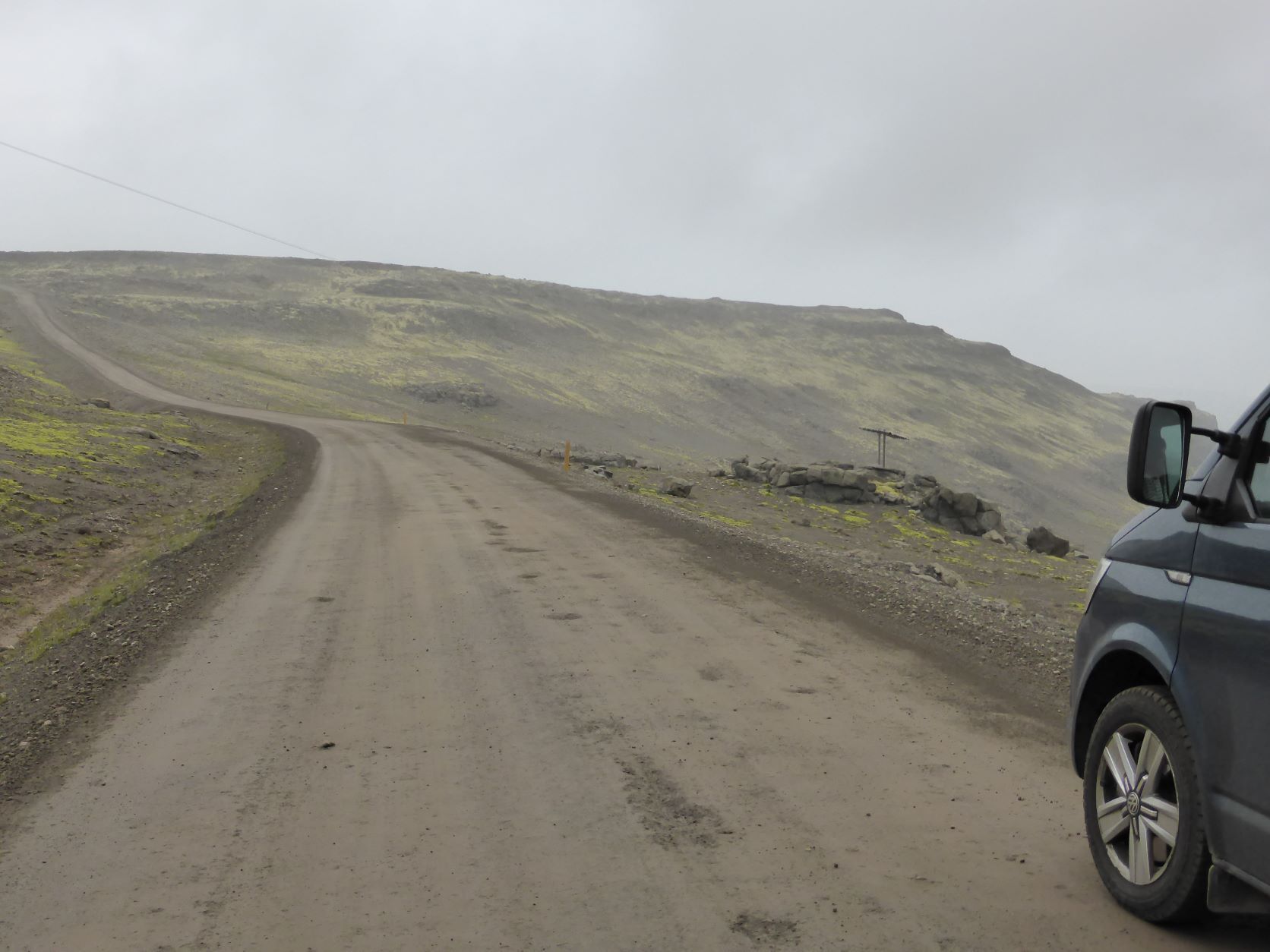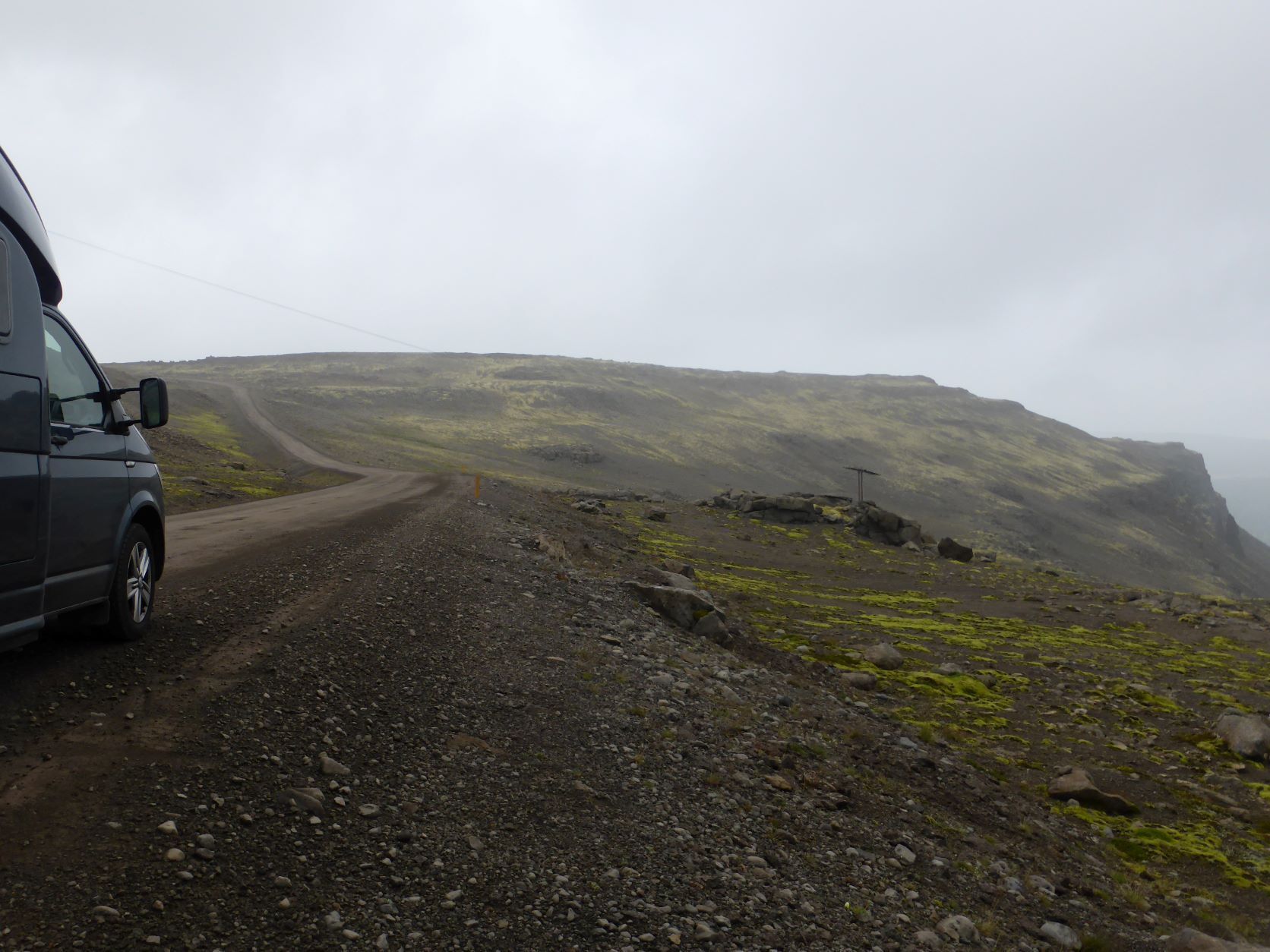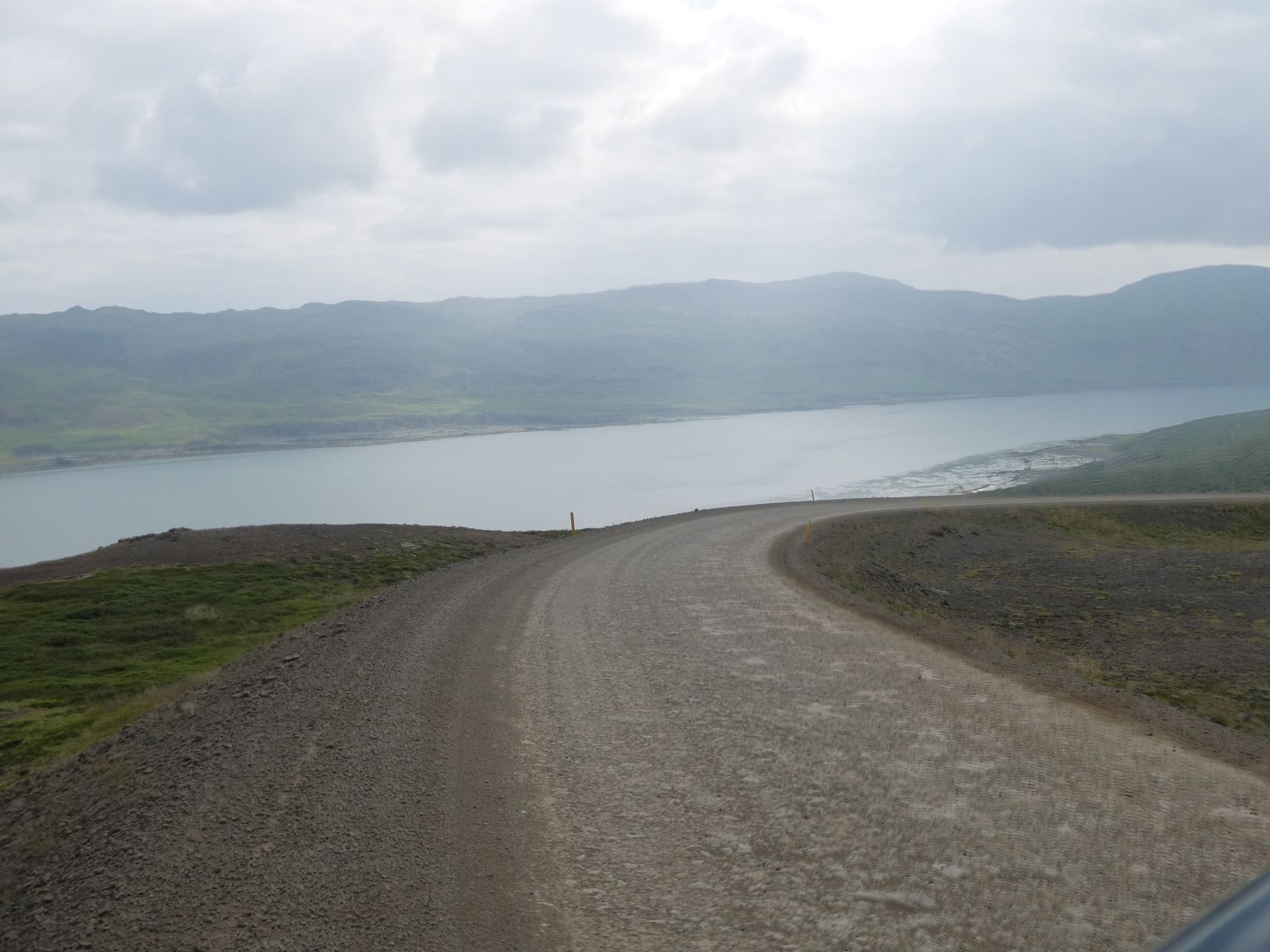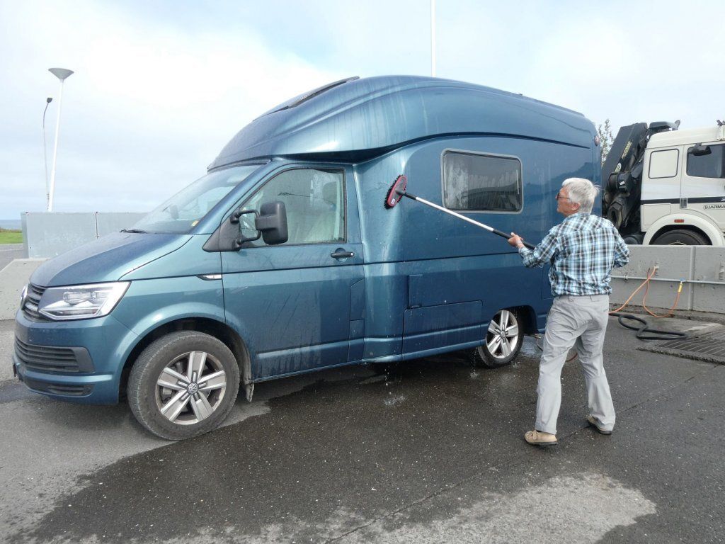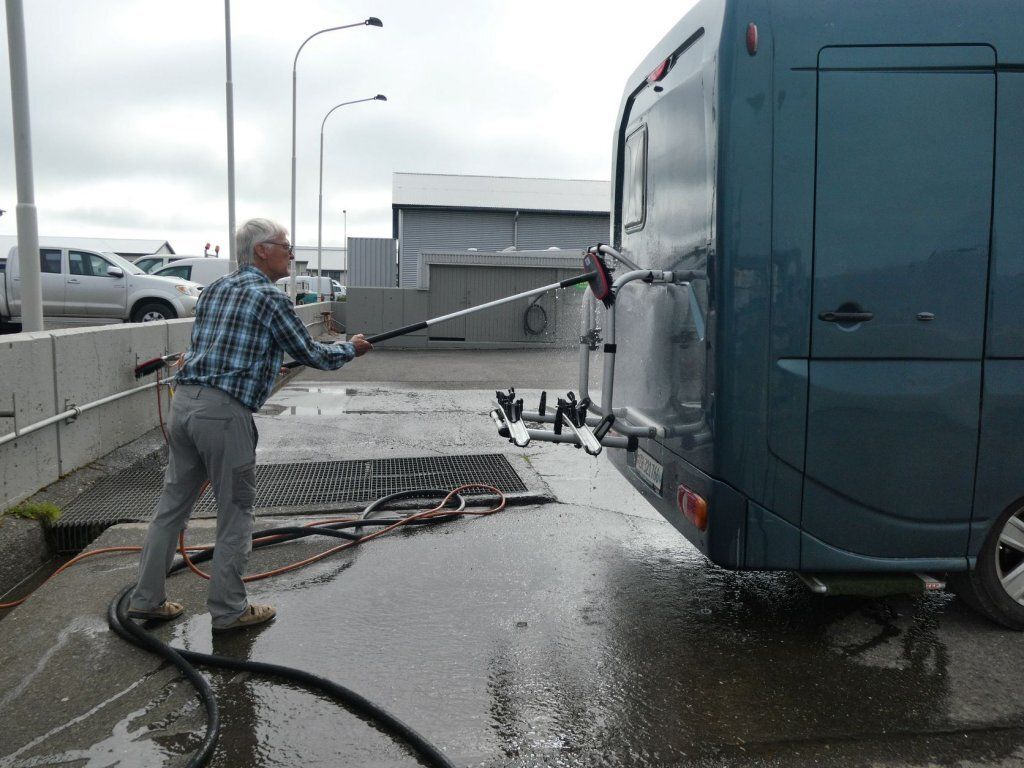 Wir möchten den Gletschervulkan Snaefellsjökull bestaunen. Und weil unser Wigwam schon dreckig und braun betoniert ist, nehmen wir die 67 km Schotterstrasse unter die Räder. Manchmal ist sie ganz gut und bei Waschbrett ist viel angenehmer, wenn man mit etwa 50 km/h darüber brettert. In Stykkisholmur fahren wir an den Hafen und spazieren auf den Hügel. Es gibt eine schöne Sicht auf den Hafen und die kleinen Schären. Nachdem Einkauf waschen wir das Auto. Das kann man in Island an jeder Tankstelle gratis tun - super bei solchen Strassen