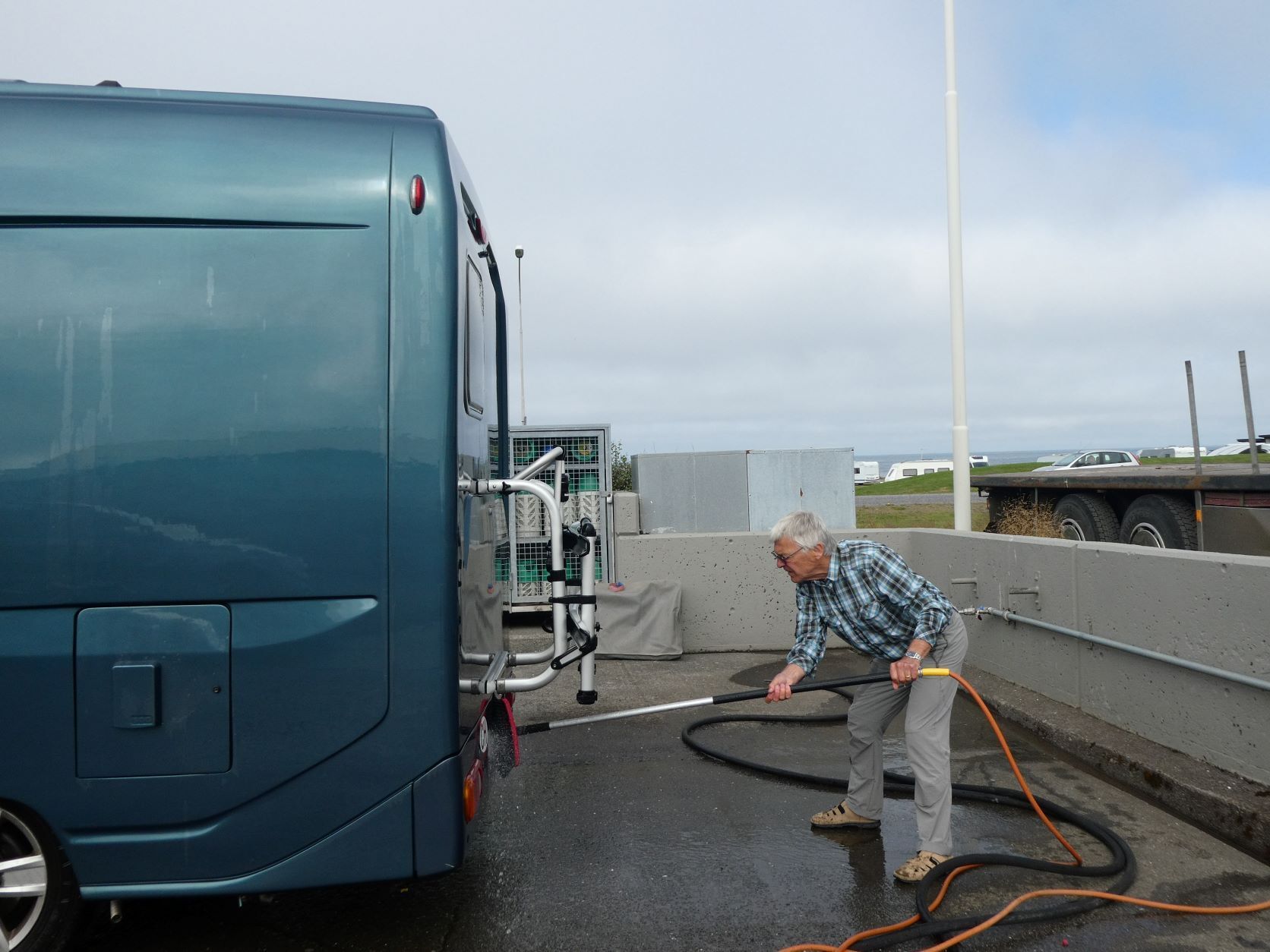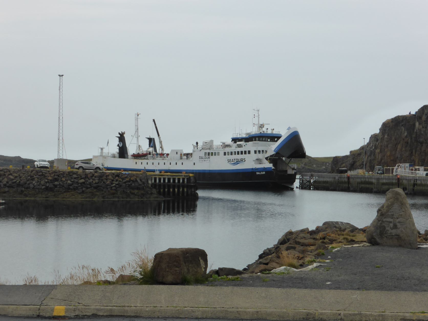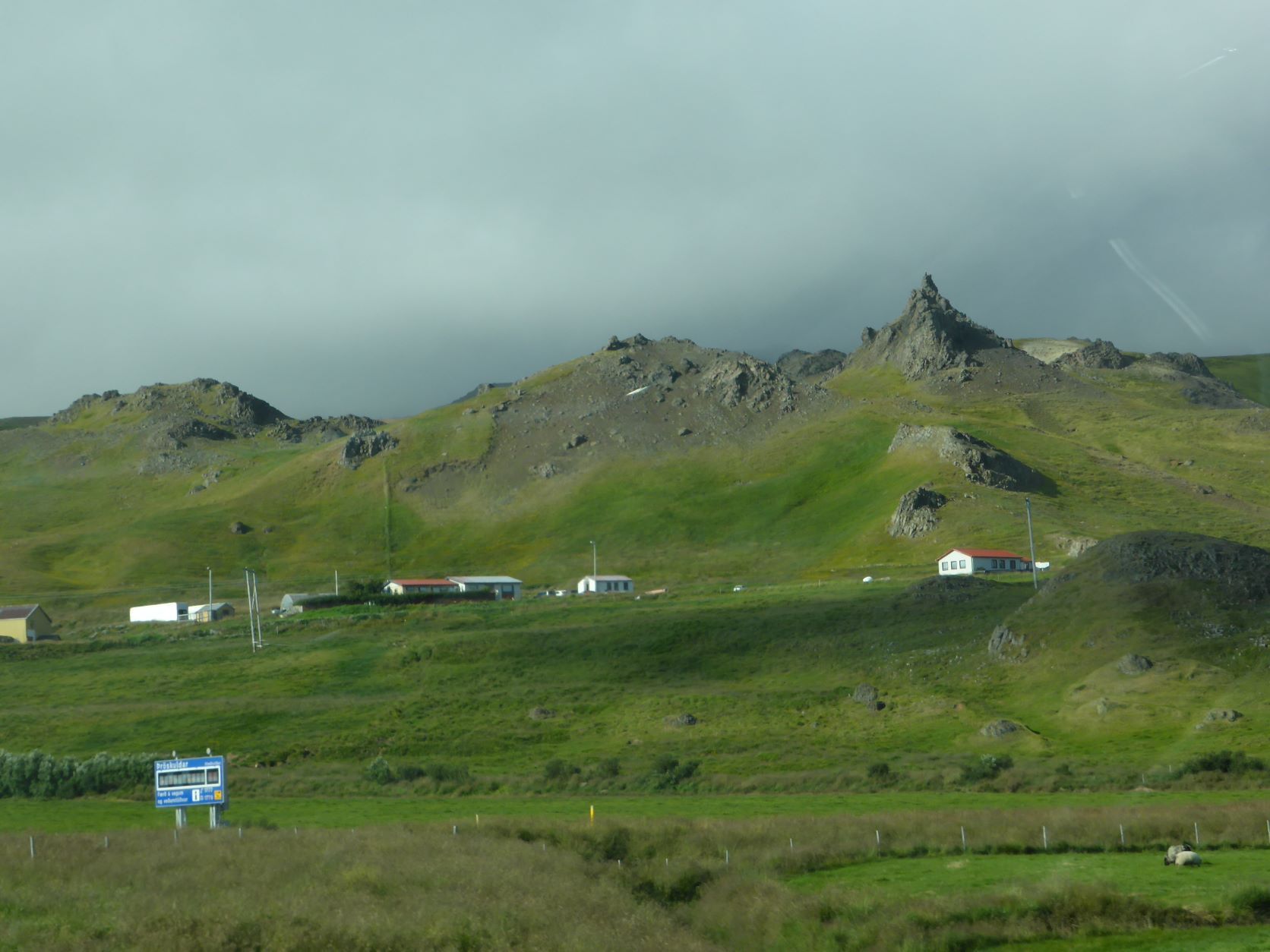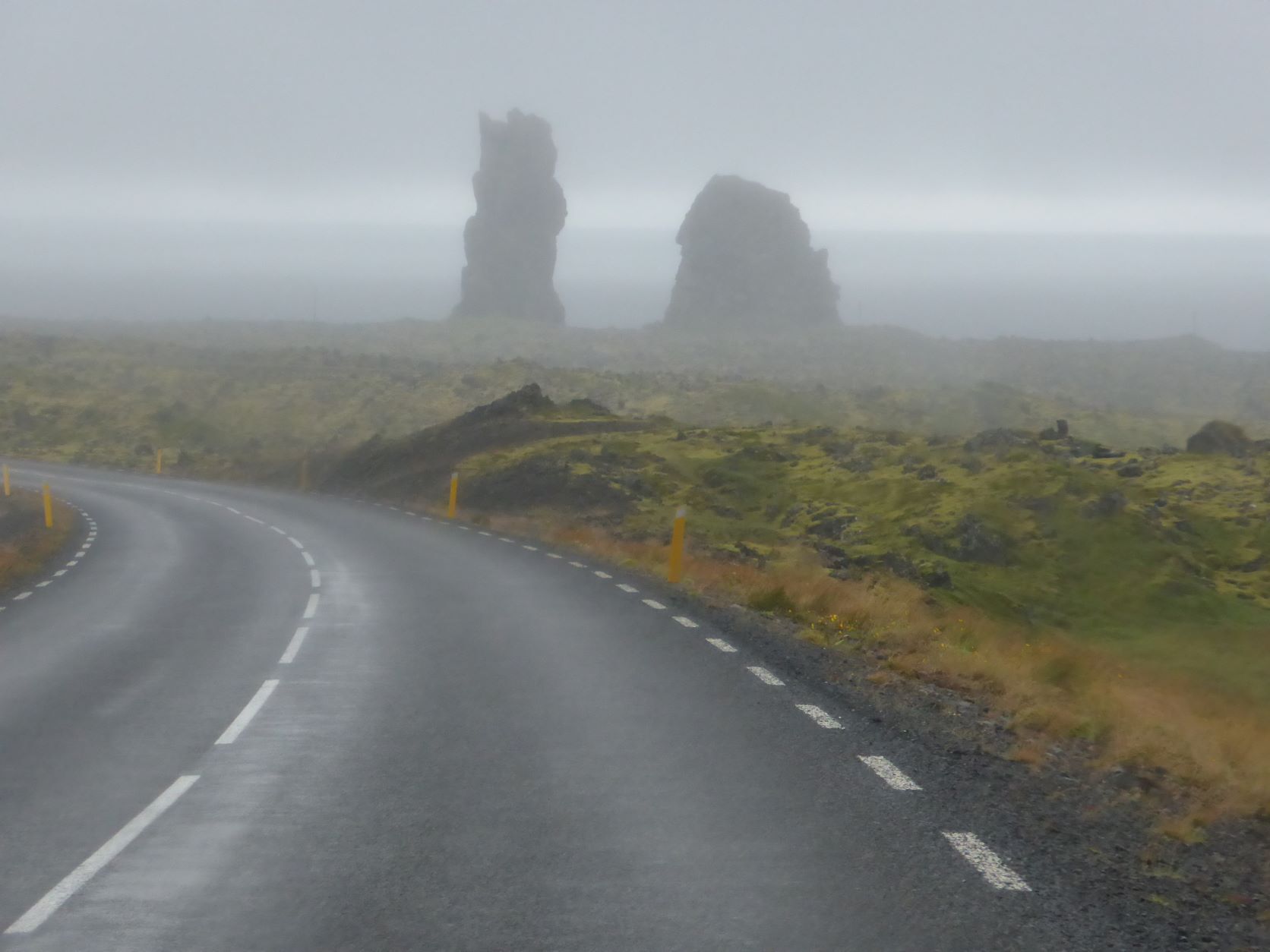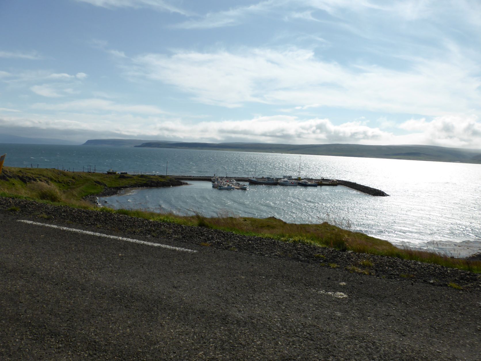 Wir möchten den Gletschervulkan Snaefellsjökull bestaunen. Und weil unser Wigwam schon dreckig und braun betoniert ist, nehmen wir die 67 km Schotterstrasse unter die Räder. Manchmal ist sie ganz gut und bei Waschbrett ist viel angenehmer, wenn man mit etwa 50 km/h darüber brettert. In Stykkisholmur fahren wir an den Hafen und spazieren auf den Hügel. Es gibt eine schöne Sicht auf den Hafen und die kleinen Schären. Nachdem Einkauf waschen wir das Auto. Das kann man in Island an jeder Tankstelle gratis tun - super bei solchen Strassen