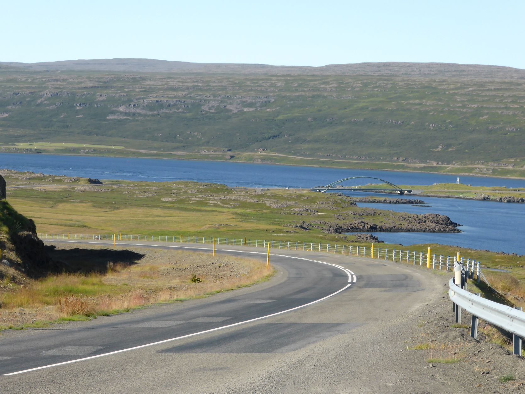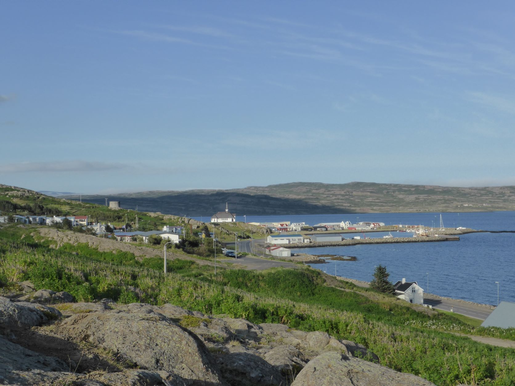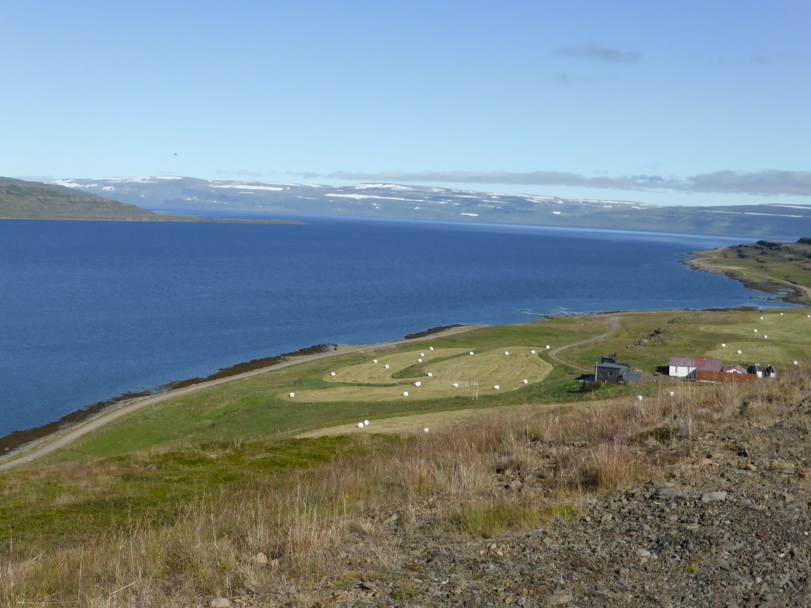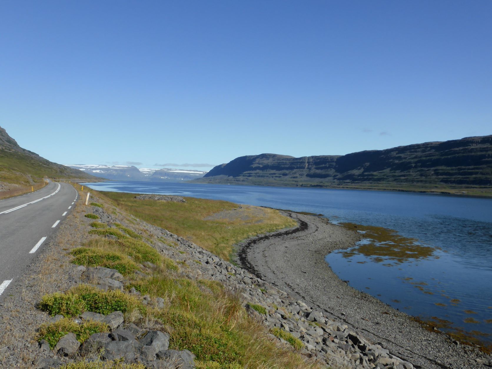 Am Sonntag, 15. August fahren wir zuerst nach Drangsnes. Dort hat es nämlich drei Hotpots direkt an der Strasse und vor dem Kirchturm. Heute sind dort eine bayrische Familie und ein Syrer mit seinem Freund. Wir haben angeregte Gespräche über Politik, Corona und unsere Reisen. Die Steingrimsfjardarheidi ist karg, steinig, weit und einsam. Wir fahren dem Isafjord entlang bis weit nach hinten und wieder nach vorne, die Strasse sieht man immer schon auf der Gegenseite.