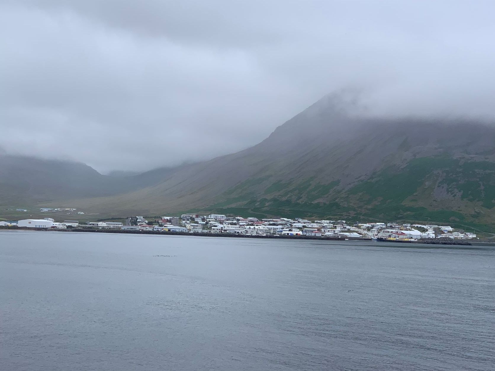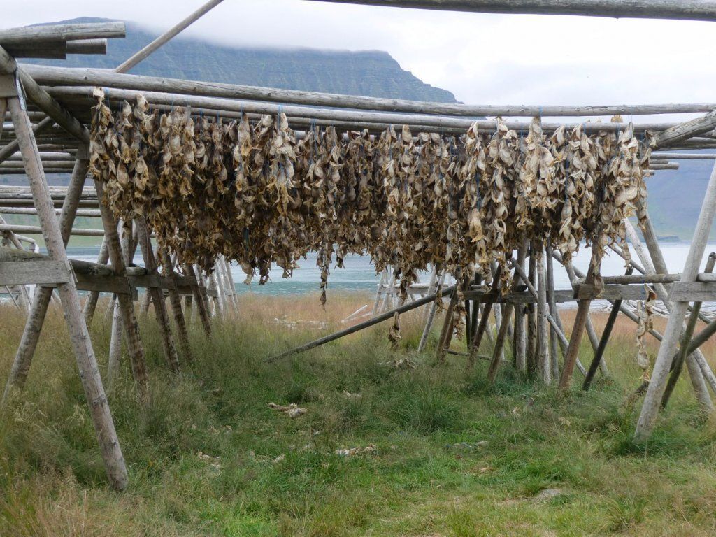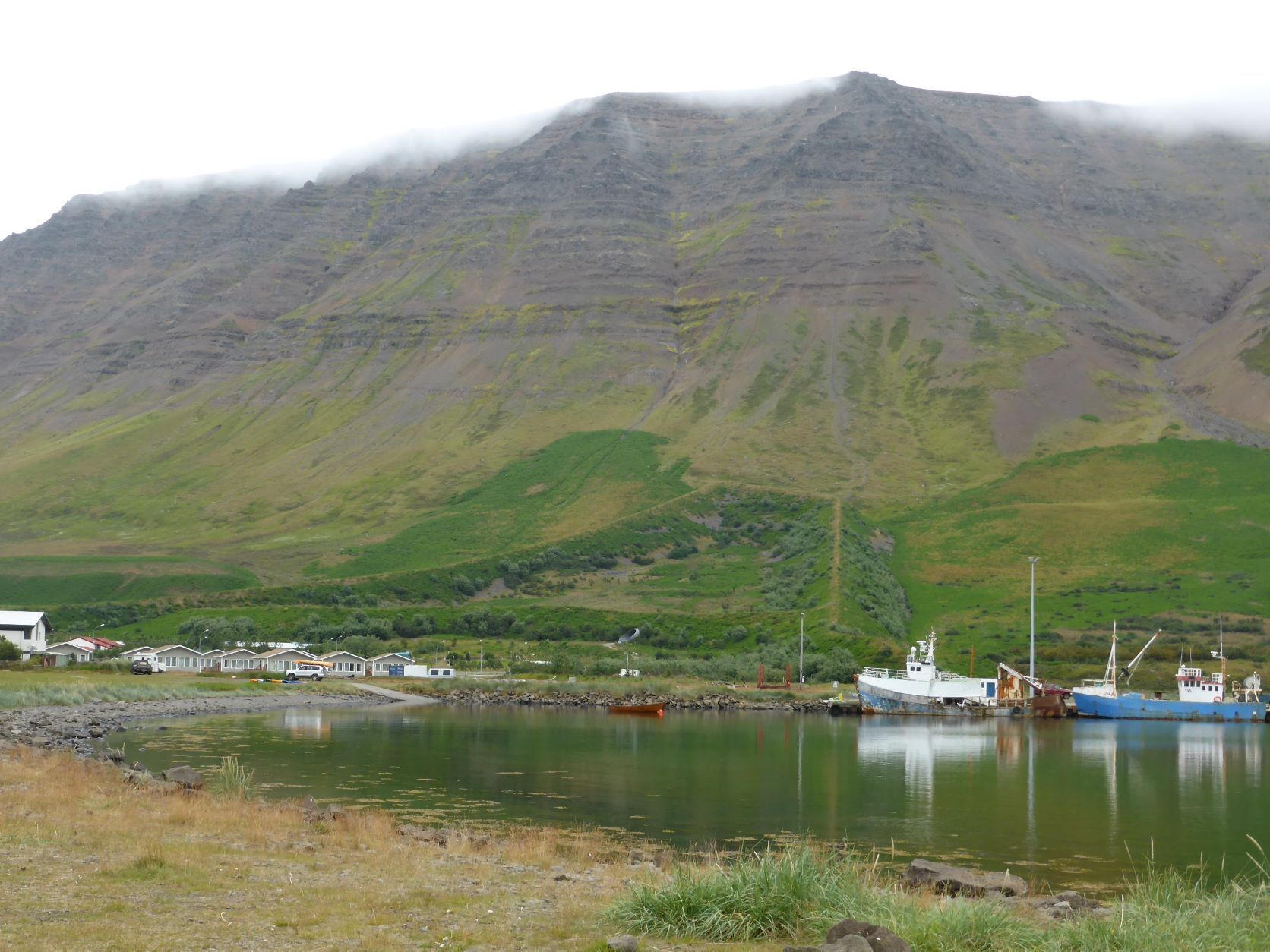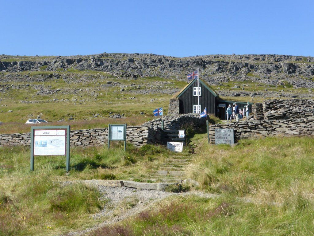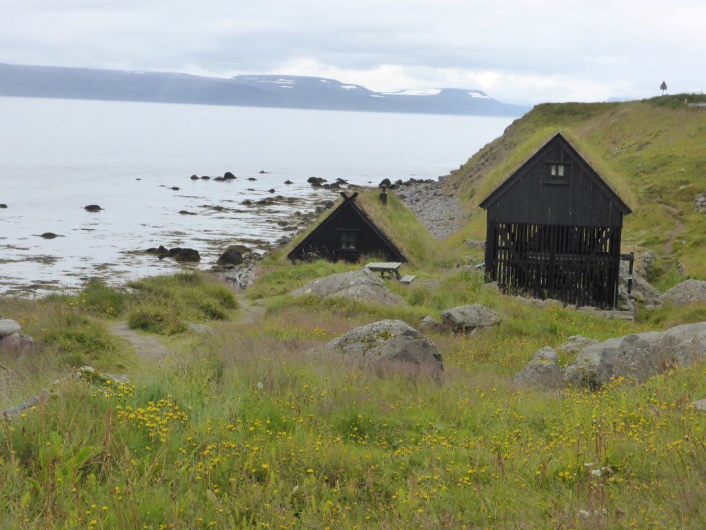 Schon länger wurde schlechtes Wetter angesagt und zum Glück war es immer besser. Die Tage sind um 13-15 Grad, aber mit der Sonne fühlt es sich an wie 20 Grad. Die Nächte sind auch nicht so kalt, nur etwa 2-3 Grad kühler. Aber heute Morgen sitzt der Nebel direkt auf unseren Köpfen. Nach einer Runde duch Isafjördur, die Kirche natürlich geschlossen, fahren wir nach Bolungarvik mit dem ältesten Hafen der Westfjorde. Aber es ist kalt und nass und das Freilichtmuseum mit den 3 Hütten verlassen, so fahren wir durch den grossen modernen Tunnel zurück und weiter noch durch einen Tunnel und die Breidadalsheidi nach Flateyri. Zuerst besuchen wir das Bryggjukaffi. Hans isst einen Bagel und ich wage das Experiment einer Fischsuppe. Sie ist ausgezeichnet. Das Dorf ist auch ein Freilichtmuseum, das harte Leben der Menschen Im Fisch Ende 19. und anfangs 20 Jh. ist sogar auf deutsch beschrieben. Im ältesten Laden und Handelsplatz ist heute ein Buchantiquariat eingerichtet. Die Leute bringen ihre gelesenen Bücher und können für 100ISK 1kg Bücher kaufen. Leider gibt es nur isländische. Aber da entdecken wir auch einen Stand mit neuen und sOgar deutschen. Also kaufen wir ein isländisches Kochbuch, ein Geschichtsbuch und ein Vogelbuch, allerdings für viel mehr als 100Kroner. Es ist ein Erlebnis.
