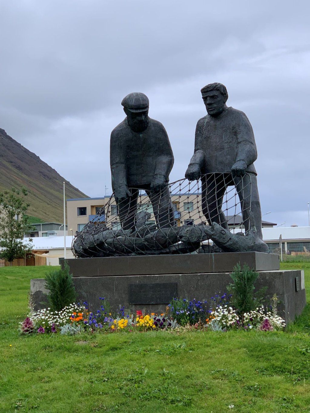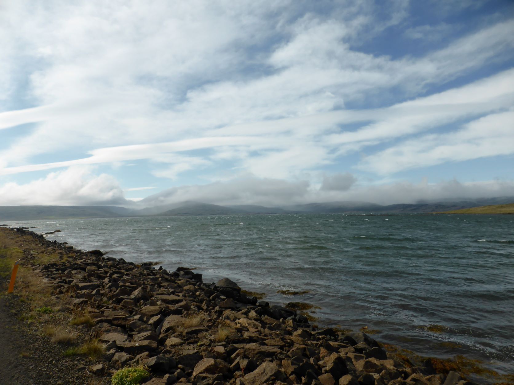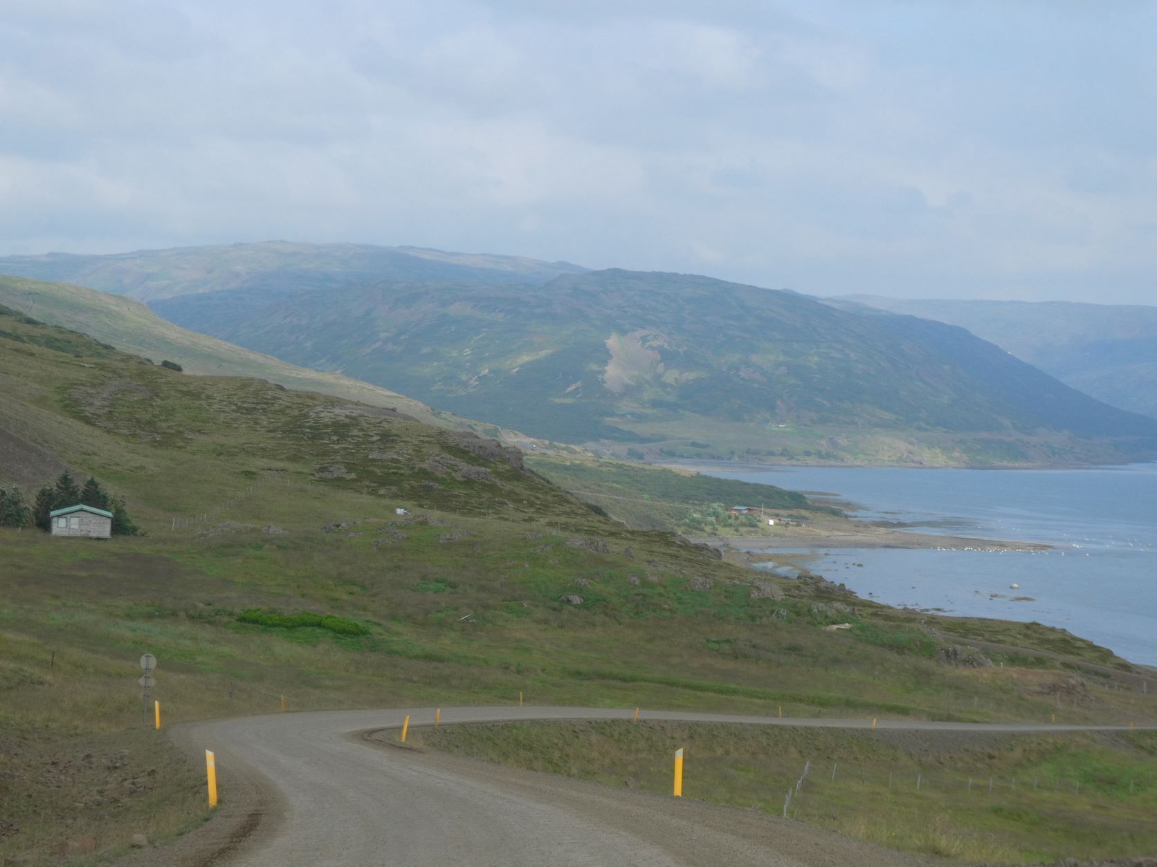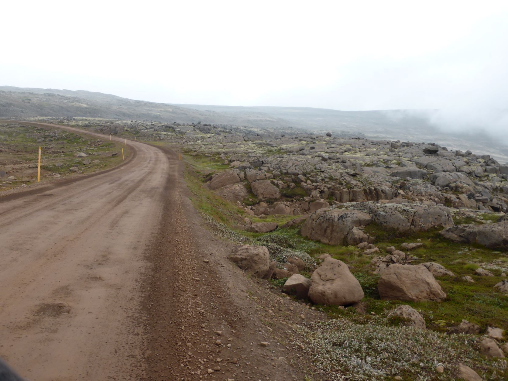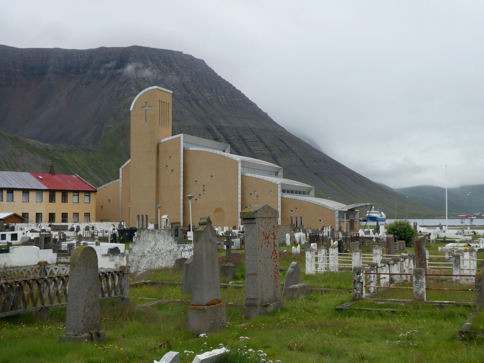 Schon länger wurde schlechtes Wetter angesagt und zum Glück war es immer besser. Die Tage sind um 13-15 Grad, aber mit der Sonne fühlt es sich an wie 20 Grad. Die Nächte sind auch nicht so kalt, nur etwa 2-3 Grad kühler. Aber heute Morgen sitzt der Nebel direkt auf unseren Köpfen. Nach einer Runde duch Isafjördur, die Kirche natürlich geschlossen, fahren wir nach Bolungarvik mit dem ältesten Hafen der Westfjorde. Aber es ist kalt und nass und das Freilichtmuseum mit den 3 Hütten verlassen, so fahren wir durch den grossen modernen Tunnel zurück und weiter noch durch einen Tunnel und die Breidadalsheidi nach Flateyri. Zuerst besuchen wir das Bryggjukaffi. Hans isst einen Bagel und ich wage das Experiment einer Fischsuppe. Sie ist ausgezeichnet. Das Dorf ist auch ein Freilichtmuseum, das harte Leben der Menschen Im Fisch Ende 19. und anfangs 20 Jh. ist sogar auf deutsch beschrieben. Im ältesten Laden und Handelsplatz ist heute ein Buchantiquariat eingerichtet. Die Leute bringen ihre gelesenen Bücher und können für 100ISK 1kg Bücher kaufen. Leider gibt es nur isländische. Aber da entdecken wir auch einen Stand mit neuen und sOgar deutschen. Also kaufen wir ein isländisches Kochbuch, ein Geschichtsbuch und ein Vogelbuch, allerdings für viel mehr als 100Kroner. Es ist ein Erlebnis.