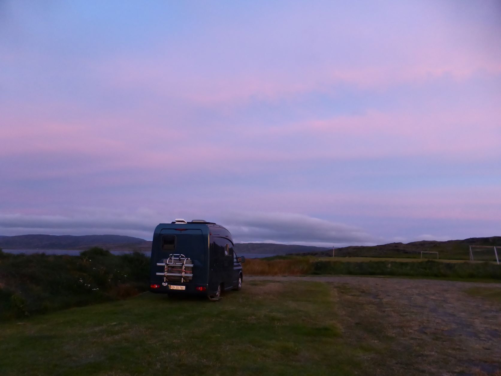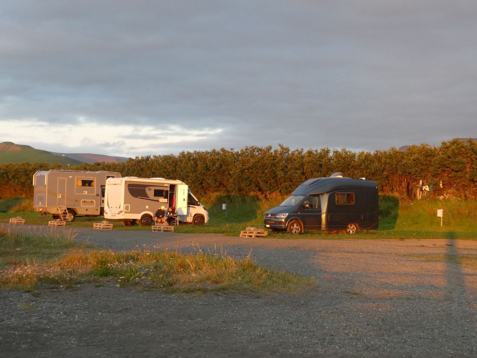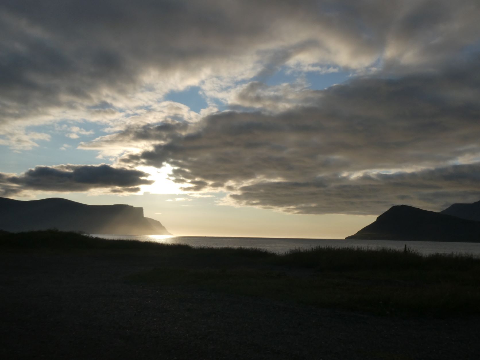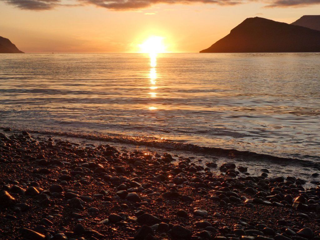 Nachdem Hans so geschwärmt hat von Pingeyri, fahren wir also hin. Es ist ein Platz genau nach unserem Gusto: direkt am Meer und direkt hinter dem Schwimmbad. In Island gibt es in ganz vielen Dörfern, auch ganz kleinen Schwimmbäder mit einem kleinen Schwimmbecken und vor allem 2-3 Hotpots, zwischen 36 und 40 Grad und ein kaltes Becken. Also die haben es uns angetan. Einen Camping wählen wir oft mit Bad, auch mangels Sauna und Erlebnisse bieten alle. Traumhafter Sonnenuntergang.