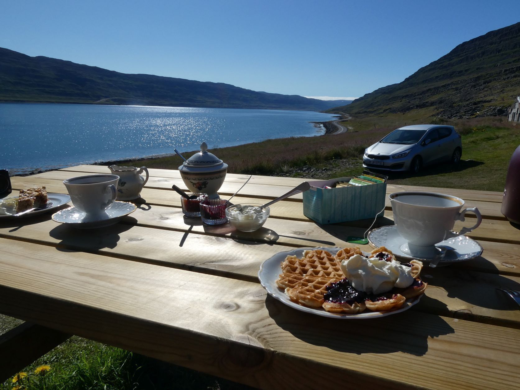 Am 16. August geht die Fahrt weiter nach Isafjördur. Immer wieder rufen wir Ah und Oh, weil die Landschaft einfach atemberaubend ist. In Litlibaer, dem Ort mit kleinen Beeren, früher ein Bauernhof mit gegen 20 Bewohnern, heute Café, gibt es feine Waffel, mit Rhabarber- und Heidelbeerkonfi, Rahm und einfach traumhafter Aussicht