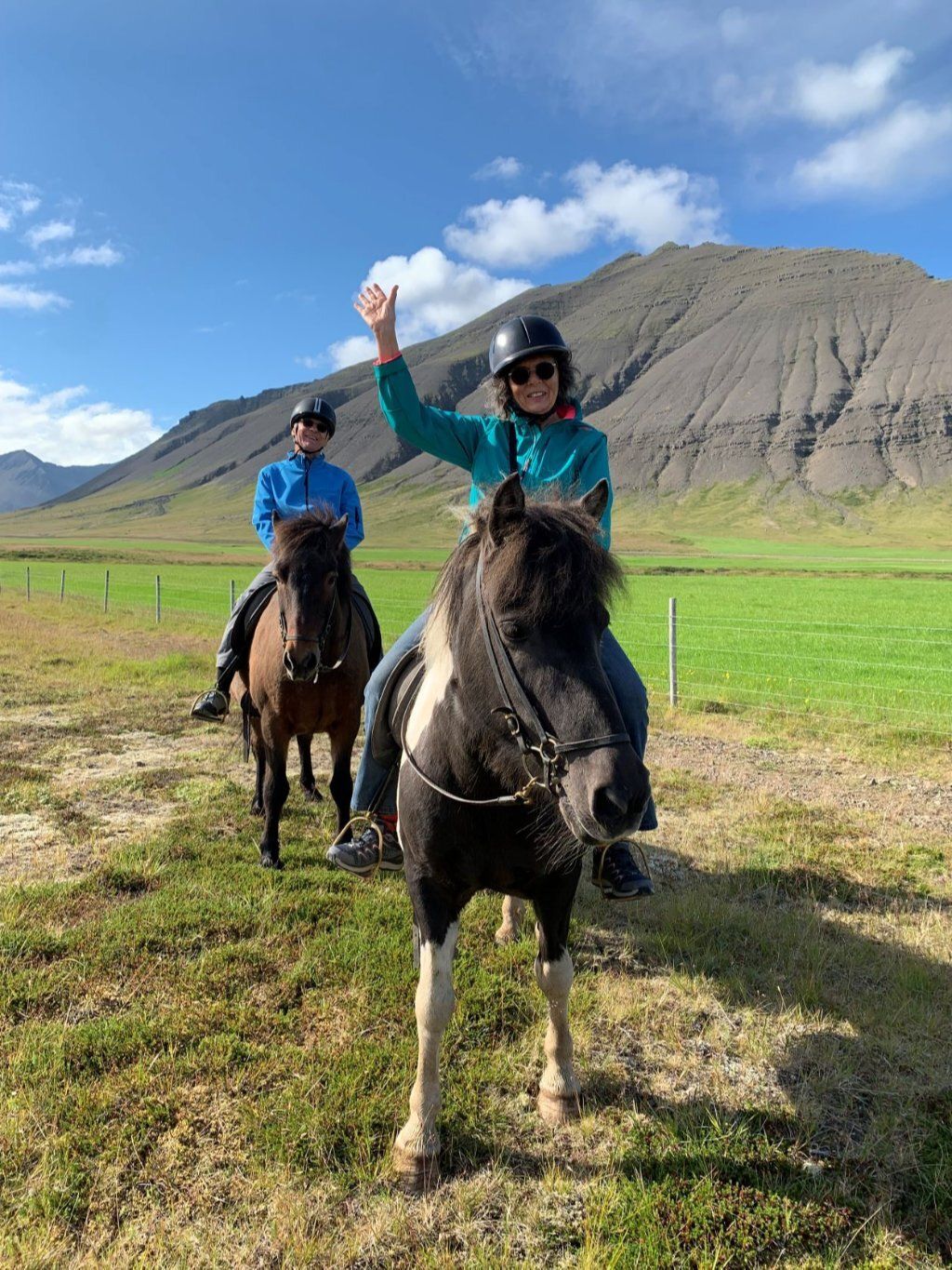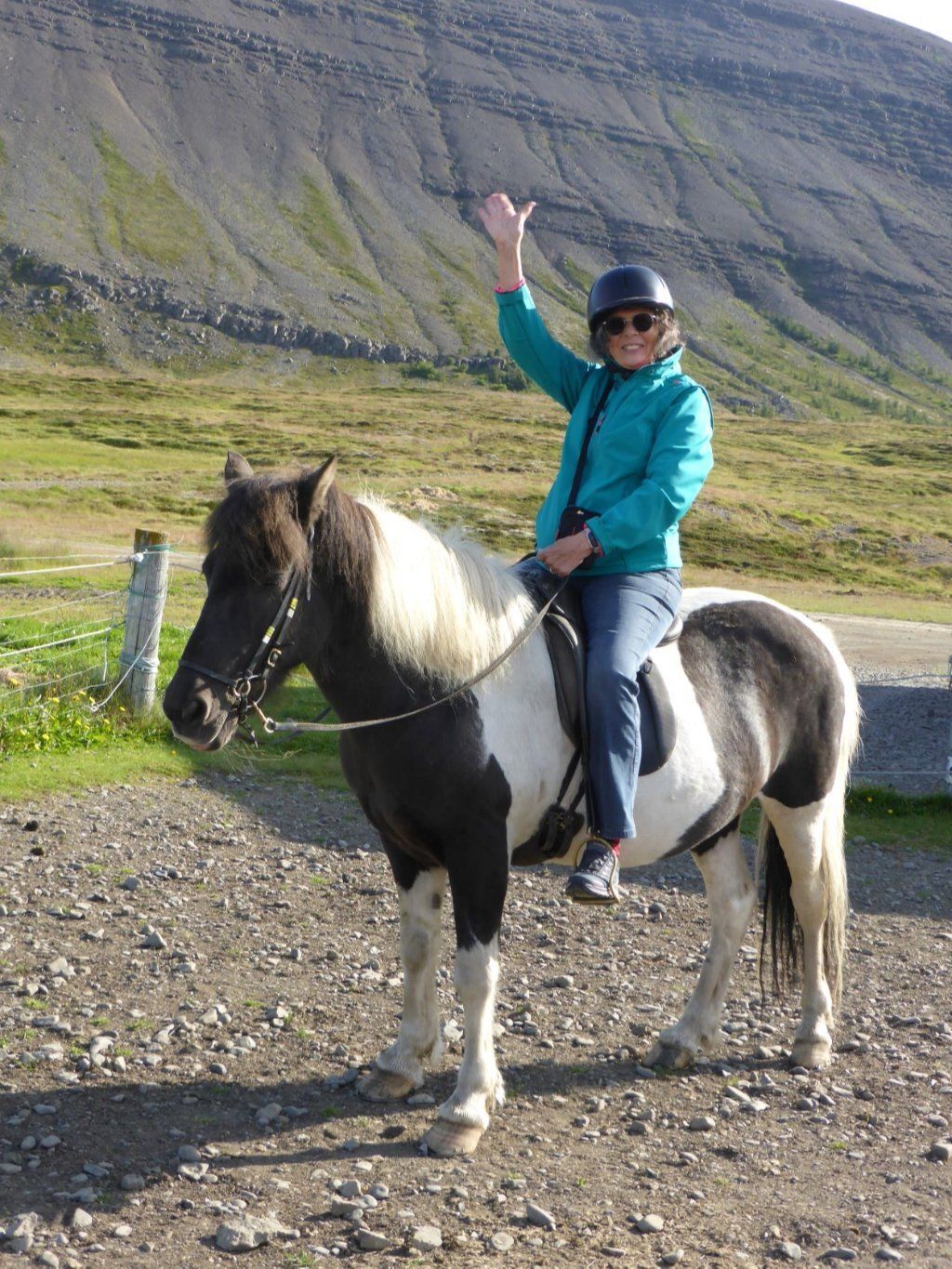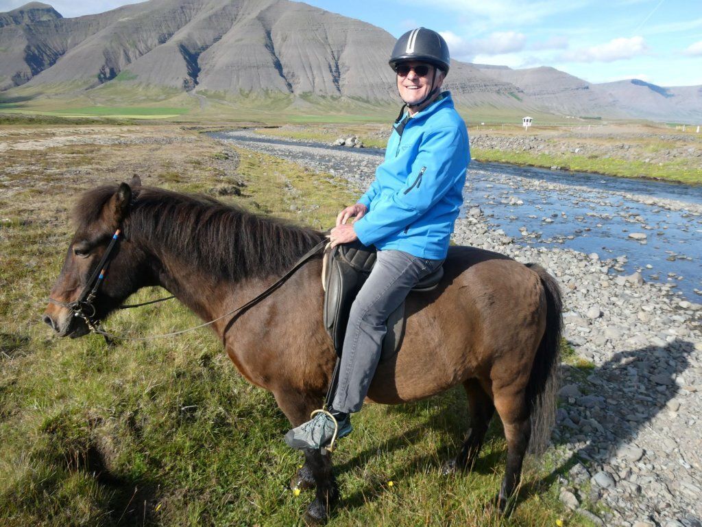 Im Café Simbahöllin des Ortes werden auch Reittouren angeboten und ich möchte doch einmal auf einem Islandpferd reiten. Also buchen wir eine kleine Tour bei Sanda River Riding. Sophie führt uns auf der alten Stute Kna und dem erfahrenen Hengst Garpur durch die Gegend. Kurze Zeit tölten wir sogar. Tölt ist ein Schritt der Islandpferde, viel schneller als Schritt. Es ist eine tolle Tour durch eine fantastische Landschaft. Der Abschluss ist eine belgische Waffel mit Rhabarberkonfi und Rahm. Sooo fein. Nach dem Hotpot mit Gesprächen über den Klimawandel in Island haben wir auch keinen Muskelkater.