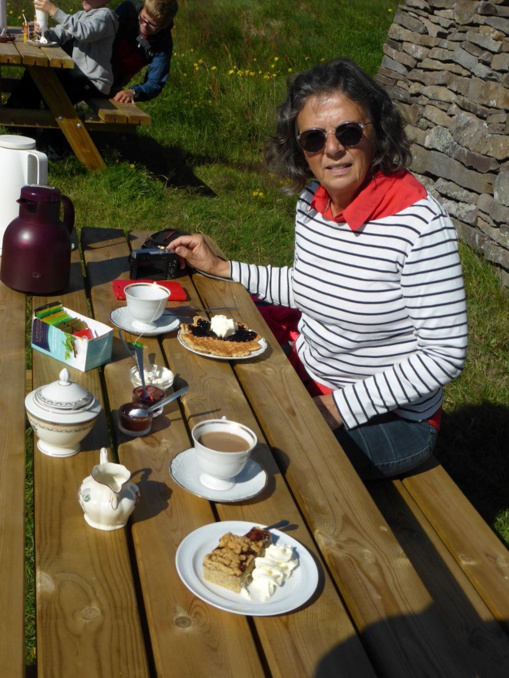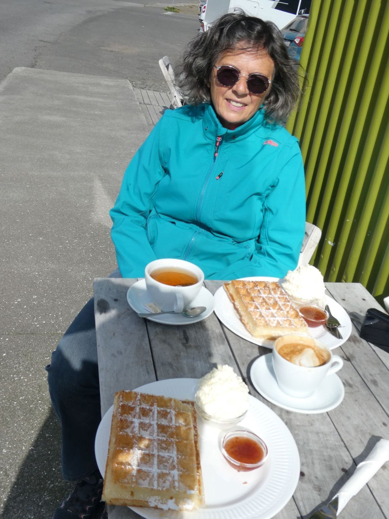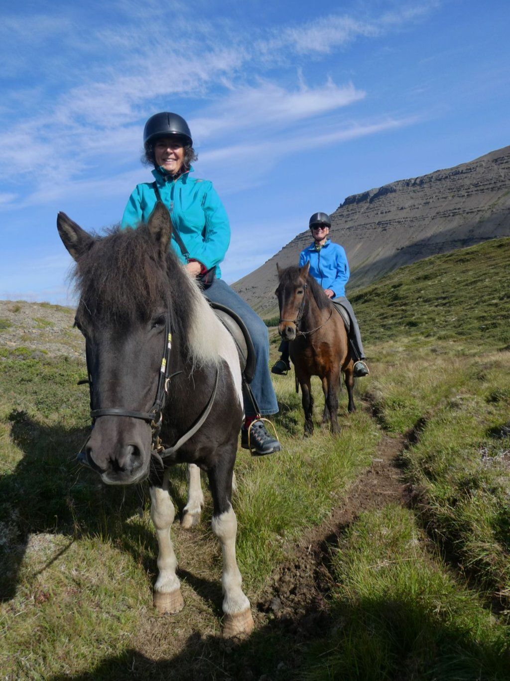 Im Café Simbahöllin des Ortes werden auch Reittouren angeboten und ich möchte doch einmal auf einem Islandpferd reiten. Also buchen wir eine kleine Tour bei Sanda River Riding. Sophie führt uns auf der alten Stute Kna und dem erfahrenen Hengst Garpur durch die Gegend. Kurze Zeit tölten wir sogar. Tölt ist ein Schritt der Islandpferde, viel schneller als Schritt. Es ist eine tolle Tour durch eine fantastische Landschaft. Der Abschluss ist eine belgische Waffel mit Rhabarberkonfi und Rahm. Sooo fein. Nach dem Hotpot mit Gesprächen über den Klimawandel in Island haben wir auch keinen Muskelkater.