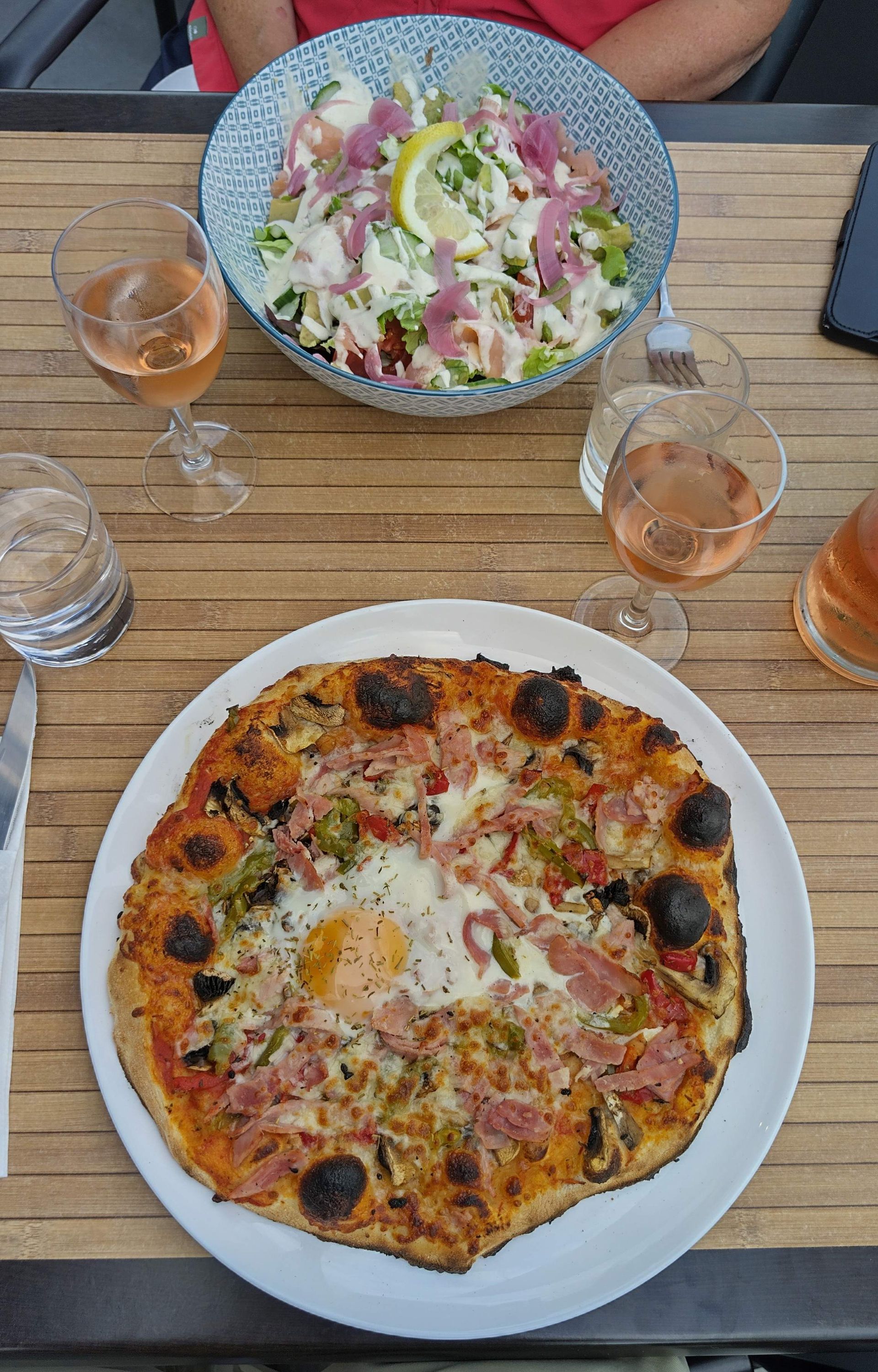 Wir kommen in einen Touristenhotspot. Durch die einzige Gasse schieben sich die Leute regelrecht. Wir gehen auch kleinere Gassen ab, sparen aber das Kloster für den nächsten Tag. Nach einem aussichtsreichen Apero fahren wir mit dem Bus zurück und essen dort Pizza. Es ist sehr heiss und wir bringen möglichst viel Luft in und durch unsern Camper.